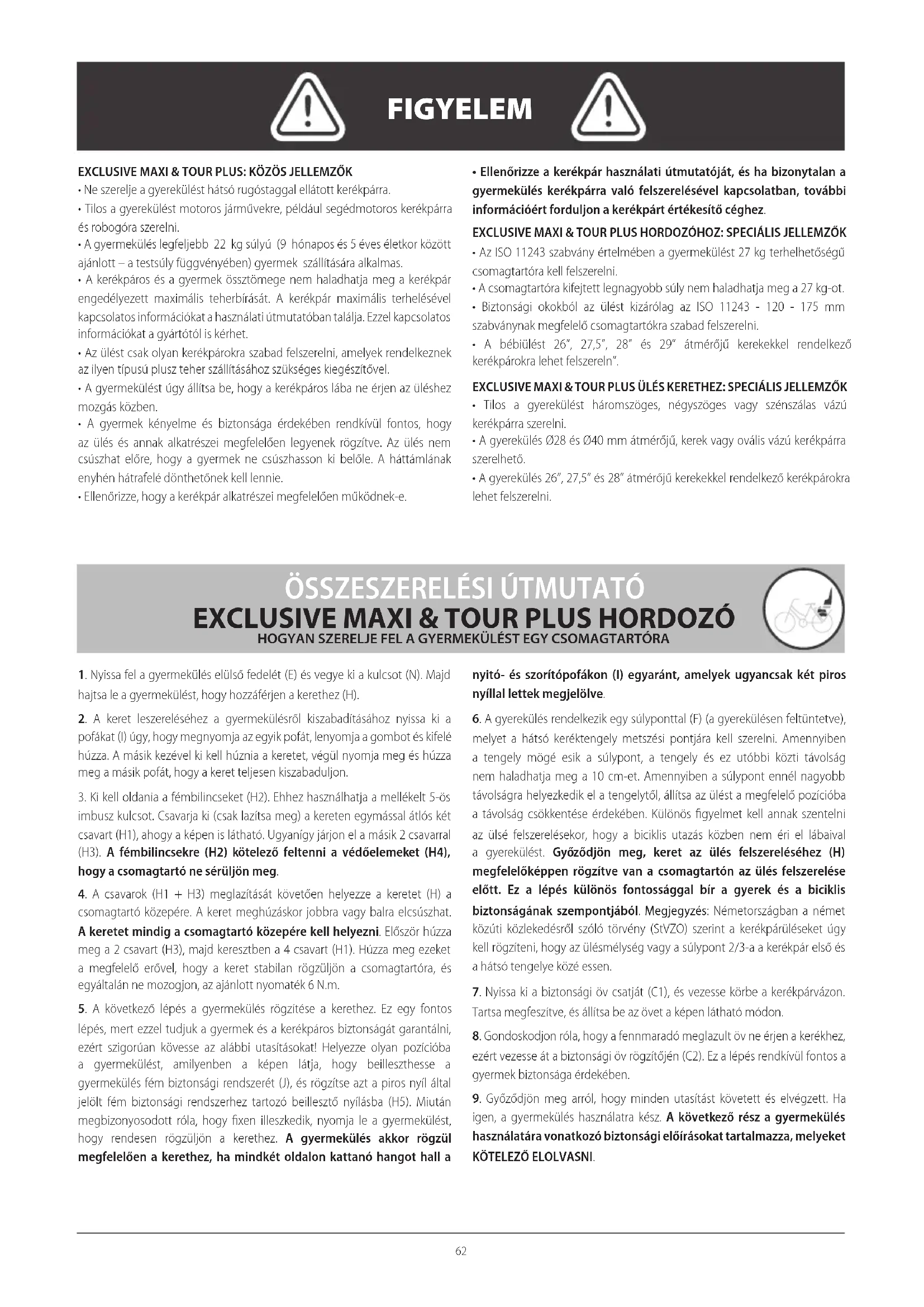 - Ellenőrizze a kerékpár használati útmutatóját, és ha bizonytalan a gyermekülés kerékpárra való felszerelésével kapcsolatban, további információért forduljon a kerékpárt értékesítő céghez. EXCLUSIVE MAXI & TOUR PLUS HORDOZÓHOZ: SPECIÁLIS JELLEMZŐK