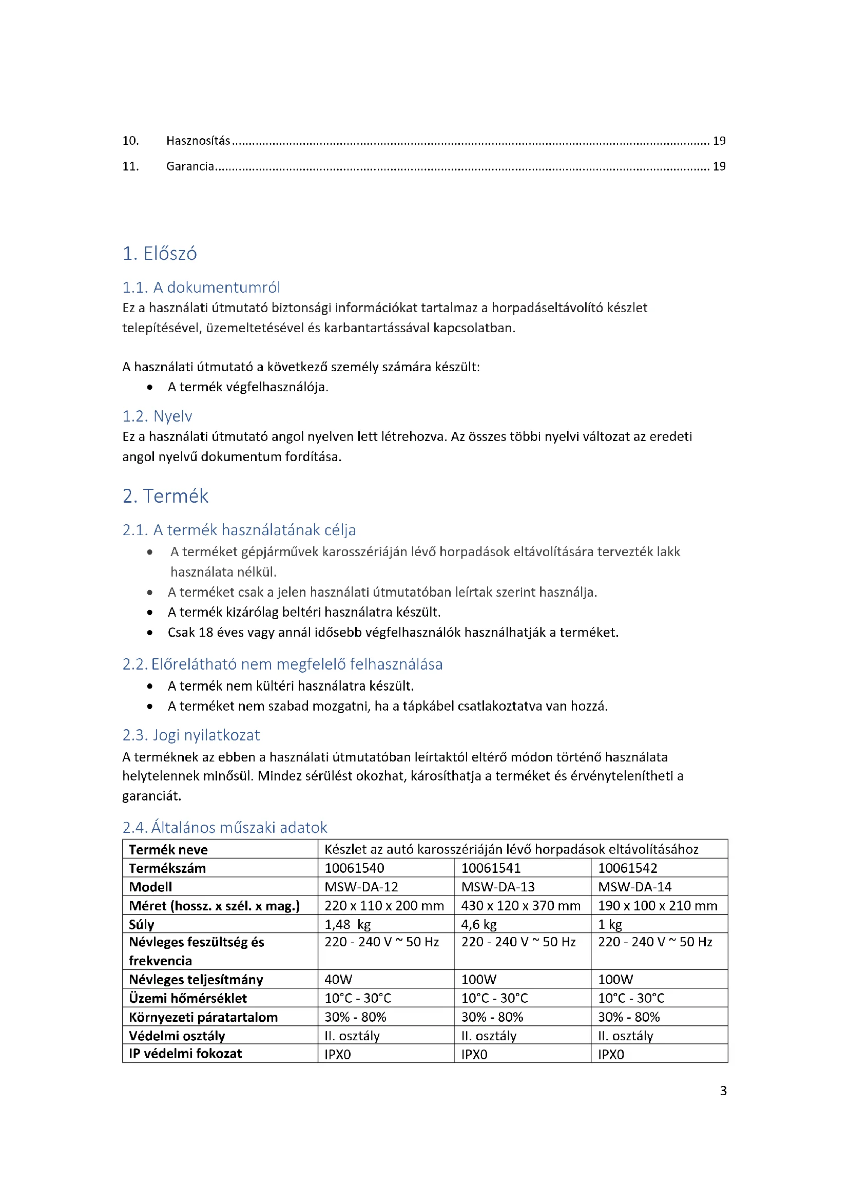 - A terméket nem szabad mozgatni, ha a tápkábel csatlakoztatva van hozzá. 2.3. Jogi nyilatkozat A terméknek az ebben a használati útmutatóban leírtaktól eltérő módon történő használata helytelennek minősül. Mindez sérülést okozhat, károsíthatja a terméket és érvénytelenítheti a garanciát. 2.4. Általános műszaki adatok Termék neve Készlet az autó karosszériáján lévő horpadások eltávolításához Termékszám