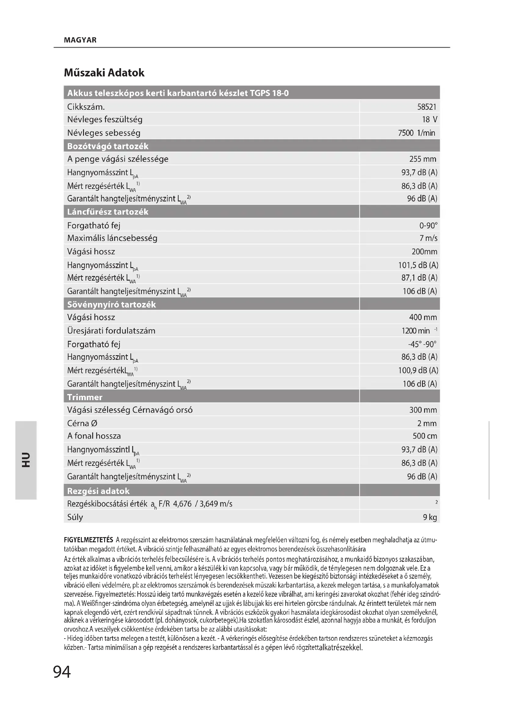93,7 dB (A) Mért rezgésérték L