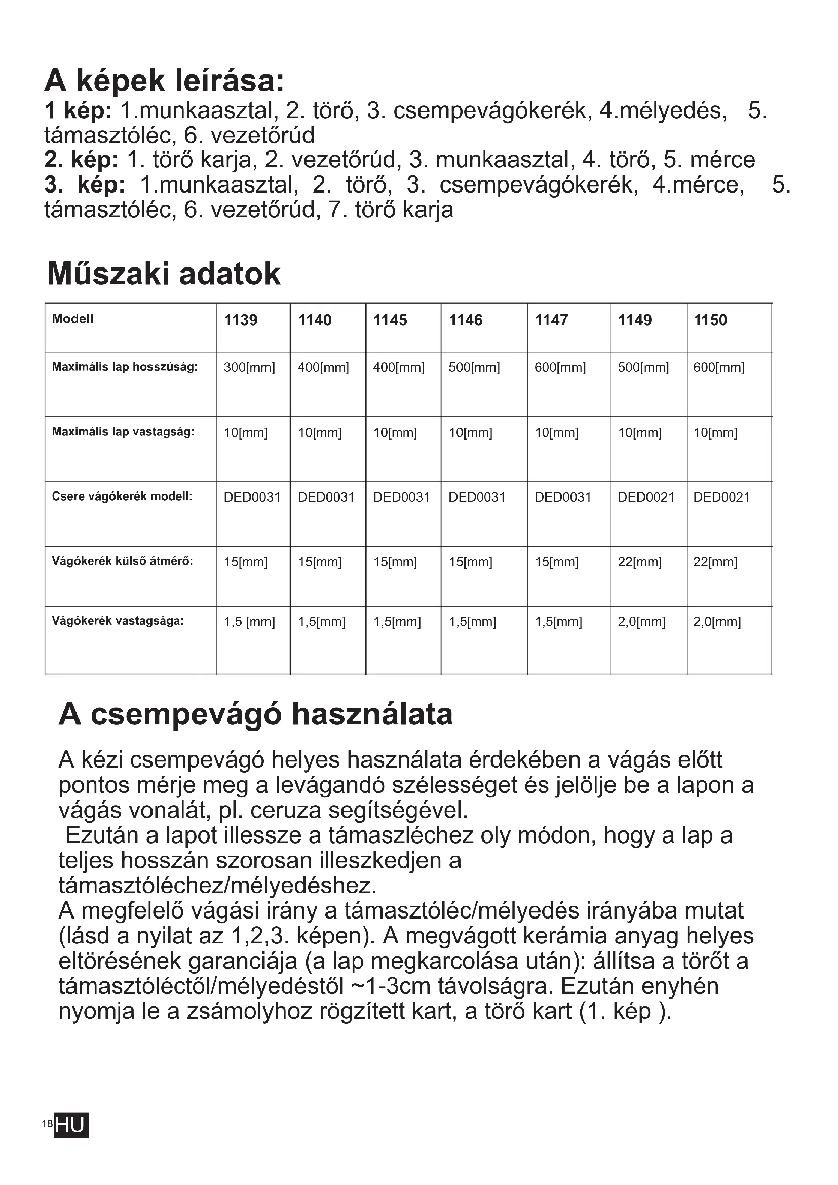 Maximális lap hosszúság: 300[mm] 400[mm] 400[mm] 500[mm] 600[mm] 500[mm] 600[mm] Maximális lap vastagság: 10[mm] 10[mm] 10[mm] 10[mm] 10[mm] 10[mm] 10[mm] Csere vágókerék modell: DED0031 DED0031 DED0031 DED0031 DED0031 DED0021 DED0021 Vágókerék külső átmérő: 15[mm] 15[mm] 15[mm] 15[mm] 15[mm] 22[mm] 22[mm] Vágókerék vastagsága: 1,5 [mm] 1,5[mm] 1,5[mm] 1,5[mm] 1,5[mm] 2,0[mm] 2,0[mm] A csempevágó használata A kézi csempevágó helyes használata érdekében a vágás előtt pontos mérje meg a levágandó szélességet és jelölje be a lapon a vágás vonalát, pl. ceruza segítségével. Ezután a lapot illessze a támaszléchez oly módon, hogy a lap a teljes hosszán szorosan illeszkedjen a támasztóléchez/mélyedéshez. A megfelelő vágási irány a támasztóléc/mélyedés irányába mutat (lásd a nyilat az 1,2,3. képen). A megvágott kerámia anyag helyes eltörésének garanciája (a lap megkarcolása után): állítsa a törőt a támasztóléctől/mélyedéstől ~1-3cm távolságra. Ezután enyhén nyomja le a zsámolyhoz rögzített kart, a törő kart (1. kép ). HU19 DEDRA EXIM Sp. z o.o. 05-800 Pruszków ul. 3 Maja 8 tel: (+48 / 22) 73-83-777fax: (+48 / 22) 73-83-779 http: //www . dedra .ple-mail: info@dedra.pl Garanciajegy Az eladó pecsétjeDátum és áláírás ................................................ Katalógusszám: Név: Szériaszám: ............................................. Garanciális feltételek