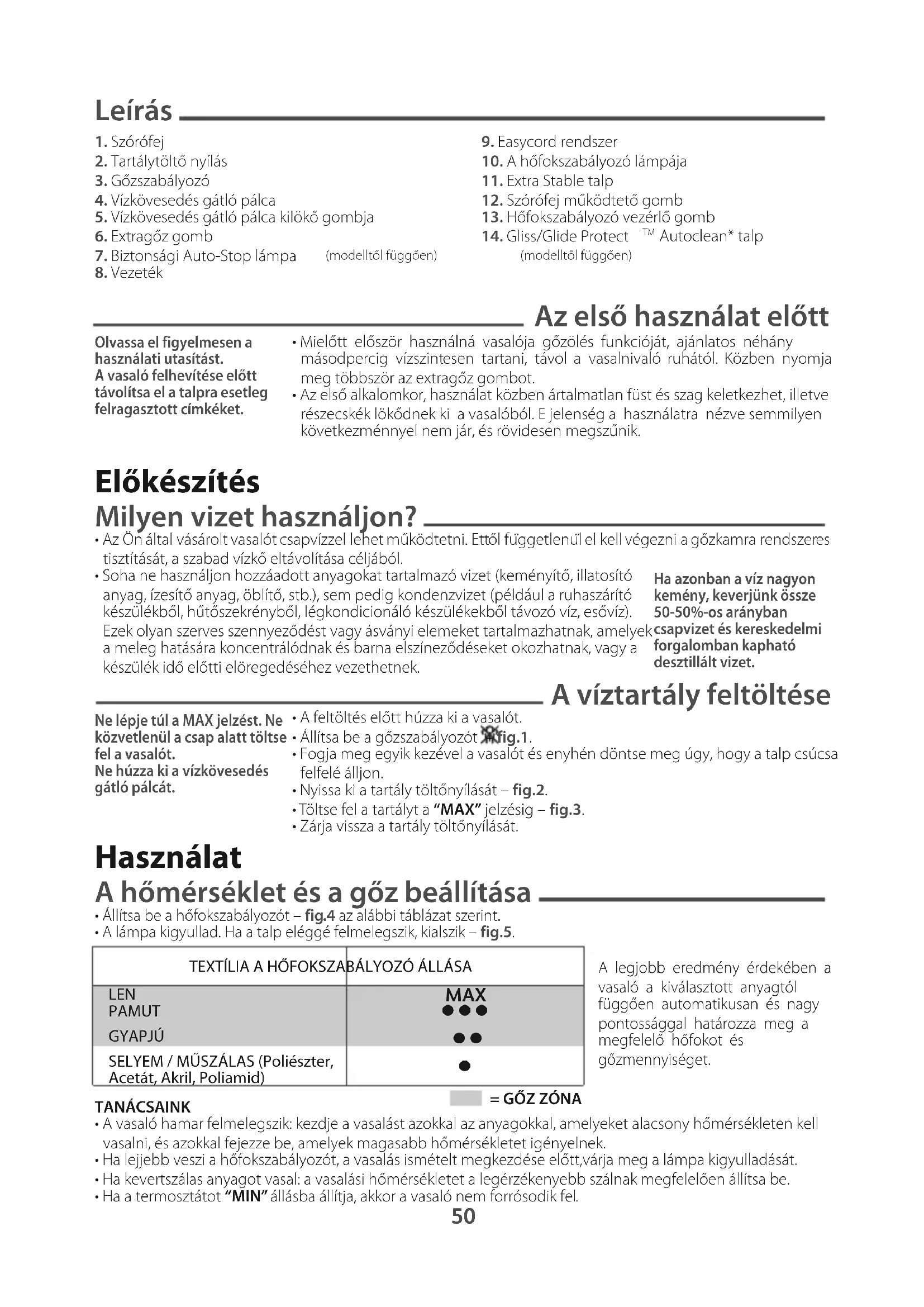 - Állítsa be a hőmérsékletet a vasalandó textília szerint.• Állítsa a gőzszabályozót az állásba – fig.1.• Amikor a lámpa elalszik, megkezdheti a vasalást. Plusz funkciók Gliss/Glide Protect