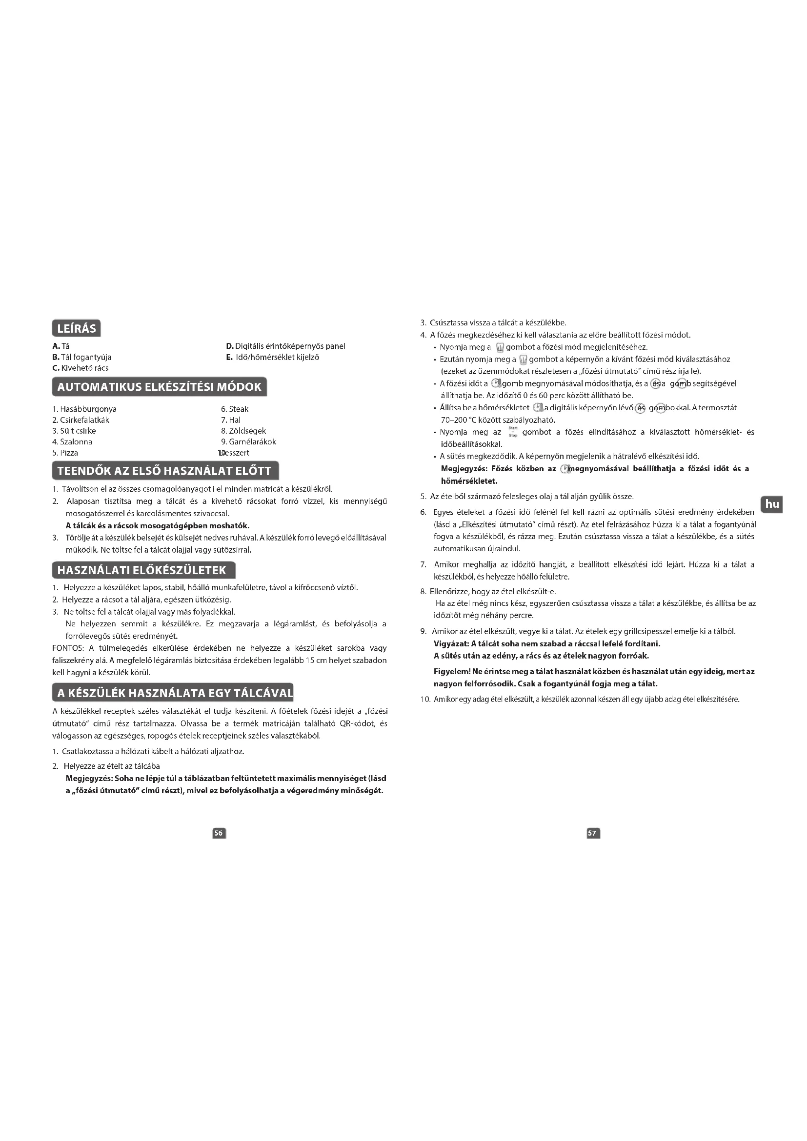 A. Tál B. Tál fogantyúja C. Kivehető rács D. Digitális érintőképernyős panel E. Idő/hőmérséklet kijelző AUTOMATIKUS ELKÉSZÍTÉSI MÓDOK