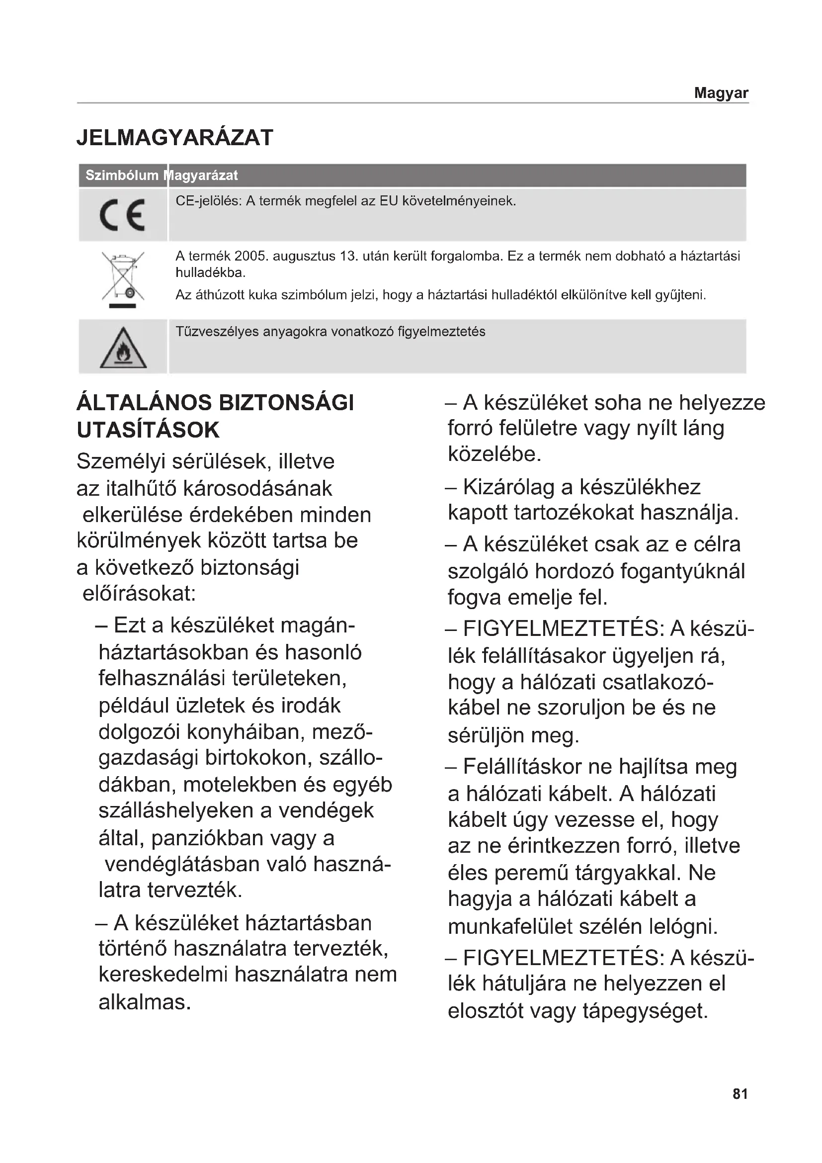 A készülék jogosult a CE jelzés használatára. Hálózati feszültség/teljesítmény- felvétel: lásd a készülék alján található típustáblát Magyar