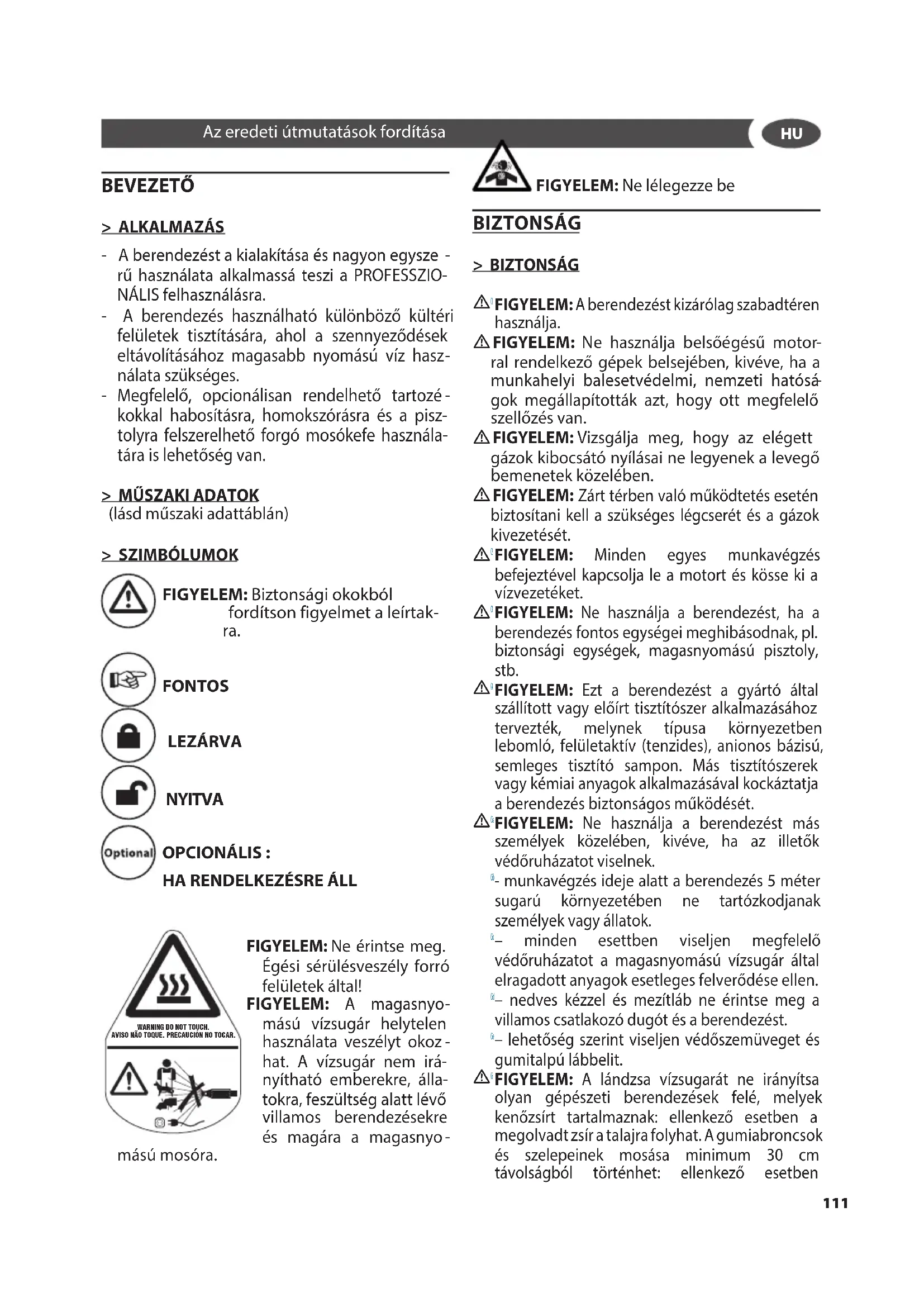 FIGYELEM: A magasnyomású vízsugár helytelen használata veszélyt okozhat. A vízsugár nem irányítható emberekre, állatokra, feszültség alatt lévő villamos berendezésekre és magára a magasnyomású mosóra.