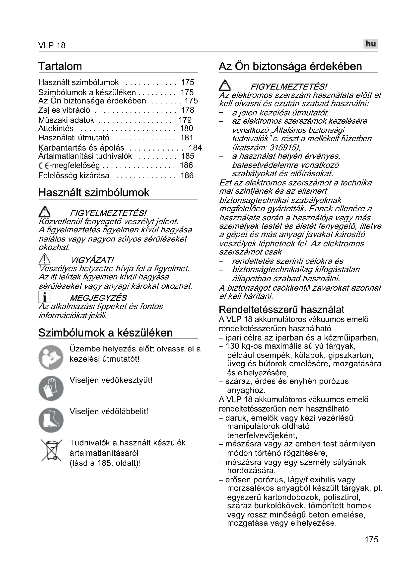 biztonságtechnikailag kifogástalan állapotban szabad használni. A biztonságot csökkentő zavarokat azonnal el kell hárítani. Rendeltetésszerű használat A VLP 18 akkumulátoros vákuumos emelő rendeltetésszerűen használható – ipari célra az iparban és a kézműiparban, – 130 kg-os maximális súlyú tárgyak, például csempék, kőlapok, gipszkarton, üveg és bútorok emelésére, mozgatására és elhelyezésére, – száraz, érdes és enyhén porózus anyaghoz. A VLP 18 akkumulátoros vákuumos emelő rendeltetésszerűen nem használható – daruk, emelők vagy kézi vezérlésű manipulátorok oldható teherfelvevőjeként, – mászásra vagy az emberi test bármilyen módon történő rögzítésére, – mászásra vagy egy személy súlyának hordozására, – erősen porózus, lágy/flexibilis vagy morzsalékos anyagból készült tárgyak, pl. egyszerű kartondobozok, polisztirol, száraz burkolókövek, tömörített homok vagy rossz minőségű beton emelése, mozgatása vagy elhelyezése.VLP 18