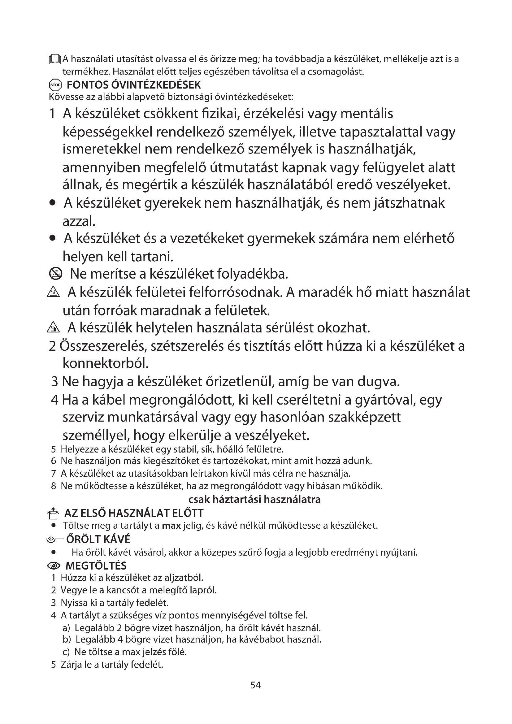 Kövesse az alábbi alapvető biztonsági óvintézkedéseket: 1 A készüléket csökkent fizikai, érzékelési vagy mentális képességekkel rendelkező személyek, illetve tapasztalattal vagy ismeretekkel nem rendelkező személyek is használhatják, amennyiben megfelelő útmutatást kapnak vagy felügyelet alatt állnak, és megértik a készülék használatából eredő veszélyeket.