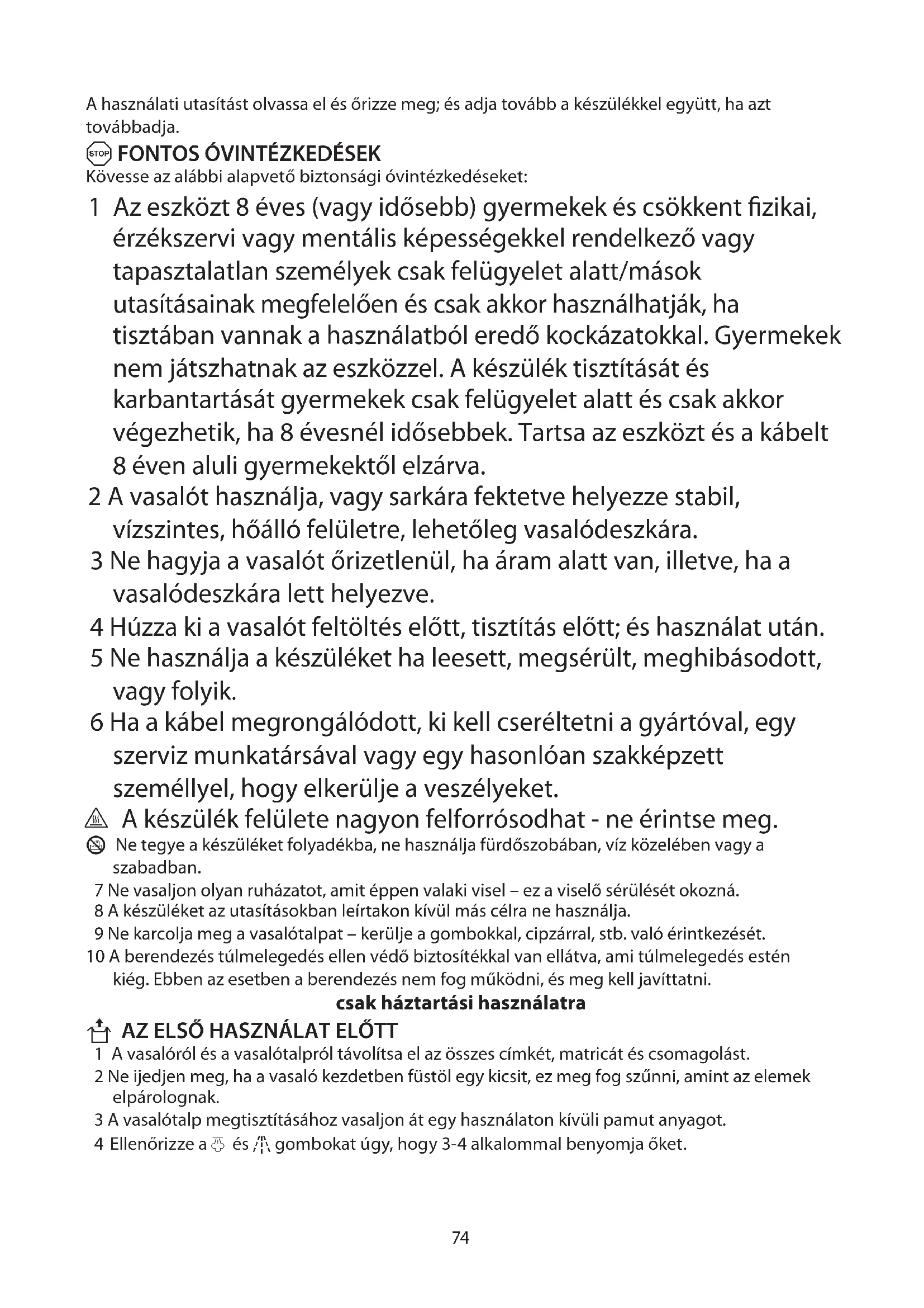Kövesse az alábbi alapvető biztonsági óvintézkedéseket: 1 Az eszközt 8 éves (vagy idősebb) gyermekek és csökkent fizikai, érzékszervi vagy mentális képességekkel rendelkező vagy tapasztalatlan személyek csak felügyelet alatt/mások utasításainak megfelelően és csak akkor használhatják, ha tisztában vannak a használatból eredő kockázatokkal. Gyermekek nem játszhatnak az eszközzel. A készülék tisztítását és karbantartását gyermekek csak felügyelet alatt és csak akkor végezhetik, ha 8 évesnél idősebbek. Tartsa az eszközt és a kábelt 8 éven aluli gyermekektől elzárva. 2 A vasalót használja, vagy sarkára fektetve helyezze stabil, vízszintes, hőálló felületre, lehetőleg vasalódeszkára. 3 Ne hagyja a vasalót őrizetlenül, ha áram alatt van, illetve, ha a vasalódeszkára lett helyezve. 4 Húzza ki a vasalót feltöltés előtt, tisztítás előtt; és használat után. 5 Ne használja a készüléket ha leesett, megsérült, meghibásodott, vagy folyik. 6 Ha a kábel megrongálódott, ki kell cseréltetni a gyártóval, egy szerviz munkatársával vagy egy hasonlóan szakképzett személlyel, hogy elkerülje a veszélyeket. ¬ A készülék felülete nagyon felforrósodhat - ne érintse meg. H Ne tegye a készüléket folyadékba, ne használja fürdőszobában, víz közelében vagy a szabadban. 7 Ne vasaljon olyan ruházatot, amit éppen valaki visel – ez a viselő sérülését okozná. 8 A készüléket az utasításokban leírtakon kívül más célra ne használja. 9 Ne karcolja meg a vasalótalpat – kerülje a gombokkal, cipzárral, stb. való érintkezését. 10 A berendezés túlmelegedés ellen védő biztosítékkal van ellátva, ami túlmelegedés estén kiég. Ebben az esetben a berendezés nem fog működni, és meg kell javíttatni. csak háztartási használatra U AZ ELSŐ HASZNÁLAT ELŐTT 1 A vasalóról és a vasalótalpról távolítsa el az összes címkét, matricát és csomagolást. 2 Ne ijedjen meg, ha a vasaló kezdetben füstöl egy kicsit, ez meg fog szűnni, amint az elemek elpárolognak. 3 A vasalótalp megtisztításához vasaljon át egy használaton kívüli pamut anyagot. 4 Ellenőrizze a S és * gombokat úgy, hogy 3-4 alkalommal benyomja őket.75 utasítások