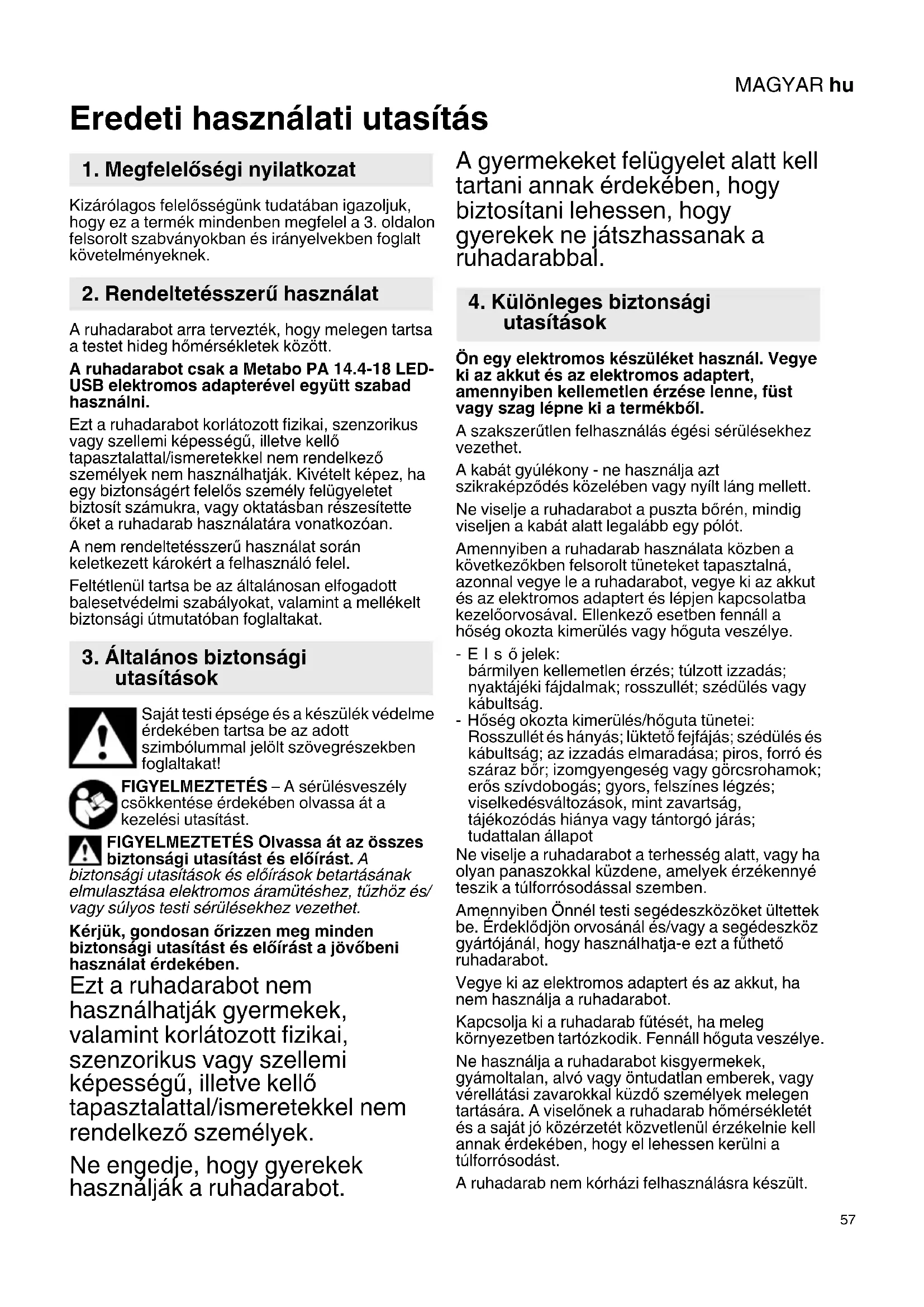 Eredeti használati utasítás Kizárólagos felelősségünk tudatában igazoljuk, hogy ez a termék mindenben megfelel a 3. oldalon felsorolt szabványokban és irányelvekben foglalt követelményeknek. A ruhadarabot arra tervezték, hogy melegen tartsa a testet hideg hőmérsékletek között. A ruhadarabot csak a Metabo PA 14.4-18 LED- USB elektromos adapterével együtt szabad használni. Ezt a ruhadarabot korlátozott fizikai, szenzorikus vagy szellemi képességű, illetve kellő tapasztalattal/ismeretekkel nem rendelkező személyek nem használhatják. Kivételt képez, ha egy biztonságért felelős személy felügyeletet biztosít számukra, vagy oktatásban részesítette őket a ruhadarab használatára vonatkozóan. A nem rendeltetésszerű használat során keletkezett károkért a felhasználó felel. Feltétlenül tartsa be az általánosan elfogadott balesetvédelmi szabályokat, valamint a mellékelt biztonsági útmutatóban foglaltakat. Saját testi épsége és a készülék védelme érdekében tartsa be az adott szimbólummal jelölt szövegrészekben foglaltakat! FIGYELMEZTETÉS – A sérülésveszély csökkentése érdekében olvassa át a kezelési utasítást. FIGYELMEZTETÉS Olvassa át az összes biztonsági utasítást és előírást. A biztonsági utasítások és előírások betartásának elmulasztása elektromos áramütéshez, tűzhöz és/ vagy súlyos testi sérülésekhez vezethet. Kérjük, gondosan őrizzen meg minden biztonsági utasítást és előírást a jövőbeni használat érdekében. Ezt a ruhadarabot nem használhatják gyermekek, valamint korlátozott fizikai, szenzorikus vagy szellemi képességű, illetve kellő tapasztalattal/ismeretekkel nem rendelkező személyek. Ne engedje, hogy gyerekek használják a ruhadarabot. A gyermekeket felügyelet alatt kell tartani annak érdekében, hogy biztosítani lehessen, hogy gyerekek ne játszhassanak a ruhadarabbal. Ön egy elektromos készüléket használ. Vegye ki az akkut és az elektromos adaptert, amennyiben kellemetlen érzése lenne, füst vagy szag lépne ki a termékből. A szakszerűtlen felhasználás égési sérülésekhez vezethet. A kabát gyúlékony - ne használja azt szikraképződés közelében vagy nyílt láng mellett. Ne viselje a ruhadarabot a puszta bőrén, mindig viseljen a kabát alatt legalább egy pólót. Amennyiben a ruhadarab használata közben a következőkben felsorolt tüneteket tapasztalná, azonnal vegye le a ruhadarabot, vegye ki az akkut és az elektromos adaptert és lépjen kapcsolatba kezelőorvosával. Ellenkező esetben fennáll a hőség okozta kimerülés vagy hőguta veszélye. -Első jelek: bármilyen kellemetlen érzés; túlzott izzadás; nyaktájéki fájdalmak; rosszullét; szédülés vagy kábultság. -Hőség okozta kimerülés/hőguta tünetei: Rosszullét és hányás; lüktető fejfájás; szédülés és kábultság; az izzadás elmaradása; piros, forró és száraz bőr; izomgyengeség vagy görcsrohamok; erős szívdobogás; gyors, felszínes légzés; viselkedésváltozások, mint zavartság, tájékozódás hiánya vagy tántorgó járás; tudattalan állapot Ne viselje a ruhadarabot a terhesség alatt, vagy ha olyan panaszokkal küzdene, amelyek érzékennyé teszik a túlforrósodással szemben. Amennyiben Önnél testi segédeszközöket ültettek be. Érdeklődjön orvosánál és/vagy a segédeszköz gyártójánál, hogy használhatja-e ezt a fűthető ruhadarabot. Vegye ki az elektromos adaptert és az akkut, ha nem használja a ruhadarabot. Kapcsolja ki a ruhadarab fűtését, ha meleg környezetben tartózkodik. Fennáll hőguta veszélye. Ne használja a ruhadarabot kisgyermekek, gyámoltalan, alvó vagy öntudatlan emberek, vagy vérellátási zavarokkal küzdő személyek melegen tartására. A viselőnek a ruhadarab hőmérsékletét és a saját jó közérzetét közvetlenül érzékelnie kell annak érdekében, hogy el lehessen kerülni a túlforrósodást. A ruhadarab nem kórházi felhasználásra készült.