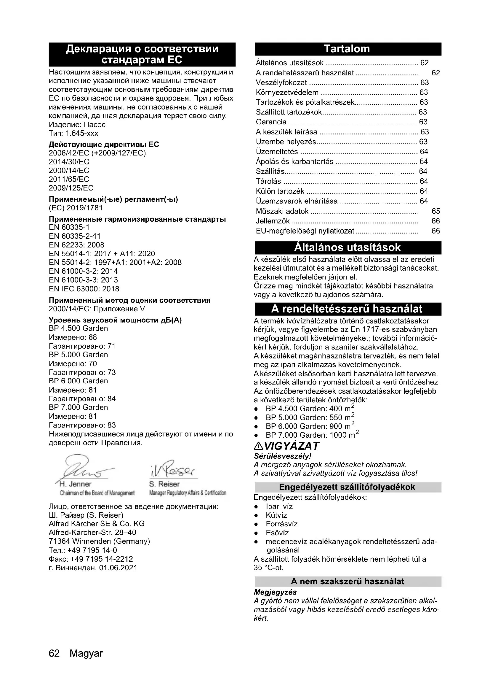 гарантированный dB(A)71738483 Размеры и вес Вес (без принадлежностей) kg 6,4 7,0 9,7 10,062 Magyar Декларация о соответствии стандартам ЕС Настоящим заявляем, что концепция, конструкция и исполнение указанной ниже машины отвечают соответствующим основным требованиям директив ЕС по безопасности и охране здоровья. При любых изменениях машины, не согласованных с нашей компанией, данная декларация теряет свою силу. Изделие: Насос Тип: 1.645-xxx Действующие директивы ЕС 2006/42/ЕС (+2009/127/ЕС) 2014/30/EС 2000/14/ЕС 2011/65/EС 2009/125/ЕС Применяемый(-ые) регламент(-ы) (ЕС) 2019/1781 Примененные гармонизированные стандарты EN 60335-1 EN 60335-2-41 EN 62233: 2008 EN 55014-1: 2017 + A11: 2020 EN 55014-2: 1997+A1: 2001+A2: 2008 EN 61000-3-2: 2014 EN 61000-3-3: 2013 EN IEC 63000: 2018 Примененный метод оценки соответствия 2000/14/ЕС: Приложение V Уровень звуковой мощности дБ(A) BP 4.500 Garden Измерено: 68 Гарантировано: 71 BP 5.000 Garden Измерено: 70 Гарантировано: 73 BP 6.000 Garden Измерено: 81 Гарантировано: 84 BP 7.000 Garden Измерено: 81 Гарантировано: 83 Нижеподписавшиеся лица действуют от имени и по доверенности Правления. Лицо, ответственное за ведение документации: Ш. Райзер (S. Reiser) Alfred Kärcher SE & Co. KG Alfred-Kärcher-Str. 28–40 71364 Winnenden (Germany) Тел.: +49 7195 14-0 Факс: +49 7195 14-2212 г. Винненден, 01.06.2021 Tartalom Általános utasítások A készülék első használata előtt olvassa el az eredeti kezelési útmutatót és a mellékelt biztonsági tanácsokat. Ezeknek megfelelően járjon el. Őrizze meg mindkét tájékoztatót későbbi használatra vagy a következő tulajdonos számára. A rendeltetésszerű használat A termék ivóvízhálózatra történő csatlakoztatásakor kérjük, vegye figyelembe az En 1717-es szabványban megfogalmazott követelményeket; további információ- kért kérjük, forduljon a szaniter szakvállalatához. A készüléket magánhasználatra tervezték, és nem felel meg az ipari alkalmazás követelményeinek. A készüléket elsősorban kerti használatra lett tervezve, a készülék állandó nyomást biztosít a kerti öntözéshez. Az öntözőberendezések csatlakoztatásakor legfeljebb a következő területek öntözhetők: ● BP 4.500 Garden: 400 m