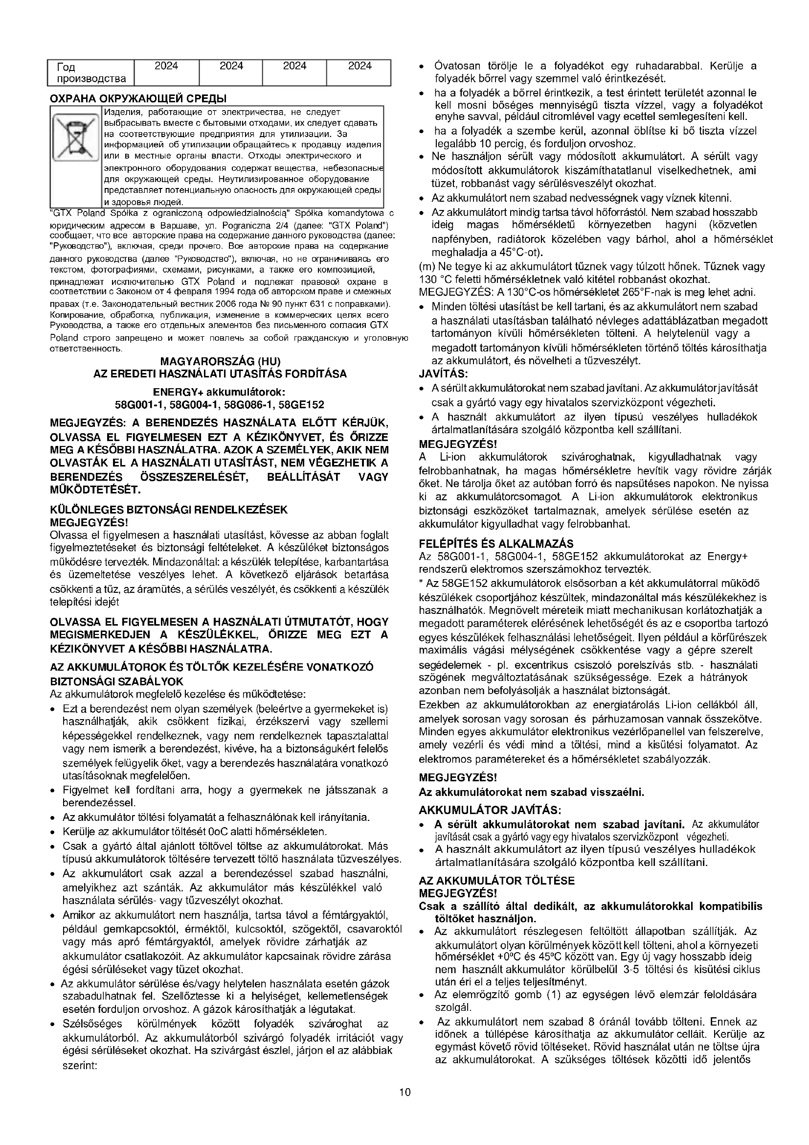- Az 58GE152 akkumulátorok elsősorban a két akkumulátorral működő készülékek csoportjához készültek, mindazonáltal más készülékekhez is használhatók. Megnövelt méreteik miatt mechanikusan korlátozhatják a megadott paraméterek elérésének lehetőségét és az e csoportba tartozó egyes készülékek felhasználási lehetőségeit. Ilyen például a körfűrészek maximális vágási mélységének csökkentése vagy a gépre szerelt segédelemek - pl. excentrikus csiszoló porelszívás stb. - használati szögének megváltoztatásának szükségessége. Ezek a hátrányok azonban nem befolyásolják a használat biztonságát. Ezekben az akkumulátorokban az energiatárolás Li-ion cellákból áll, amelyek sorosan vagy sorosan és párhuzamosan vannak összekötve. Minden egyes akkumulátor elektronikus vezérlőpanellel van felszerelve, amely vezérli és védi mind a töltési, mind a kisütési folyamatot. Az elektromos paramétereket és a hőmérsékletet szabályozzák. MEGJEGYZÉS! Az akkumulátorokat nem szabad visszaélni. AKKUMULÁTOR JAVÍTÁS: