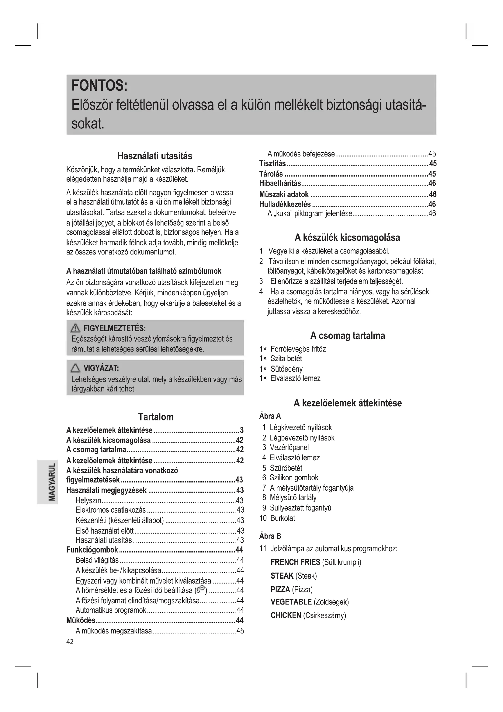 észlelhetők, ne működtesse a készüléket. Azonnal juttassa vissza a kereskedőhöz. A csomag tartalma 1× Forrólevegős fritőz 1× Szita betét 1× Sütőedény 1× Elválasztó lemez A kezelőelemek áttekintése Ábra A 1 Légkivezető nyílások 2 Légbevezető nyílások 3 Vezérlőpanel 4 Elválasztó lemez 5 Szűrőbetét 6 Szilikon gombok 7 A mélysütőtartály fogantyúja 8 Mélysütő tartály 9 Süllyesztett fogantyú 10 Burkolat Ábra B 11 Jelzőlámpa az automatikus programokhoz: FRENCH FRIES (Sült krumpli) STEAK (Steak) PIZZA (Pizza) VEGETABLE (Zöldségek) CHICKEN (Csirkeszárny)43 CAKE (Sütemény) BACON (Szalonna) FISH (Hal) SHRIMPS (Garnélarák) KEEP WARM (Melegen tartás) 12 A mélysütő rekeszeinek kezelőpaneljei (rekesz