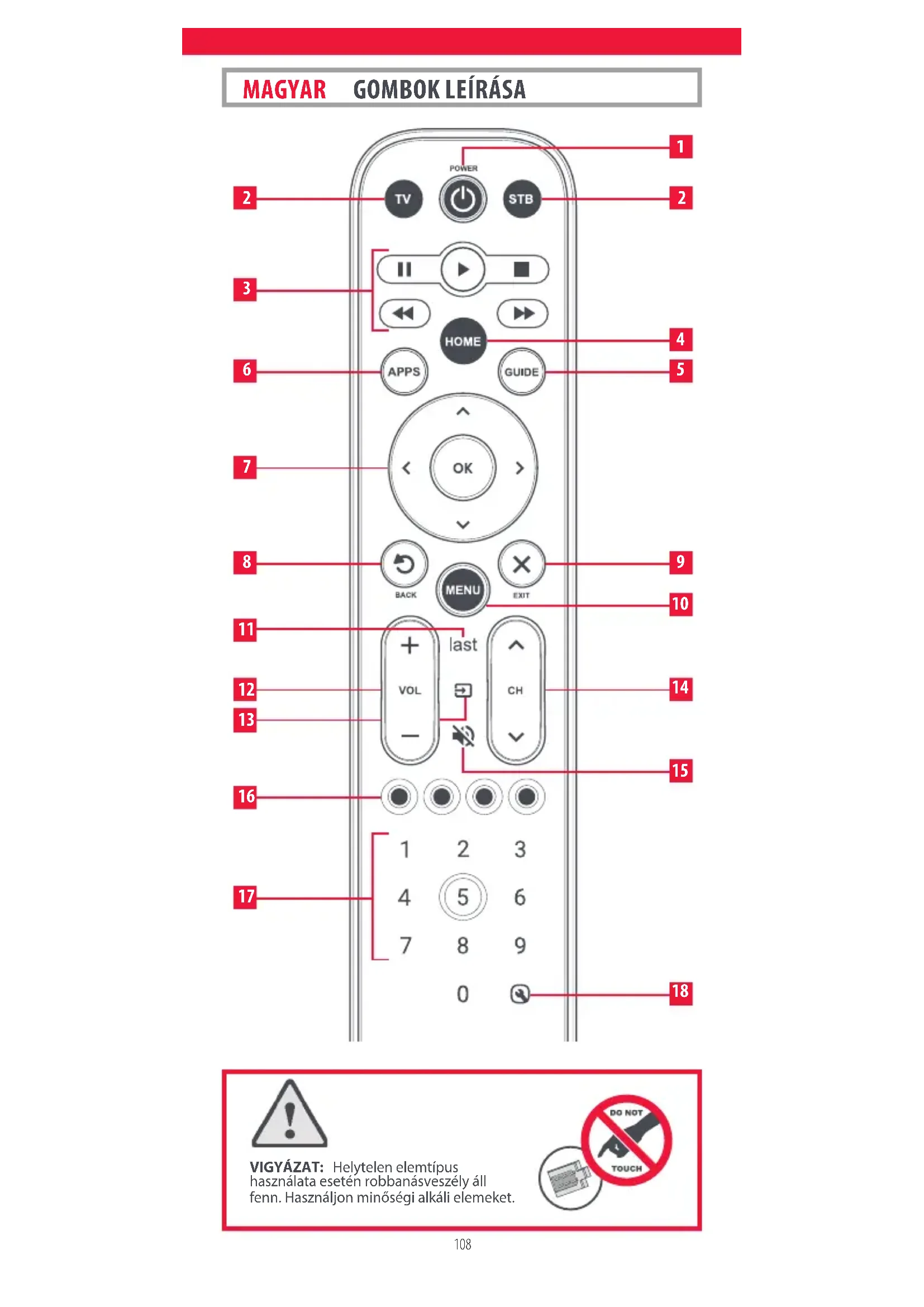 Készülékgombok Ezekkel a gombokkal választhatja ki, hogy melyik készüléket kívánja éppen vezérelni az EazyClean távirányítóval. A Tévégomb megnyomásával a tévét vezérelheti a távirányítóval. Ha egy másik készüléket szeretne vele vezérelni, egyszerűen nyomja meg a megfelelő gombot. A következő készülékek programozhatók be a gombokra: TV: Minden televíziókészülék, mint például LED, LCD, plazma, OLED stb. STB: Set-top-boxok, ideértve a műholdas, kábeles és Freeview készülékeket
