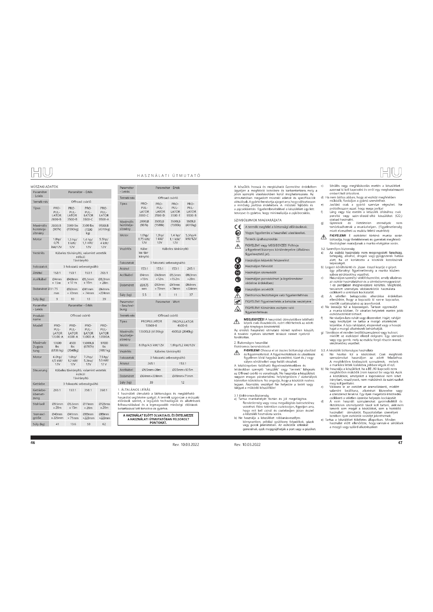 Parameter - Beschrei- bung Parameter - Wert Termék-név Oroad csörlő Típus PROPULLATOR 13500-B PROPULLATOR 4500-B Maximális húzótelje- sítmény 13500LB (6136kg) 4500LB (2040kg) Motor 6.0hp/4,5 kW/12V 1,6hp/1,2 kW/12V Vezérlés Kábeles távirányító Fokozatok 3 fokozatú sebességváltó Áttétel 265:1 153:1 Acélkábel Ø9.5mm×28m Ø5.5mm×12.5m Dobméret Ø64mm×224mm Ø41mm×71mm Súly (kg) 39 12 Paraméter - Leírás Paraméter - Érték Produkt- name Oroad csörlő Modell PRO- PUL- LATOR 13500-A PRO- PUL- LATOR 4500-A PRO- PUL- LATOR 15000-A PRO- PUL- LATOR 17000A Maximale Zugleis- tung