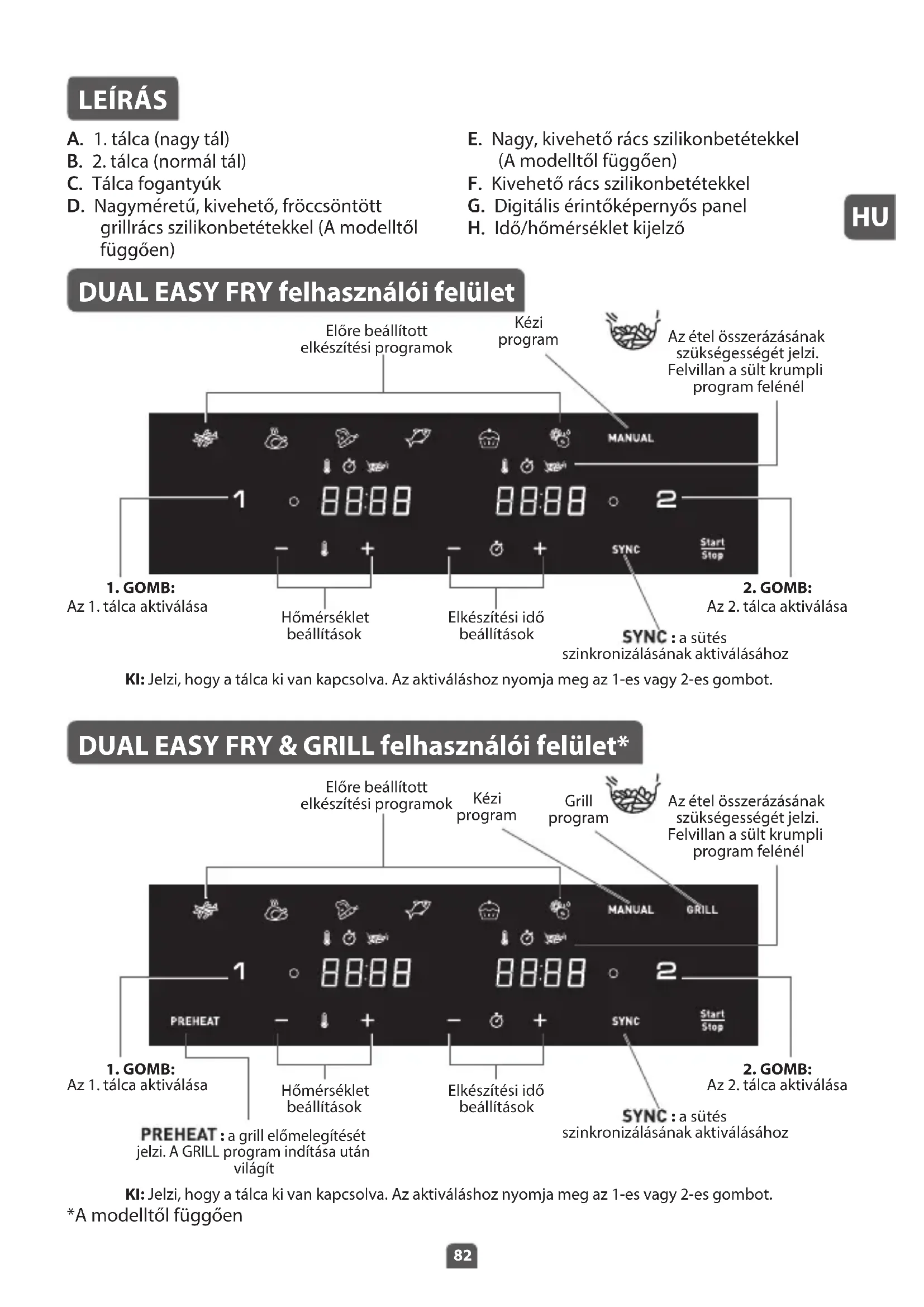 A. 1. tálca (nagy tál) B. 2. tálca (normál tál) C. Tálca fogantyúk D. Nagyméretű, kivehető, fröccsöntött grillrács szilikonbetétekkel (A modelltől függően) E. Nagy, kivehető rács szilikonbetétekkel (A modelltől függően) F. Kivehető rács szilikonbetétekkel G. Digitális érintőképernyős panel H. Idő/hőmérséklet kijelző DUAL EASY FRY felhasználói felület DUAL EASY FRY & GRILL felhasználói felület* KI: Jelzi, hogy a tálca ki van kapcsolva. Az aktiváláshoz nyomja meg az 1-es vagy 2-es gombot. KI: Jelzi, hogy a tálca ki van kapcsolva. Az aktiváláshoz nyomja meg az 1-es vagy 2-es gombot. : a grill előmelegítését jelzi. A GRILL program indítása után világít *A modelltől függően Előre beállított elkészítési programok Az étel összerázásának szükségességét jelzi. Felvillan a sült krumpli program felénél Kézi program : a sütés szinkronizálásának aktiválásához : a sütés szinkronizálásának aktiválásához Hőmérséklet beállítások Hőmérséklet beállítások Elkészítési idő beállítások Elkészítési idő beállítások
