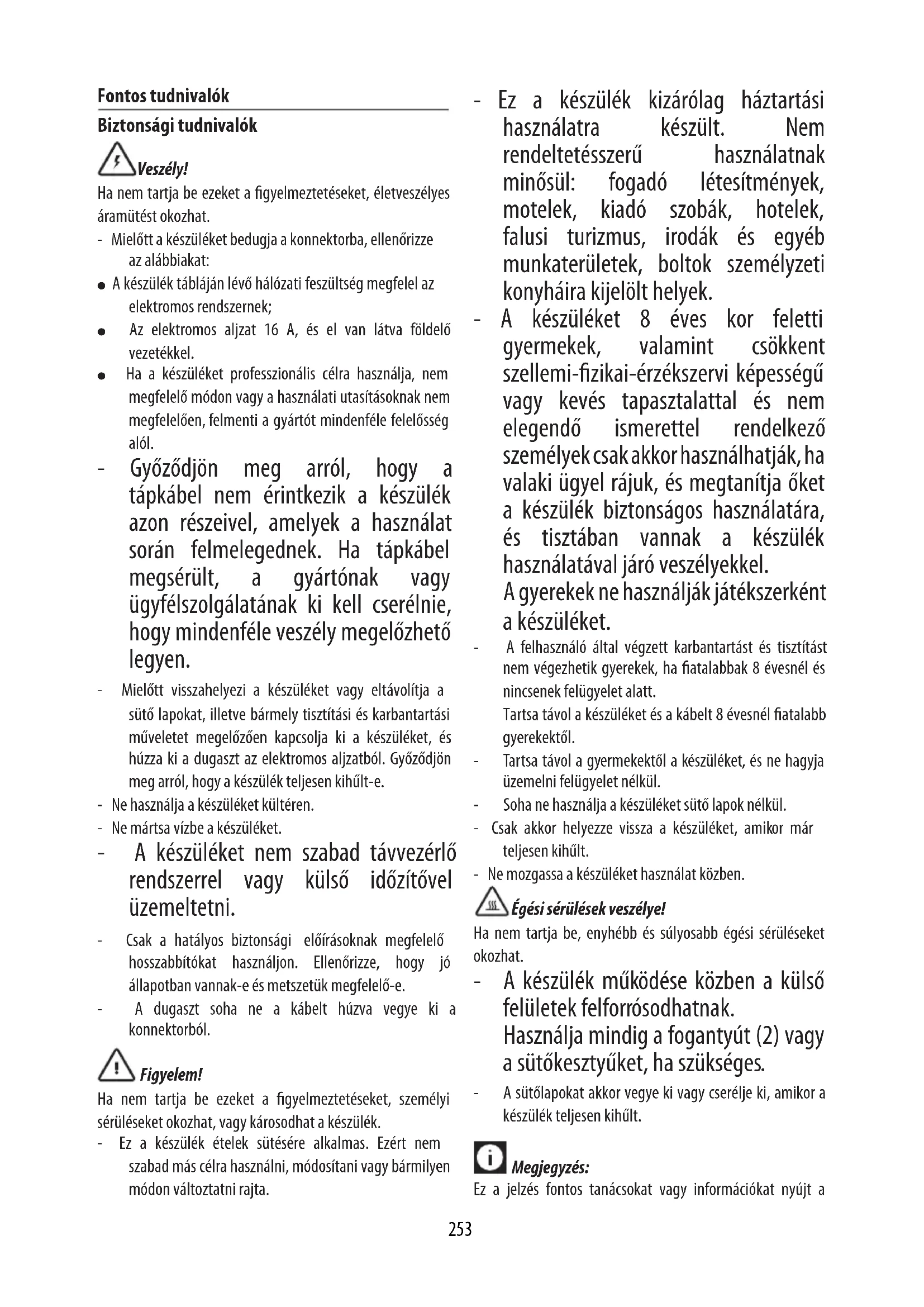 HOZZÁVALÓK: - 1 ananász - méz ízlés szerint - cukornád ízlés szerint - friss menta ízlés szerint - porcukor ízlés szerint - vaníliafagylalt ízlés szerint ELKÉSZÍTÉS: Fogja meg az ananászt, hámozza meg és vegye ki a kérges részét. Ezután vágja körülbelül 1-2 cm vastag szeletekre, és szórjon minden szeletre nádcukrot mindkét oldalára. Illessze be a bordázott lapot az alsó részbe, a sima lapot a felső részbe, és állítsa a grillt CONTACT GRILL üzemmódba. Állítsa az alsó termosztát gombját 200°-ra, a felsőt 200°-ra. Nyomja meg a START / STOP nyomógombot a grill előmelegítéséhez. Amikor a kijelző mellett READY felirat látható, kenje meg az ananász mindkét oldalát mézzel és rakja rá a grillre. Zárja le a grillt, és süsse további 5-6 percen át. Miután megsültek, rakja a szeleteket egy tálalótálra, díszítse friss mentalevelekkel, szórja meg porcukorral és tálalja fagylaltgombócokkal.270 CSAK HA RENDELKEZIK A GOFRI LAPOK KÉSZLETÉVEL KLASSZIKUS GOFRIK HOZZÁVALÓK ENNYI ADAGHOZ: 8 gofri ELKÉSZÍTÉS: 10 perc SÜTÉSI IDŐ: 10 perc HOZZÁVALÓK: - 2 csésze liszt / 460gr - 1 kiskanál só - 4 kanál élesztő / 10gr - 2 kanál fehér cukor/ 30gr - 2 tojás - 1 és 1/2 csésze langyos tej / 345ml - 75gr olvasztott vaj - 1 kiskanál vanília-kivonat ELKÉSZÍTÉS: Egy nagy tálban keverje össze a lisztet, a sót, az élesztőt és a cukrot és rakja félre. Üsse bele a tojásokat egy másik tálba, adjon hozzá tejet, vajat és vaníliát. Öntse a lisztet és a többi hozzávalót a tálba a tejjel és a tojásokkal, majd habverővel keverje össze. Melegítse elő a lapot gofrikhoz. Amikor a kijelzőn megjelenik a ready felirat, vajazza meg a lapot, vagy használjon egy tapadásgátló spray-t, majd öntsön egy kis mérőedénnyel a lap mindegyik kis formájába, használjon egy kanalat, ha szükséges; terítse szét a keveréket egy spatulával. Addig süsse a gofrit, amíg aranyszínű és ropogós nem lesz (5 perc). Folytassa addig, amíg el nem fogy a tészta. Azonnal szolgálja fel. BELGA GOFRI HOZZÁVALÓK ENNYI ADAGHOZ: 10-12 gofri ELKÉSZÍTÉS: 15 perc SÜTÉSI IDŐ: 15 perc HOZZÁVALÓK: - 2 csésze liszt tortához / 460gr - 1/2 kiskanál só - 2 kanál élesztő / 5gr - 2 kanál fehér cukor/ 30gr - 4 tojás - 2 csésze langyos tej / 460gr - 70gr olvasztott vaj - 1/2 kiskanál vanília-kivonat ELKÉSZÍTÉS: Egy nagy tálban keverje össze a lisztet, a sót, az élesztőt és rakja félre. Egy másik tálba üsse bele a tojássárgáját a cukorral, amíg habos krémet nem kap. Adja hozzá a vanília-kivonatot, az olvasztott vajat, a tojásos tejet, majd keverje meg egy habverővel. Öntse egybe a két tál tartalmát, és keverje össze a habverővel. Ne keverje meg túlságosan. Egy harmadik tálban verje fel a tojásfehérjét kemény habbá elektromos habverővel 1-2 percen át. A gumi spatulával keverje bele a habot a gofri tésztába. Ne keverje meg túlságosan. Melegítse elő a lapot gofrikhoz. Amikor a kijelzőn megjelenik a ready felirat, vajazza meg a lapot, vagy használjon egy tapadásgátló spray-t, majd öntsön egy kis mérőedénnyel a lap mindegyik kis formájába, használjon egy kanalat, ha szükséges; terítse szét a keveréket egy spatulával. Addig süsse a gofrit, amíg aranyszínű és ropogós nem lesz (5 perc). Folytassa addig, amíg el nem fogy a tészta. Azonnal szolgálja fel. CSOKOLÁDÉS GOFRIK ÉS FAHÉJ HOZZÁVALÓK ENNYI ADAGHOZ: 8-10 gofri ELKÉSZÍTÉS: 10 perc SÜTÉSI IDŐ: 15 perc HOZZÁVALÓK: - 2 csésze liszt / 460gr - 1 kiskanál só - 1 kiskanál élesztő / 3gr - 170gr cukor - 2 tojás - 1 és 1/2 csésze langyos tej / 345ml - 80gr vaj - 1 kiskanál vanília-kivonat - 140gr fekete csokoládé - 60gr kakaópor - 6gr fahéj ELKÉSZÍTÉS: Rakja a csokoládét és a vajat egy mikrohullámú sütőkhöz megfelelő tálba, és melegítse a sütőben maximális teljesítményen 30 másodpercen át. Addig keverje, amíg a csokoládé és a vaj teljesen el nem vegyül, és a keverék sima nem lesz. Hagyja egy kicsit lehűlni. Habverővel keverje össze a tojásokat, a tejet és a vaníliát egy nagy tálba, majd keverje össze a vaj-csokoládé keveréket. Szitálja át a lisztet, a cukrot, a kakaóport, a fahéjat, az élesztőt és a sót együtt egy nagyméretű tálban. Adja hozzá a lisztkeveréket és a többi hozzávalót a tojáshoz, és keverje el az egészet egy habverővel, amíg a keverék elég sima nem lesz. Melegítse elő a lapot gofrikhoz. Amikor a kijelzőn megjelenik a ready felirat, vajazza meg a lapot, vagy használjon egy tapadásgátló spray-t, majd öntsön egy kis mérőedénnyel a lap mindegyik kis formájába, használjon egy kanalat, ha szükséges; terítse szét a keveréket egy spatulával. Addig süsse a gofrit, amíg aranyszínű és ropogós nem lesz (5 perc). Folytassa addig, amíg el nem fogy a tészta. Azonnal szolgálja fel.271 Önemli uyarılar Güvenlikle ilgili uyarılar Tehlike! Bu uyarılara uygun hareket edilmemesi halinde hayati tehlikesi olan, elektrik çarpmalarına bağlı yaralanmalara neden olabilir. - Aleti şe bağlamadan önce, şunları kontrol edin: ● Cihazın levhası üzerinde belirtilen şebeke gerilimi sizin elektrik tesisatınızınki ile aynı olmalıdır; ● Elektrik şi 16 A'lık bir kapasiteye sahip olmalı ve topraklama kablosu ile donatılmış olmalıdır. ● Ürünün kullanım talimatlarına uygun olmayan veya hatalı profesyonel kullanımı halinde, üretici hiçbir sorumluluk kabul etmez. - Besleme kablosunun kullanım sırasında ısınan cihaz parçaları ile temas etmediğinden emin olun. Elektrik kablosu hasar görmüşse, her türlü riskin önüne geçecek şekilde, değiştirme işleminin imalatçı veya yetkili teknik servis tarafından yapılması gerekir. - Cihazı kaldırmadan veya pişirme yüzeylerini çıkarmadan önce ve her temizlik ve bakım işleminden önce, cihaz