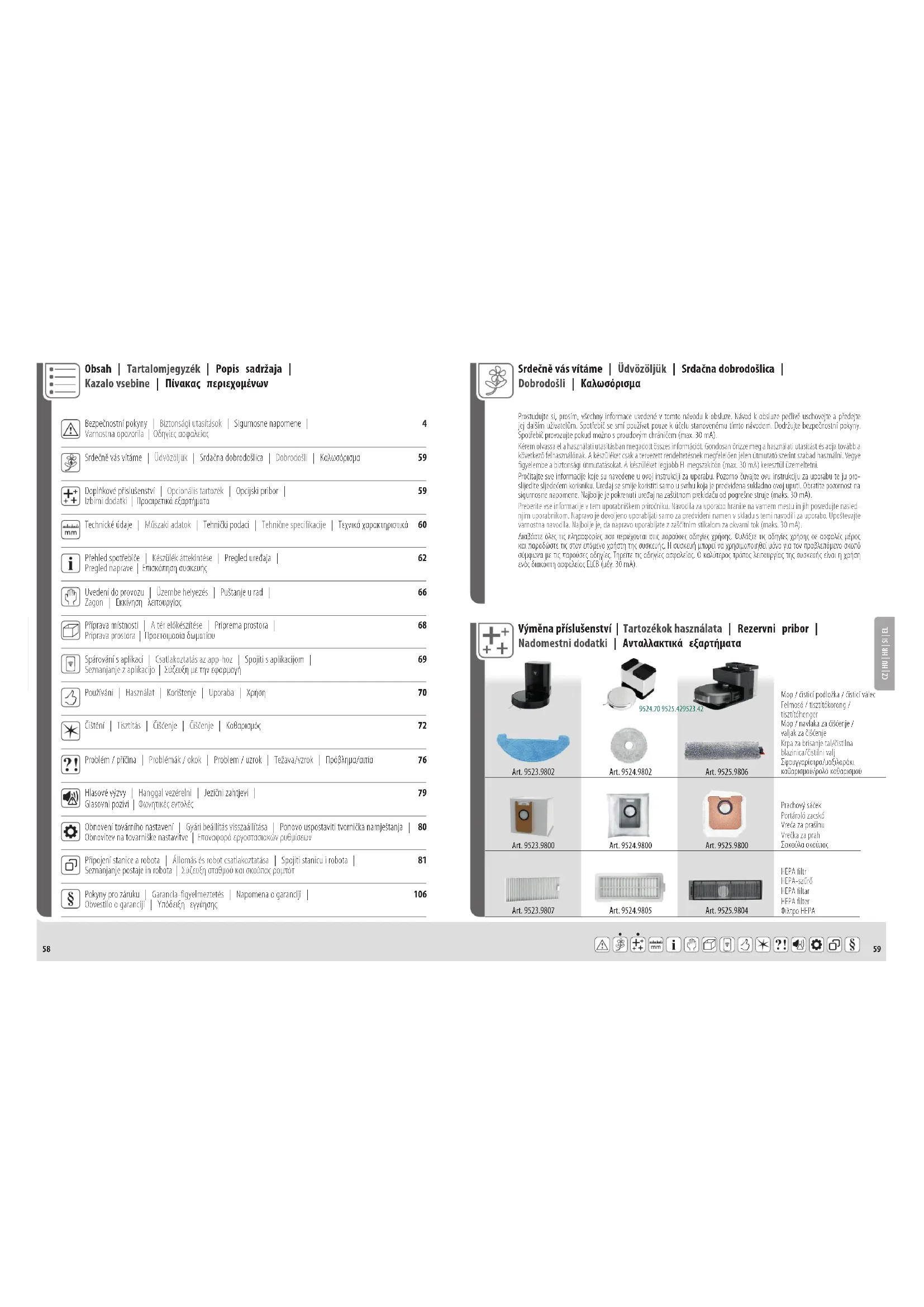 Srdečně vás vítáme | Üdvözöljük | Srdačna dobrodošlica | Dobrodošli | Καλωσόρισμα Prostudujte si, prosím, všechny informace uvedené v tomto návodu k obsluze. Návod k obsluze pečlivě uschovejte a předejte jej dalším uživatelům. Spotřebič se smí používat pouze k účelu stanovenému tímto návodem. Dodržujte bezpečnostní pokyny. Spotřebič provozujte pokud možno s proudovým chráničem (max. 30 mA). Kérem olvassa el a használati utasításban megadott összes információt. Gondosan őrizze meg a használati utasítást és adja tovább a következő felhasználónak. A készüléket csak a tervezett rendeltetésnek megfelelően jelen útmutató szerint szabad használni. Vegye figyelembe a biztonsági útmutatásokat. A készüléket legjobb FI-megszakítón (max. 30 mA) keresztül üzemeltetni. Pročitajte sve informacije koje su navedene u ovoj instrukciji za uporabu. Pozorno čuvajte ovu instrukciju za uporabu te ju pro- slijedite sljedećem korisniku. Uređaj se smije koristiti samo u svrhu koja je predviđena sukladno ovoj uputi. Obratite pozornost na sigurnosne napomene. Najbolje je pokrenuti uređaj na zaštitnom prekidaču od pogrešne struje (maks. 30 mA). Διαβάστε όλες τις πληροφορίες που περιέχονται στις παρούσες οδηγίες χρήσης. Φυλάξτε τις οδηγίες χρήσης σε ασφαλές μέρος και παραδώστε τις στον επόμενο χρήστη της συσκευής. Η συσκευή μπορεί να χρησιμοποιηθεί μόνο για τον προβλεπόμενο σκοπό σύμφωνα με τις παρούσες οδηγίες. Τηρείτε τις οδηγίες ασφαλείας. Ο καλύτερος τρόπος λειτουργίας της συσκευής είναι η χρήση ενός διακόπτη ασφαλείας ELCB (μέγ. 30 mA). Preberite vse informacije v tem uporabniškem priročniku. Navodila za uporabo hranite na varnem mestu in jih posredujte nasled- njim uporabnikom. Napravo je dovoljeno uporabljati samo za predvideni namen v skladu s temi navodili za uporabo. Upoštevajte varnostna navodila. Najbolje je, da napravo uporabljate z zaščitnim stikalom za okvarni tok (maks. 30 mA). Výměna příslušenství | Tartozékok használata | Rezervni pribor | Nadomestni dodatki | Ανταλλακτικά εξαρτήματα Obsah | Tartalomjegyzék | Popis sadržaja | Kazalo vsebine | Πίνακας περιεχομένων Uvedení do provozu | Üzembe helyezés | Puštanje u rad | 66 Zagon | Εκκίνηση λειτουργίας Hlasové výzvy | Hanggal vezérelni | Jezični zahtjevi | 79 Glasovni pozivi | Φωνητικές εντολές Obnovení továrního nastavení | Gyári beállítás visszaállítása | Ponovo uspostaviti tvornička namještanja | 80 Obnovitev na tovarniške nastavitve | Επαναφορά εργοστασιακών ρυθμίσεων Připojení stanice a robota | Állomás és robot csatlakoztatása | Spojiti stanicu i robota | 81 Seznanjanje postaje in robota | Σύζευξη σταθμού και σκούπας ρομπότ Příprava místnosti | A tér előkészítése | Priprema prostora | 68 Priprava prostora | Προετοιμασία δωματίου Spárování s aplikací | Csatlakoztatás az app-hoz | Spojiti s aplikacijom | 69 Seznanjanje z aplikacijo | Σύζευξη με την εφαρμογή Prachový sáček HEPA filtr Felmosó / tisztítókorong / tisztítóhenger Portároló zacskó HEPA-szűrő Mop / navlaka za čišćenje / valjak za čišćenje Vreća za prašinu HEPA filtar Krpa za brisanje tal/čistilna blazinica/čistilni valj Vrečka za prah HEPA filter Σφουγγαρίστρα/μαξιλαράκι καθαρισμού/ρολό καθαρισμού Σακούλα σκούπας Φίλτρο HEPA Mop / čisticí podložka / čisticí válec6160 CZ | HU | HR | SI | EL Technické údaje | Műszaki adatok | Tehnički podaci | Tehnične specifikacije | Datos técnicos Technické údaje | Műszaki adatok | Tehnički podaci | Tehnične specifikacije | Datos técnicos