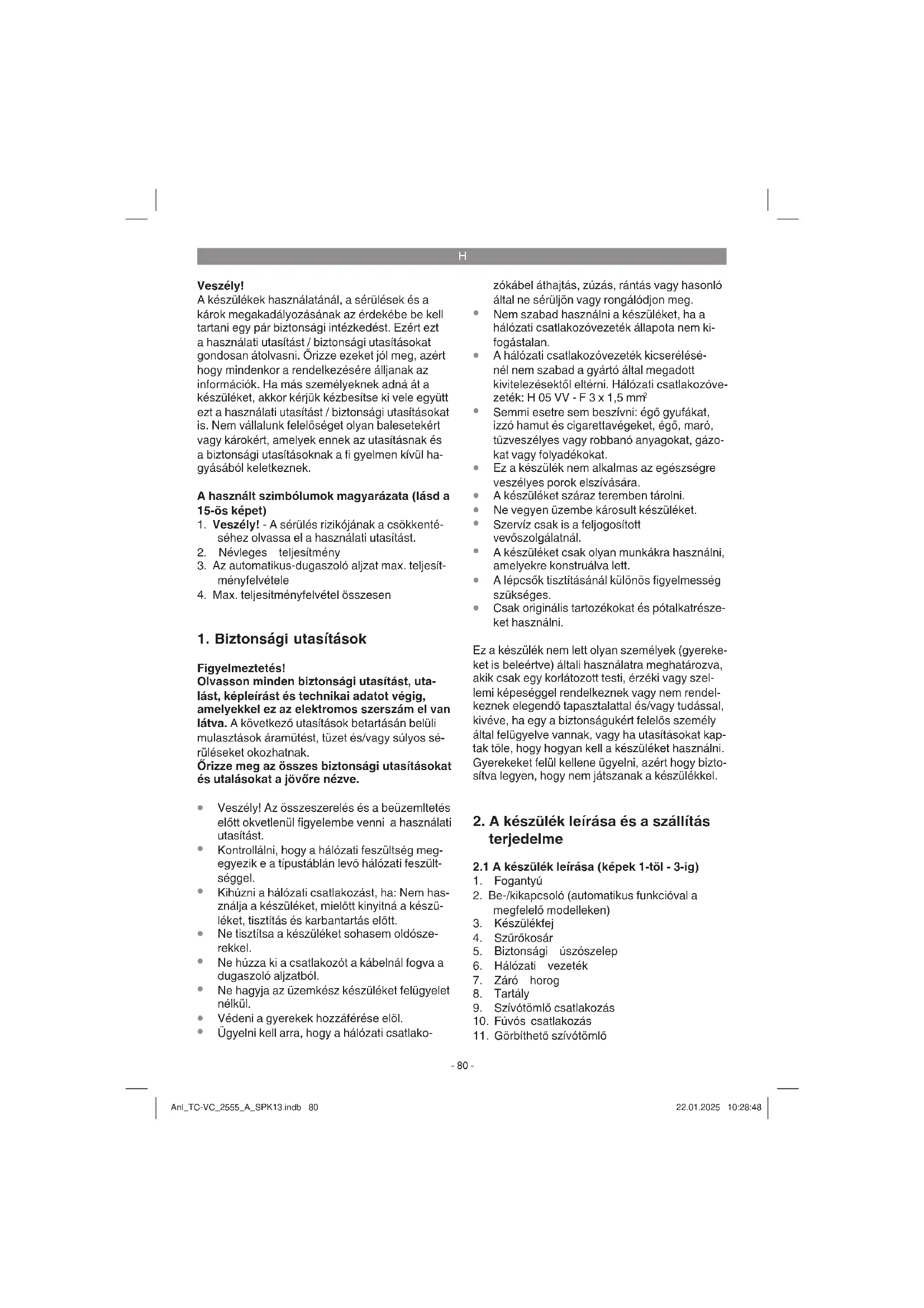 A hálózati csatlakozóvezeték kicserélésé- nél nem szabad a gyártó által megadott kivitelezésektől eltérni. Hálózati csatlakozóve- zeték: H 05 VV - F 3 x 1,5 mm