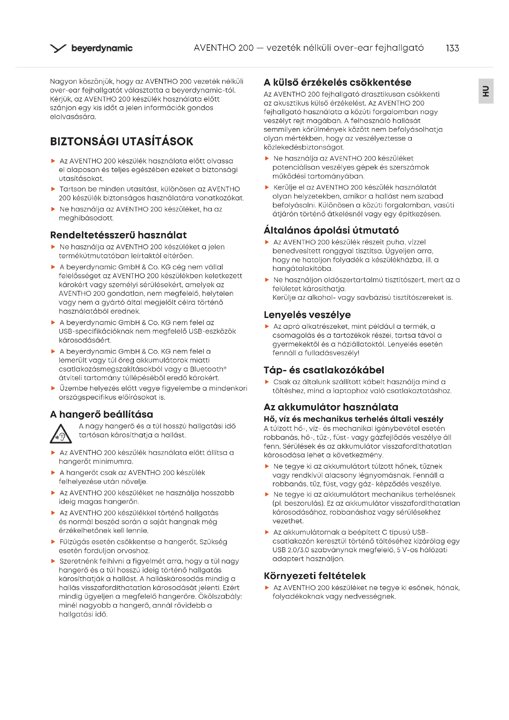 Az AVENTHO 200 készülék használata előtt olvassa el alaposan és teljes egészében ezeket a biztonsági utasításokat. Tason be minden utasítá, különösen az AVENTHO 200 készülék biztonságos használatára vonatkozókat. Ne használja az AVENTHO 200 készüléket, ha az meghibásodott. Rendeltetésszerű használat Ne használja az AVENTHO 200 készüléket a jelen termékútmutatóban leíaktól eltérően. A beyerdynamic GmbH & Co. KG cég nem vállal felelősséget az AVENTHO 200 készülékben keletkezett károké vagy személyi sérüléseké, amelyek az AVENTHO 200 gondatlan, nem megfelelő, helytelen vagy nem a gyáó által megjelölt célra töénő használatából erednek. A beyerdynamic GmbH & Co. KG nem felel az USB-specifikációknak nem megfelelő USB-eszközök károsodásáé. A beyerdynamic GmbH & Co. KG nem felel a lemerült vagy túl öreg akkumulátorok miatti csatlakozásmegszakításokból vagy a Bluetooth® átviteli taomány túllépéséből eredő károké. Üzembe helyezés előtt vegye figyelembe a mindenkori országspecifikus előírásokat is. A hangerő beállítása A nagy hangerő és a túl hosszú hallgatási idő taósan károsíthatja a hallá. Az AVENTHO 200 készülék használata előtt állítsa a hangerőt minimumra. A hangerőt csak az AVENTHO 200 készülék felhelyezése után növelje. Az AVENTHO 200 készüléket ne használja hosszabb ideig magas hangerőn. Az AVENTHO 200 készülékkel töénő hallgatás és normál beszéd során a saját hangnak még érzékelhetőnek kell lennie. Fülzúgás esetén csökkentse a hangerőt. Szükség esetén forduljon orvoshoz. Szeretnénk felhívni a figyelmét arra, hogy a túl nagy hangerő és a túl hosszú ideig töénő hallgatás károsíthatják a hallá. A halláskárosodás mindig a hallás visszafordíthatatlan károsodását jelenti. Ezé mindig ügyeljen a megfelelő hangerőre. Ökölszabály: minél nagyobb a hangerő, annál rövidebb a hallgatási idő. A külső érzékelés csökkentése Az AVENTHO 200 fejhallgató drasztikusan csökkenti az akusztikus külső érzékelé. Az AVENTHO 200 fejhallgató használata a közúti forgalomban nagy veszélyt rejt magában. A felhasználó hallását semmilyen körülmények között nem befolyásolhatja olyan méékben, hogy az veszélyeztesse a közlekedésbiztonságot. Ne használja az AVENTHO 200 készüléket potenciálisan veszélyes gépek és szerszámok működési taományában. Kerülje el az AVENTHO 200 készülék használatát olyan helyzetekben, amikor a hallá nem szabad befolyásolni. Különösen a közúti forgalomban, vasúti átjárón töénő átkelésnél vagy egy építkezésen. Általános ápolási útmutató Az AVENTHO 200 készülék részeit puha, vízzel benedvesített ronggyal tisztítsa. Ügyeljen arra, hogy ne hatoljon folyadék a készülékházba, ill. a hangátalakítóba. Ne használjon oldószeaalmú tisztítósze, me az a felületet károsíthatja. Kerülje az alkohol- vagy savbázisú tisztítószereket is. Lenyelés veszélye Az apró alkatrészeket, mint például a termék, a csomagolás és a taozékok részei, tasa távol a gyermekektől és a háziállatoktól. Lenyelés esetén fennáll a fulladásveszély! Táp- és csatlakozókábel Csak az általunk szállított kábelt használja mind a töltéshez, mind a laptophoz való csatlakoztatáshoz. Az akkumulátor használata Hő, víz és mechanikus terhelés általi veszély A túlzott hő-, víz- és mechanikai igénybevétel esetén robbanás, hő-, tűz-, fü- vagy gázfejlődés veszélye áll fenn. Sérülések és az akkumulátor visszafordíthatatlan károsodása lehet a következmény. Ne tegye ki az akkumuláto túlzott hőnek, tűznek vagy rendkívül alacsony légnyomásnak. Fennáll a robbanás, tűz, fü, vagy gáz- képződés veszélye. Ne tegye ki az akkumuláto mechanikus terhelésnek (pl. beszorulás). Ez az akkumulátor visszafordíthatatlan károsodásához, robbanáshoz vagy sérülésekhez vezethet. Az akkumulátornak a beépített C típusú USB- csatlakozón keresztül töénő töltéséhez kizárólag egy USB 2.0/3.0 szabványnak megfelelő, 5 V-os hálózati adapte használjon. Környezeti feltételek Az AVENTHO 200 készüléket ne tegye ki esőnek, hónak, folyadékoknak vagy nedvességnek.134