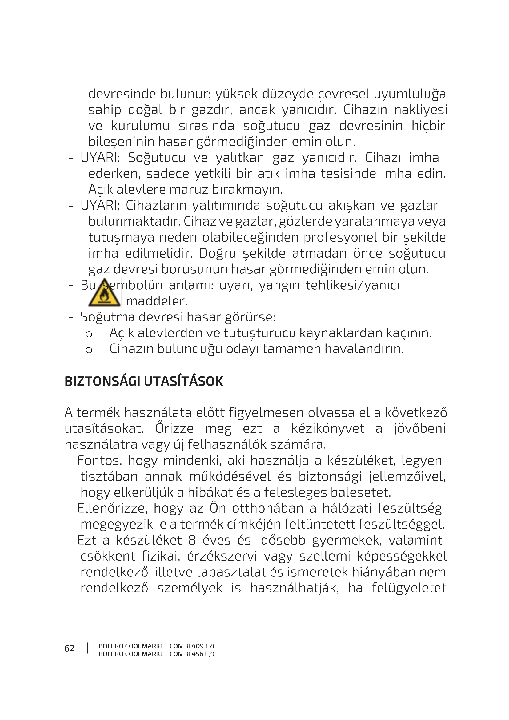 Ez a szimbólum azt jelzi, hogy a vonatkozó előírásoknak megfelelően a terméket és/vagy az akkumulátort a háztartási hulladéktól elkülönítve kell kezelni. Amikor ez a termék eléri élettartamának végét, távolítsa el az elemeket/akkumulátorokat, és vigye el a helyi hatóságok által kijelölt gyűjtőhelyre. Az elektromos és elektronikus eszközök, valamint az azokhoz tartozó elemek megfelelő hulladékkezelésének részletes módjáról a fogyasztók a helyi önkormányzatoknál tájékozódhatnak.BOLERO COOLMARKET COMBI 409 E/C