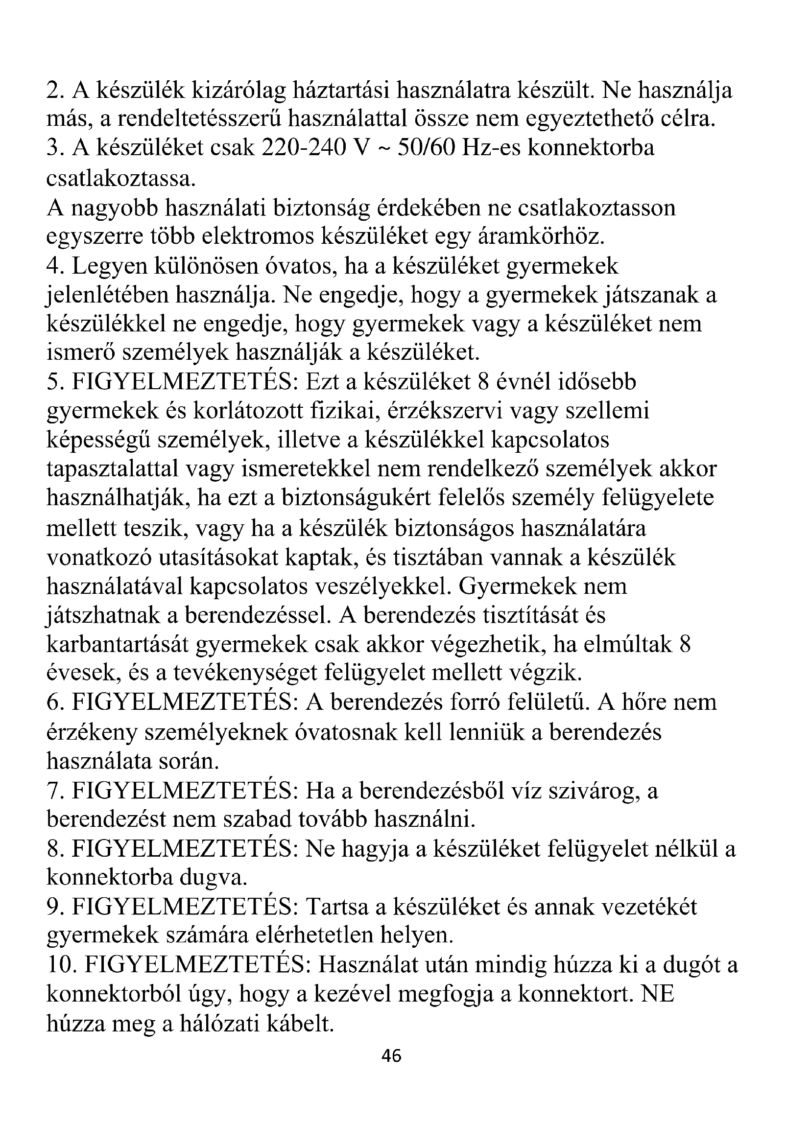 2. A készülék kizárólag háztartási használatra készült. Ne használja
