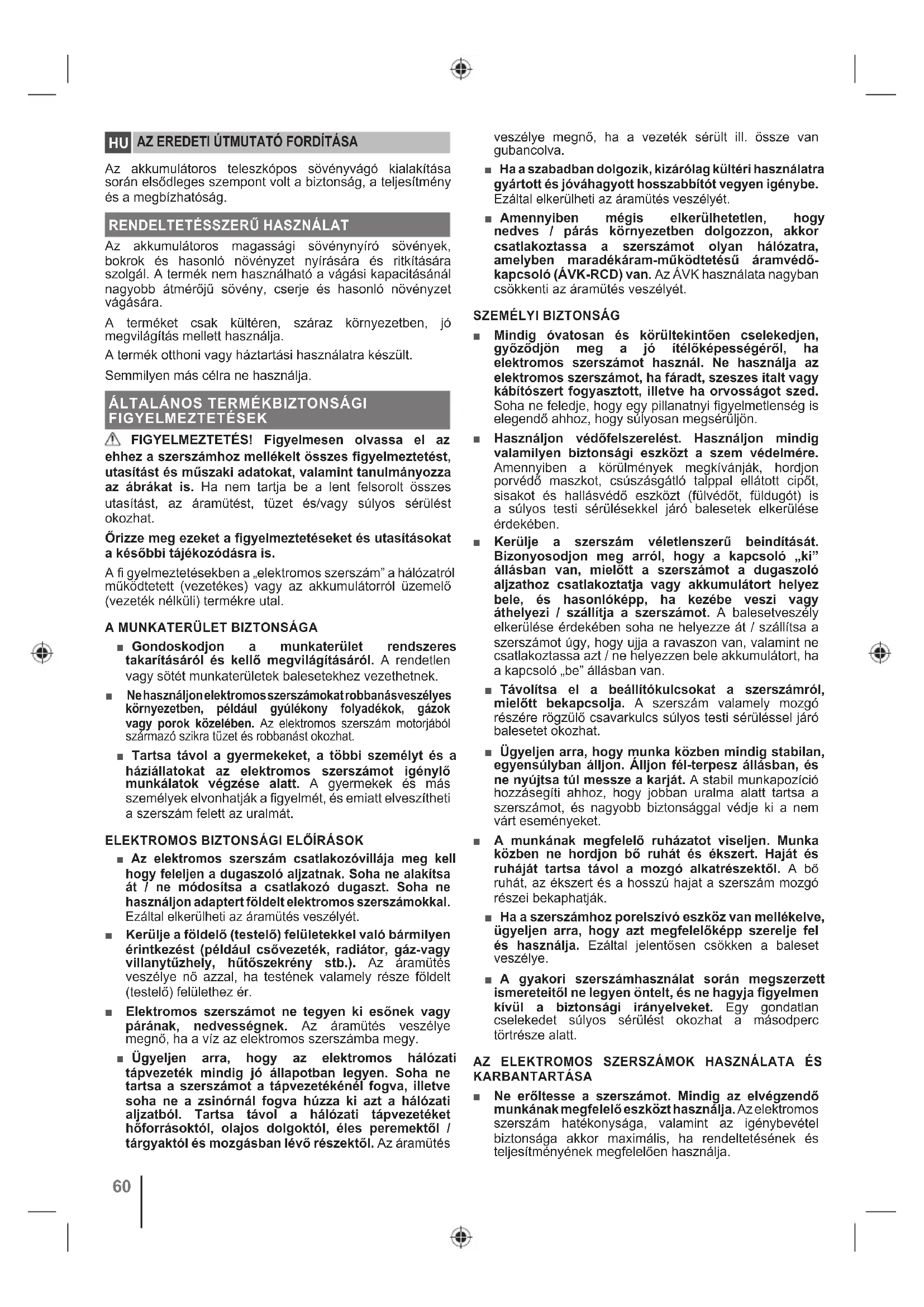 Ne használja az elektromos szerszámot, ha a be -ki kapcsológomb nem teszi lehetővé a szerszám bekapcsolását illetve leállítását. Egy olyan szerszám, amelyet nem lehet megfelelőképp be-és kikapcsolni, az veszélyes, és feltétlenül meg kell javíttatni. ■ Bármilyen módosítás, a tartozékok cseréje vagy tárolás előtt húzza ki a dugót az áramforrásból és/ vagy vegye le az akkucsomagot (ha leválasztható) a szerszámgépről. Ezáltal jelentősen csökkenti a szerszám véletlenszerű beindításának veszélyét. ■ Az elektromos szerszámot gyermekek számára nem hozzáférhető helyen kell tárolni. Ne hagyja, hogy olyan személyek használják a szerszámot, akik nem ismerik a működését, vagy nincsenek tudomással a biztonsági előírásokról. Tapasztalatlan kezek között az elektromos szerszámok veszélyesek lehetnek. ■ A szerszámgépeket és a tartozékait tartsa karban. Ellenőrizze a mozgó alkatrészek beállítását. Ellenőrizze, hogy egyetlen alkatelem sem tört el. Ellenőrizze az összes alkatrész felszerelését / illeszkedését és minden egyéb körülményt, ami befolyásolhatja a szerszám működését. Ha meghibásodást észlel, javíttassa meg a szerszámot, mielőtt újra használatba veszi. Számos baleset a szerszámok nem megfelelő karbantartására vezethető vissza. ■ Ügyeljen arra, a vágószerszámok mindig tiszták és élesek legyenek. Ha a vágószerszám éle jól meg van élesítve és tiszta, akkor kevésbé hajlamos arra, hogy beszoruljon / megakadjon, így jobban megtarthatja uralmát a szerszám felett. ■ Az elektromos szerszámot, a tartozékokat, a szerszámfejeket stb. a jelen használati utasításoknak megfelelően, a használati feltételeknek ill. a kívánt alkalmazásnak a figyelembevételével használja. A veszélyes helyzetek elkerülése érdekében az elektromos szerszámokat kizárólag olyan munkálatokra használja, amelyre azokat tervezték / fejlesztették. ■ A fogantyúkat és fogófelületeket tartsa szárazon, tisztán, olajtól és zsírtól mentesen. A csúszós fogantyúk és fogófelületek miatt nem lehet biztonságosan kezelni és vezérelni a szerszámot váratlan helyzetekben. A VEZETÉK NÉLKÜLI SZERSZÁMOKRA VONATKOZÓ SPECIÁLIS BIZTONSÁGI ELŐÍRÁSOK ■ Kizárólag a gyártó által előírt töltővel töltse a szerszám akkumulátorát. Az előírástól eltérő típusú, nem az akkumulátorhoz való töltő használata tüzet okozhat. ■ Egy akkumulátoros (vezeték nélküli) szerszámhoz csak az adott, neki megfelelő, speciális akkumulátor használható. Bármilyen más típusú akkumulátor használata tüzet okozhat. ■ A használaton kívüli akkumulátort tartsa távol az olyan fémtárgyaktól, mint pl. gémkapocs, pénzérme, kulcs, csavar, szög és bármilyen olyan tárgy, mely rövidre zárhatja az akkumulátor sarkait. Az akkumulátor saruinak (csatlakozó sarkainak) rövidre zárása égési sérüléseket és tüzet idézhet elő. ■ Kerüljön bármiféle kontaktust, érintkezést az akkumulátorfolyadékkal, abban az esetben, ha a túlzott használat következtében szivárogni kezdene. Amennyiben ez mégis megtörténne, öblítse le az érintett felületet tiszta, bő vízzel. Ha a folyadék szembe került, forduljon ezek után orvoshoz is. Az akkumulátorból kikerülő folyadék irritációt válthat ki, és égési sérüléseket okozhat. ■ Ne használjon sérült vagy módosított akkucsomagot vagy szerszámot. A sérült vagy módosított akkumulátorok kiszámíthatatlanul viselkedhetnek, ami tüzet, robbanást vagy sérülésveszélyt okozhat. ■ Az akkucsomagot vagy a szerszámot ne tegye ki tűz vagy túl magas hőmérséklet hatásának. Ha mégis így tesz (tűz, 130 °C feletti hőmérséklet), az robbanást okozhat. ■ Kövessen minden töltési utasítást, és ne töltse az akkucsomagot vagy szerszámot az útmutatóban megadott hőmérséklettartományon kívül. A helytelen vagy a megadott tartományon kívüli hőmérsékleteken végzett töltés sérülést okozhat az akkumulátornak, és növelheti a tűz kockázatát. KARBANTARTÁS ■ A javítási munkálatokat egy olyan, erre képzett szakemberre kell bízni, aki kizárólag eredeti cserealkatrészeket használ. Az elektromos szerszámot így teljes biztonságban tudja majd használni. ■ A sérült akkucsomagokat soha ne próbálja megjavítani. Ilyet csak a gyártó vagy hivatalos szolgáltatók végezhetnek. MAGASSÁGI SÖVÉNYNYÍRÓ – BIZTONSÁGI FIGYELMEZTETÉSEK ■ Ne használja a sövényvágót rossz időjárási körülmények között, különösen villámlás kockázata idején. Ez csökkenti a villámcsapás kockázatát. ■ Tartson minden tápkábelt és vezetéket távol a vágóterülettől. Tápkábelek és vezetékek lehetnek sövényben vagy bokorban rejtve, és a kés véletlenül elvághatja őket. ■ Viseljen fülvédőt. A megfelelő védőeszközök használata csökkenti a halláskárosodás kockázatát. ■ A sövényvágót csak a szigetelt fogófelületeknél tartsa, mert a kés hozzáérhet rejtett vezetékekhez. Ha feszültség alatti vezetékkel érintkezik a kés, akkor a sövényvágó külvilággal érintkező fémrészei is áram alá kerülhetnek, és megrázhatják a kezelőt. ■ Tartsa távol minden testrészét a késtől. Ne távolítsa el a levágott anyagot, és ne tartsa a levágni kívánt anyagot mozgó kések mellett. A pengék a motor leállítása után még forognak. A termékek használata közben már egyetlen figyelmetlen pillanat is súlyos személyi sérüléshez vezethet. ■ Az elakadt anyagok eltávolításakor vagy a sövényvágó szervizelésekor győződjön meg arról, hogy minden tápkapcsoló ki van kapcsolva, valamint az akkumulátorcsomag el van távolítva vagy le van választva. Súlyos személyi sérülést okozhat, ha javítás vagy a beragadt anyag kitisztítása közben a sz