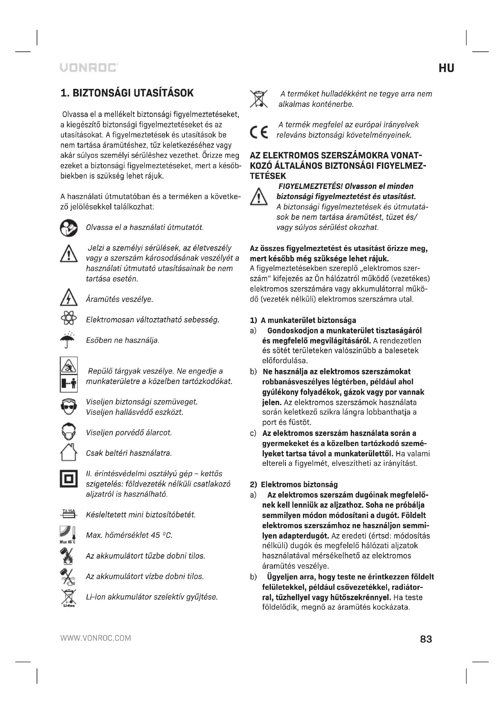 MULÁTORHOZ a) Ne bontsa szét az akkumulátort. Az veszélyes rövidzárlatot okozhat. b) Hőbehatástól védje az akkumulátort, pl. ne te- gye ki folyamatos erős napsugárzásnak, tűztől, víztől és más nedvességtől is védje. Robbanás- veszély. c) Ha az akkumulátor sérült, vagy rendellenesen használják, gőzök áramolhatnak belőle. Szel- lőztesse át a munkaterületet, és ha egészségi panaszai vannak, kérjen orvosi segítséget. Agőzök irritálhatják a légutakat. d) Az akkumulátort csak a Vonroc termékéhez használja. Ezzel az intézkedéssel veszélyes túlterheléstől védi az akkumulátorát.