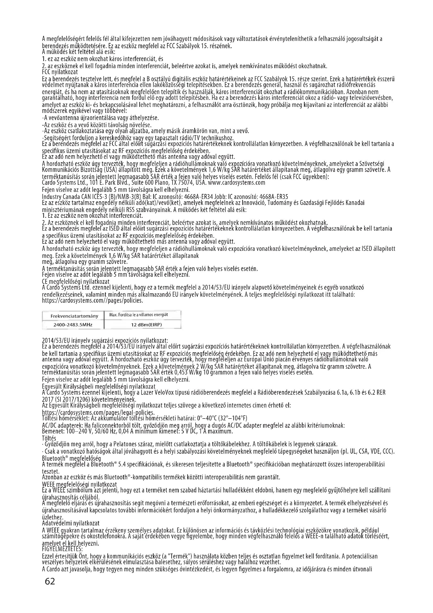 - Hosszú tárolás után töltse fel használat előtt. Megjegyzés: A tervezés és a specifikációk előzetes értesítés nélkül változhatnak. A legfrissebb vállalati és termékinformációkért keresse fel a www.cardosystems.com weboldalt. FCCC ID Bal egység: Q95ER34 FCCC ID Jobb egység: Q95ER35 FCC figyelmeztetés HU | Felhívjuk figyelmét 61Frekvenciatartomány Max. Fordítsa le a villamos energiát 2400-2483.5MHz 12 dBm(EIRP) A megfelelőségért felelős fél által kifejezetten nem jóváhagyott módosítások vagy változtatások érvényteleníthetik a felhasználó jogosultságát a berendezés működtetésére. Ez az eszköz megfelel az FCC Szabályok 15. részének. A működés két feltétel alá esik: