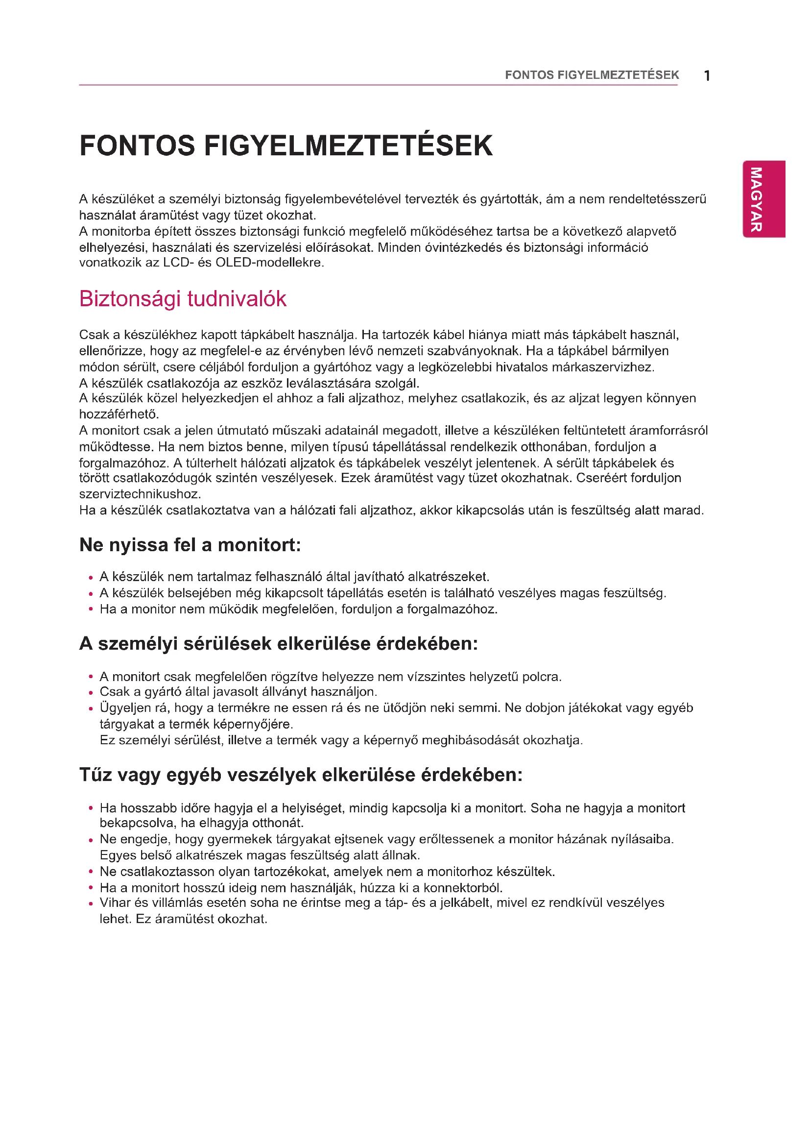 A készüléket a személyi biztonság figyelembevételével tervezték és gyártották, ám a nem rendeltetésszerű használat áramütést vagy tüzet okozhat.A monitorba épített összes biztonsági funkció megfelelő működéséhez tartsa be a következő alapvető elhelyezési, használati és szervizelési előírásokat. Minden óvintézkedés és biztonsági információ vonatkozik az LCD- és OLED-modellekre. Biztonsági tudnivalók Csak a készülékhez kapott tápkábelt használja. Ha tartozék kábel hiánya miatt más tápkábelt használ, ellenőrizze, hogy az megfelel-e az érvényben lévő nemzeti szabványoknak. Ha a tápkábel bármilyen módon sérült, csere céljából forduljon a gyártóhoz vagy a legközelebbi hivatalos márkaszervizhez.A készülék csatlakozója az eszköz leválasztására szolgál.A készülék közel helyezkedjen el ahhoz a fali aljzathoz, melyhez csatlakozik, és az aljzat legyen könnyen hozzáférhető.A monitort csak a jelen útmutató műszaki adatainál megadott, illetve a készüléken feltüntetett áramforrásról működtesse. Ha nem biztos benne, milyen típusú tápellátással rendelkezik otthonában, forduljon a forgalmazóhoz. A túlterhelt hálózati aljzatok és tápkábelek veszélyt jelentenek. A sérült tápkábelek és törött csatlakozódugók szintén veszélyesek. Ezek áramütést vagy tüzet okozhatnak. Cseréért forduljon szerviztechnikushoz.Ha a készülék csatlakoztatva van a hálózati fali aljzathoz, akkor kikapcsolás után is feszültség alatt marad. Ne nyissa fel a monitort: