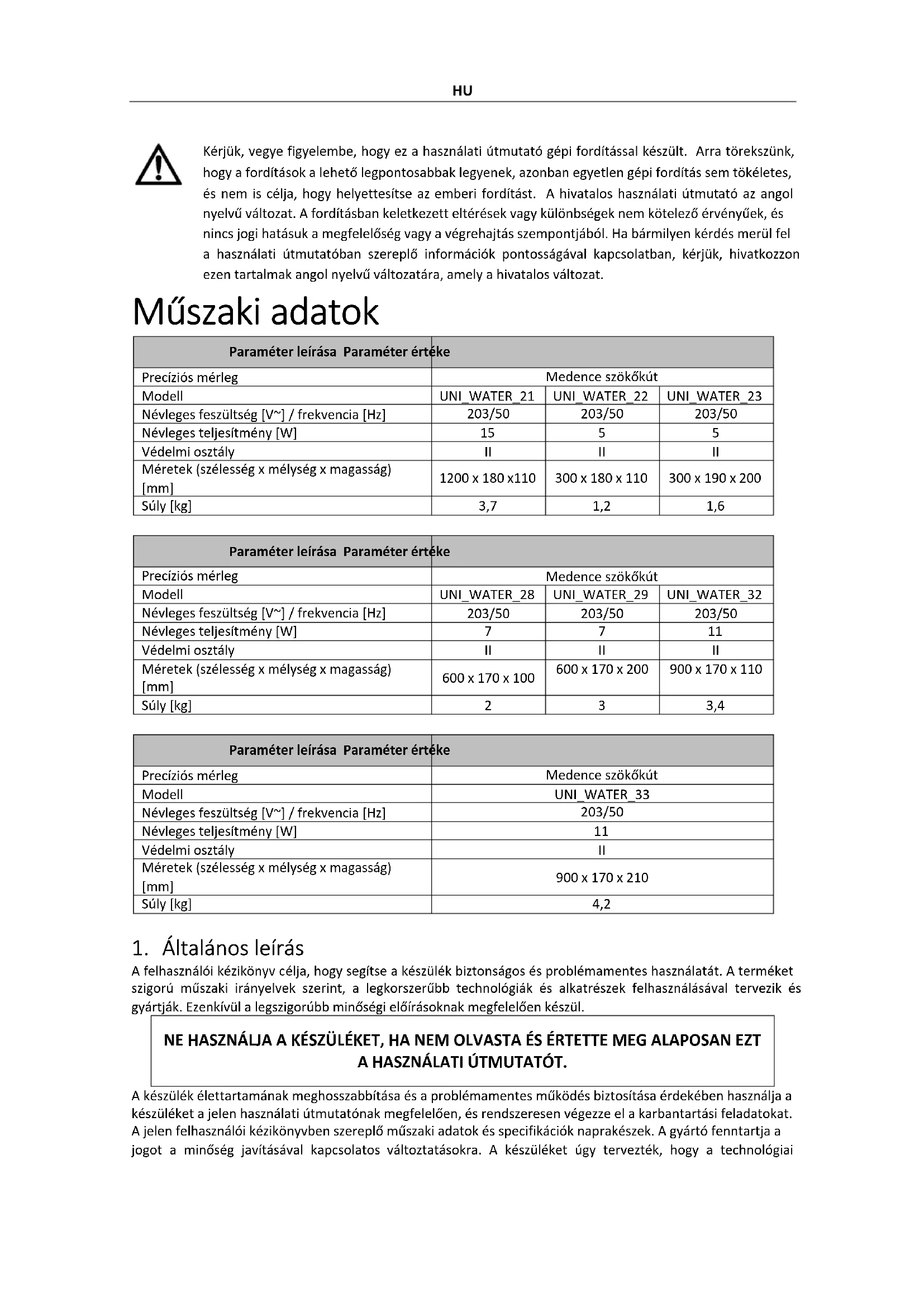 Paraméter leírása Paraméter értéke Precíziós mérleg Medence szökőkút Modell UNI_WATER_28 UNI_WATER_29 UNI_WATER_32 Névleges feszültség [V~] / frekvencia [Hz] 203/50 203/50 203/50 Névleges teljesítmény [W]