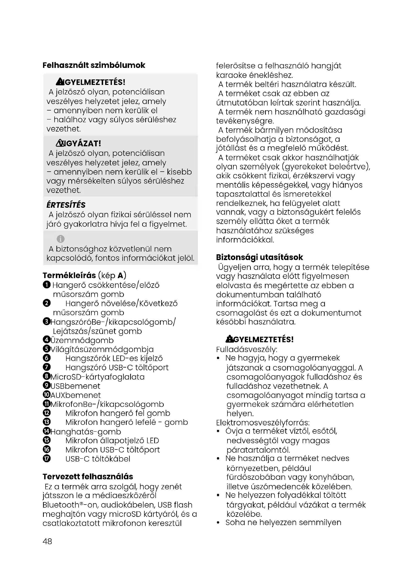 Dette symbol angiver, at det pågældende elektriske produkt eller batteri ikke må bortskaffes som almindeligt husholdningsaffald i Europa. For at sikre korrekt affaldsbehandling af produktet og batteriet skal du bortskaffe dem i overensstemmelse med gældende lokale love og krav til bortskaffelse af elektrisk udstyr eller batterier. På den måde hjælper du med at bevare naturressourcer og forbedre standarderne for miljøbeskyttelse i forbindelse med behandling og bortskaffelse af elektrisk affald (direktivet om affald af elektrisk og elektronisk udstyr).48 felerősítse a felhasználó hangját karaoke énekléshez. A termék beltéri használatra készült. A terméket csak az ebben az útmutatóban leírtak szerint használja. A termék nem használható gazdasági tevékenységre. A termék bármilyen módosítása befolyásolhatja a biztonságot, a jótállást és a megfelelő működést. A terméket csak akkor használhatják olyan személyek (gyerekeket beleértve), akik csökkent fizikai, érzékszervi vagy mentális képességekkel, vagy hiányos tapasztalattal és ismeretekkel rendelkeznek, ha felügyelet alatt vannak, vagy a biztonságukért felelős személy ellátta őket a termék használatához szükséges információkkal. Biztonsági utasítások Ügyeljen arra, hogy a termék telepítése vagy használata előtt figyelmesen elolvasta és megértette az ebben a dokumentumban található információkat. Tartsa meg a csomagolást és ezt a dokumentumot későbbi használatra.
