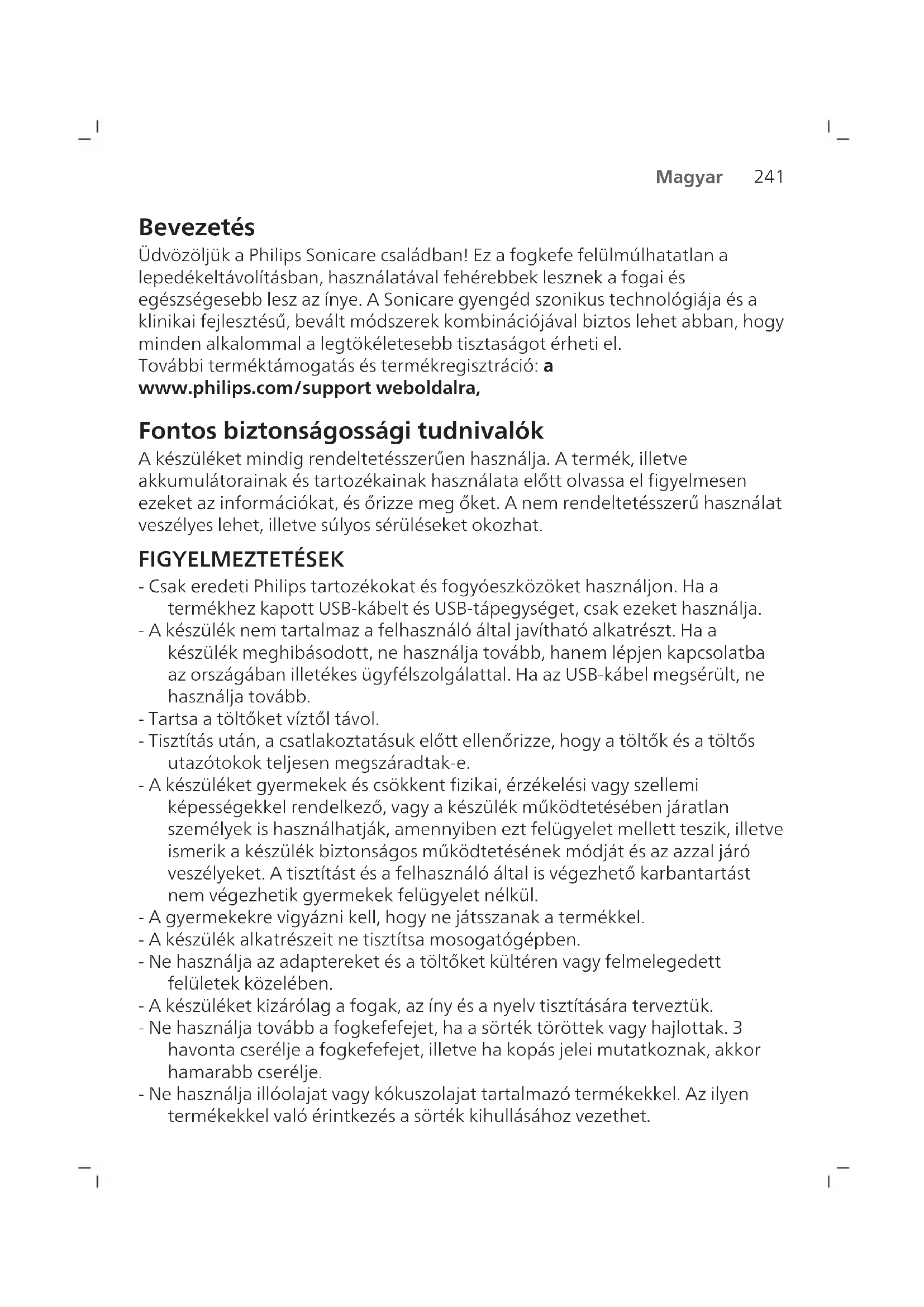 Magyar Bevezetés Üdvözöljük a Philips Sonicare családban! Ez a fogkefe felülmúlhatatlan a lepedékeltávolításban, használatával fehérebbek lesznek a fogai és egészségesebb lesz az ínye. A Sonicare gyengéd szonikus technológiája és a klinikai fejlesztésű, bevált módszerek kombinációjával biztos lehet abban, hogy minden alkalommal a legtökéletesebb tisztaságot érheti el. További terméktámogatás és termékregisztráció: a www.philips.com/support weboldalra, Fontos biztonságossági tudnivalók A készüléket mindig rendeltetésszerűen használja. A termék, illetve akkumulátorainak és tartozékainak használata előtt olvassa el figyelmesen ezeket az információkat, és őrizze meg őket. A nem rendeltetésszerű használat veszélyes lehet, illetve súlyos sérüléseket okozhat. FIGYELMEZTETÉSEK - Csak eredeti Philips tartozékokat és fogyóeszközöket használjon. Ha a termékhez kapott USB-kábelt és USB-tápegységet, csak ezeket használja. - A készülék nem tartalmaz a felhasználó által javítható alkatrészt. Ha a készülék meghibásodott, ne használja tovább, hanem lépjen kapcsolatba az országában illetékes ügyfélszolgálattal. Ha az USB-kábel megsérült, ne használja tovább. - Tartsa a töltőket víztől távol. - Tisztítás után, a csatlakoztatásuk előtt ellenőrizze, hogy a töltők és a töltős utazótokok teljesen megszáradtak-e. - A készüléket gyermekek és csökkent fizikai, érzékelési vagy szellemi képességekkel rendelkező, vagy a készülék működtetésében járatlan személyek is használhatják, amennyiben ezt felügyelet mellett teszik, illetve ismerik a készülék biztonságos működtetésének módját és az azzal járó veszélyeket. A tisztítást és a felhasználó által is végezhető karbantartást nem végezhetik gyermekek felügyelet nélkül. - A gyermekekre vigyázni kell, hogy ne játsszanak a termékkel. - A készülék alkatrészeit ne tisztítsa mosogatógépben. - Ne használja az adaptereket és a töltőket kültéren vagy felmelegedett felületek közelében. - A készüléket kizárólag a fogak, az íny és a nyelv tisztítására terveztük. - Ne használja tovább a fogkefefejet, ha a sörték töröttek vagy hajlottak. 3 havonta cserélje a fogkefefejet,illetve ha kopás jelei mutatkoznak, akkor hamarabb cserélje. - Ne használja illóolajat vagy kókuszolajat tartalmazó termékekkel. Az ilyen termékekkel való érintkezés a sörték kihullásához vezethet.242 Magyar - A termék legfeljebb 4500 méteres tengerszint feletti magasságban használható.