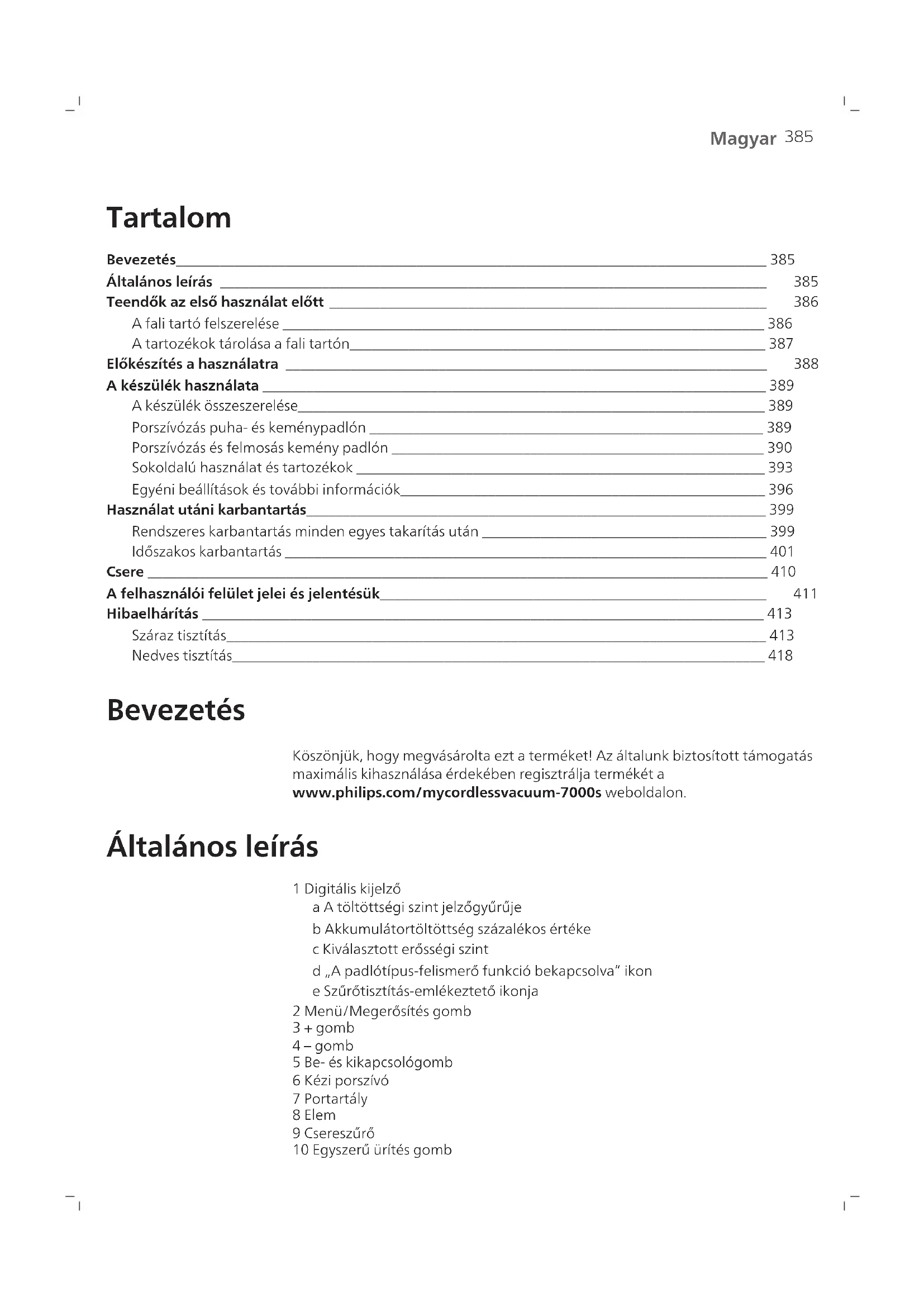 Magyar Magyar Tartalom Bevezetés_________________________________________________________________________________ 385 Általános leírás ___________________________________________________________________________ 385 Teendők az első használat előtt ____________________________________________________________ 386 A fali tartó felszerelése __________________________________________________________________ 386 A tartozékok tárolása a fali tartón_________________________________________________________ 387 Előkészítés a használatra __________________________________________________________________ 388 A készülék használata _____________________________________________________________________ 389 A készülék összeszerelése________________________________________________________________ 389 Porszívózás puha- és keménypadlón ______________________________________________________ 389 Porszívózás és felmosás kemény padlón ___________________________________________________ 390 Sokoldalú használat és tartozékok ________________________________________________________ 393 Egyéni beállítások és további információk__________________________________________________ 396 Használat utáni karbantartás_______________________________________________________________ 399 Rendszeres karbantartás minden egyes takarítás után _______________________________________ 399 Időszakos karbantartás __________________________________________________________________ 401 Csere _____________________________________________________________________________________ 410 A felhasználói felület jelei és jelentésük_____________________________________________________ 411 Hibaelhárítás _____________________________________________________________________________ 413 Száraz tisztítás__________________________________________________________________________ 413 Nedves tisztítás_________________________________________________________________________ 418 Bevezetés Köszönjük, hogy megvásárolta ezt a terméket! Az általunk biztosított támogatás maximális kihasználása érdekében regisztrálja termékét a www.philips.com/mycordlessvacuum-7000s weboldalon. Általános leírás 1 Digitális kijelző a A töltöttségi szint jelzőgyűrűje b Akkumulátortöltöttség százalékos értéke c Kiválasztott erősségi szint d „A padlótípus-felismerő funkció bekapcsolva” ikon e Szűrőtisztítás-emlékeztető ikonja 2 Menü/Megerősítés gomb 3 + gomb 4 – gomb 5 Be- és kikapcsológomb 6 Kézi porszívó 7 Portartály 8 Elem 9 Csereszűrő 10 Egyszerű ürítés gomb386 Magyar 11 Portartálynyitó gomb 12 Adapter 13 Csavarok 14 Fali tartó 15 Szívócső 16 TriActive Smart LED-es szívófej 17 Finom padlókefe (csak az XC7067-hez) 18 Víztartály és mikroszálas felmosókendő (csak az XC7163-hoz, és az XC7167-hez) 19 PetPro szívófej 20 Kombinált kefe 21 Puha kefe (csak XC7065, XC7067, XC7167) 22 Kárpittisztító fej (csak XC7065, XC7067, XC6167) 23 Réstisztító szívófej Teendők az első használat előtt A fali tartó felszerelése 1 Fordítsa kifelé a fali tartót, és oldja ki a szürke kart. Dugja be a töltőcsatlakozót úgy, hogy a fémrésze látható legyen, és felfelé mutasson a fali tartó elülső oldalán. 2 Vezesse el a kábelt az erre a célra kialakított vájatban. 3 Zárja vissza a szürke kart. A szürke zár megfelelő rögzítése esetén egy kattanást kell hallania.387 Magyar 110 ± 2 cm 4 Szilárdan szerelje fel a fali tartót a fal kívánt pontjára úgy, hogy a rögzítőcsavarok nyílásai körülbelül 110 cm-re legyenek a padlótól. Figyelem: Óvatosan fúrjon lyukakat a falba a fali tartó rögzítéséhez, nehogy áramütés érje! Megjegyzés: Ellenőrizze, hogy a fali tartó elég magasan van-e ahhoz, hogy a készülék úgy lógjon a falon, hogy a szívófej nem ér hozzá a padlóhoz. 5 Ha kiválasztotta a megfelelő helyet és magasságot a készülék tárolására és töltésére, erősen húzza meg a csavarokat, és rögzítse a helyére a fali tartót. A tartozékok tárolása a fali tartón Minden tartozék tárolható a fali tartón, kivéve a PetPro szívófej és kárpittisztító kefe kombinációját. Megjegyzés: Ügyeljen arra, hogy a PetPro szívófejet és a kárpittisztító kefét ne lehessen együtt tárolni a fali tartón.388 Magyar Előkészítés a használatra A készülék lítiumion akkumulátorral rendelkezik. A teljesen lemerült akkumulátor feltöltése körülbelül 6 órát vesz igénybe. 1 Helyezze fel az akkumulátort a készülékházra ügyelve a megfelelő rögzítésre, amit egy kattanás jelez.