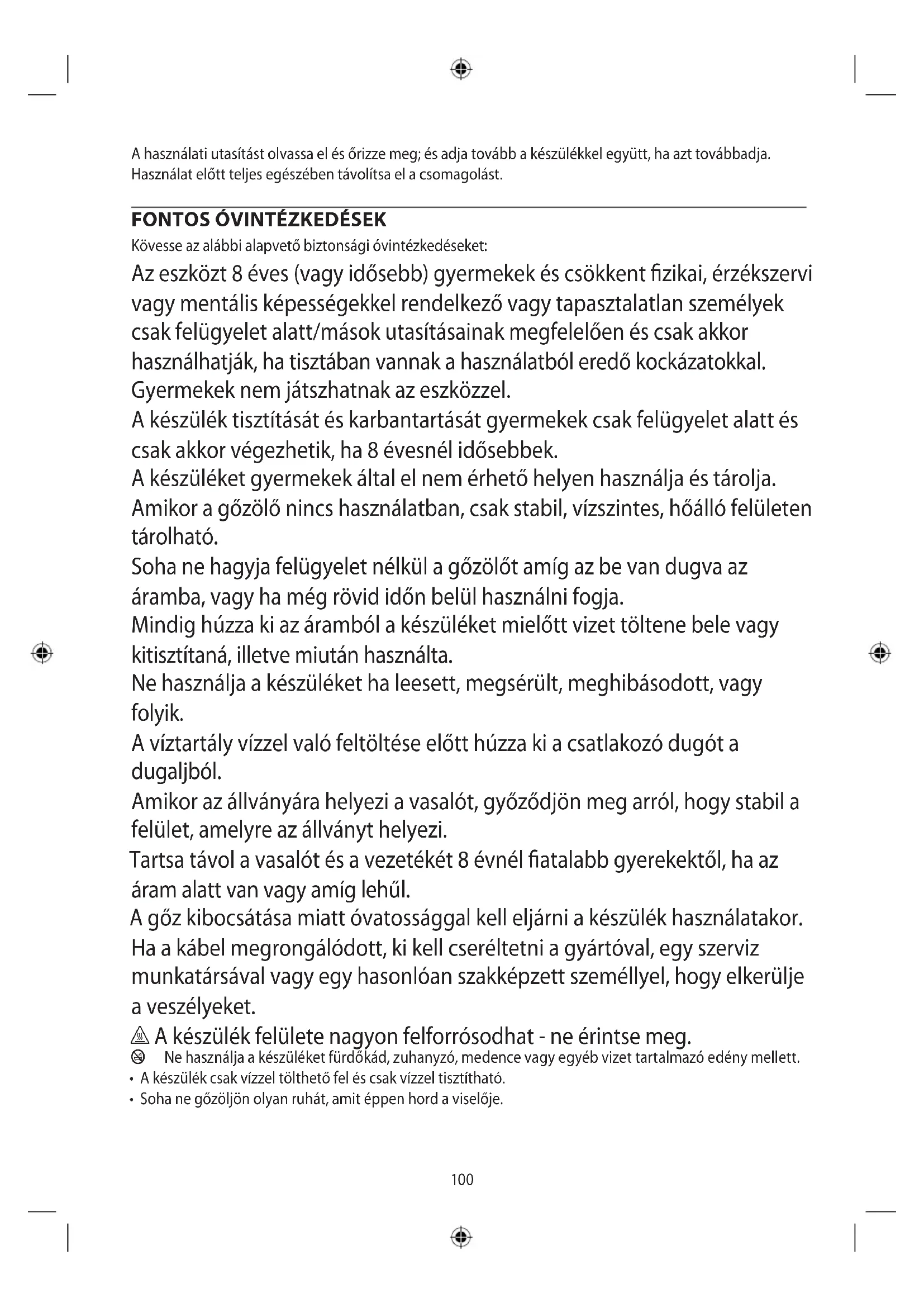 Kövesse az alábbi alapvető biztonsági óvintézkedéseket: Az eszközt 8 éves (vagy idősebb) gyermekek és csökkent fizikai, érzékszervi vagy mentális képességekkel rendelkező vagy tapasztalatlan személyek csak felügyelet alatt/mások utasításainak megfelelően és csak akkor használhatják, ha tisztában vannak a használatból eredő kockázatokkal. Gyermekek nem játszhatnak az eszközzel. A készülék tisztítását és karbantartását gyermekek csak felügyelet alatt és csak akkor végezhetik, ha 8 évesnél idősebbek. A készüléket gyermekek által el nem érhető helyen használja és tárolja. Amikor a gőzölő nincs használatban, csak stabil, vízszintes, hőálló felületen tárolható. Soha ne hagyja felügyelet nélkül a gőzölőt amíg az be van dugva az áramba, vagy ha még rövid időn belül használni fogja. Mindig húzza ki az áramból a készüléket mielőtt vizet töltene bele vagy kitisztítaná, illetve miután használta. Ne használja a készüléket ha leesett, megsérült, meghibásodott, vagy folyik. A víztartály vízzel való feltöltése előtt húzza ki a csatlakozó dugót a dugaljból. Amikor az állványára helyezi a vasalót, győződjön meg arról, hogy stabil a felület, amelyre az állványt helyezi. Tartsa távol a vasalót és a vezetékét 8 évnél fiatalabb gyerekektől, ha az áram alatt van vagy amíg lehűl. A gőz kibocsátása miatt óvatossággal kell eljárni a készülék használatakor. Ha a kábel megrongálódott, ki kell cseréltetni a gyártóval, egy szerviz munkatársával vagy egy hasonlóan szakképzett személlyel, hogy elkerülje a veszélyeket. h A készülék felülete nagyon felforrósodhat - ne érintse meg. b Ne használja a készüléket fürdőkád, zuhanyzó, medence vagy egyéb vizet tartalmazó edény mellett.