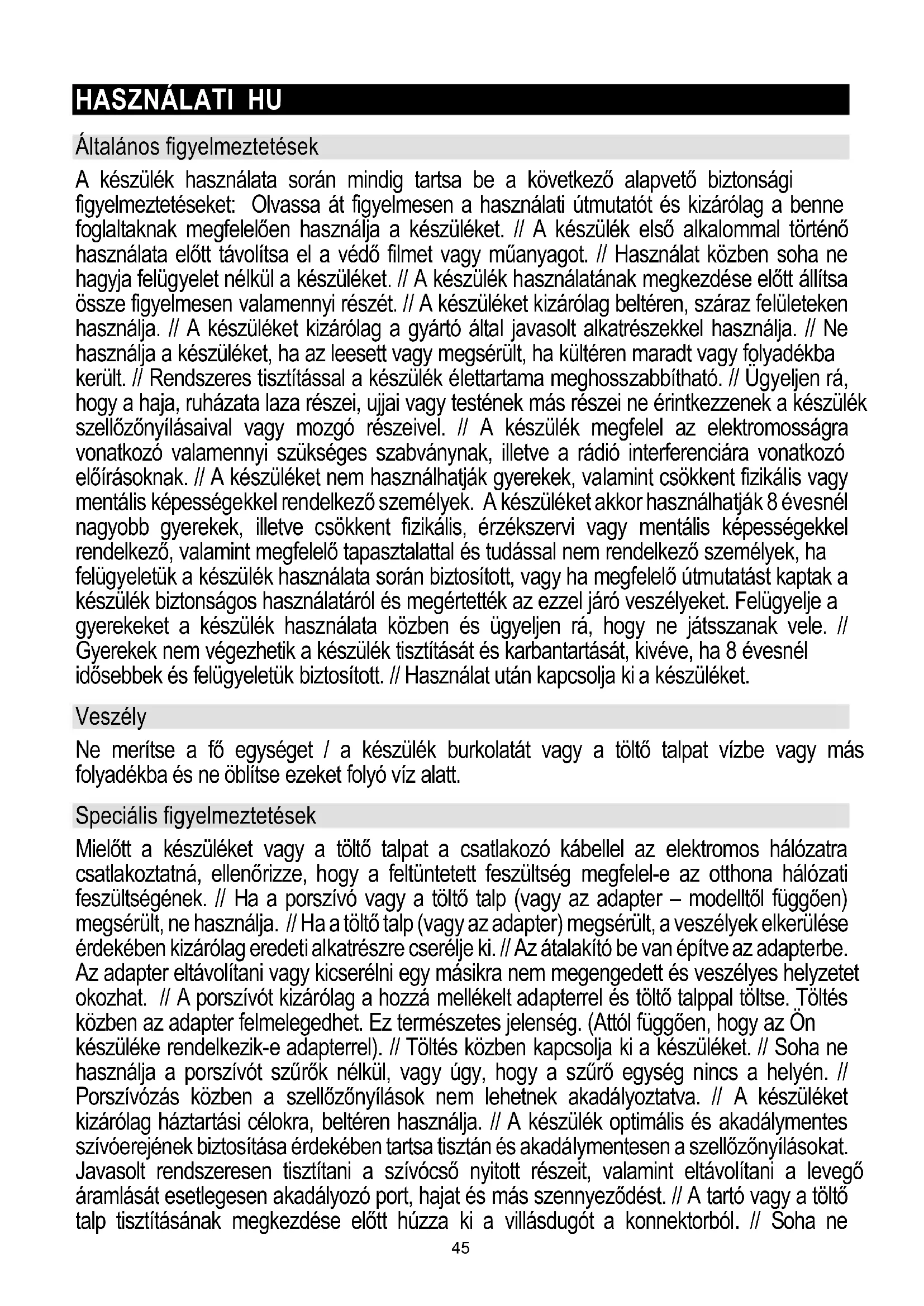Általános figyelmeztetések A készülék használata során mindig tartsa be a következő alapvető biztonsági figyelmeztetéseket: Olvassa át figyelmesen a használati útmutatót és kizárólag a benne foglaltaknak megfelelően használja a készüléket. // A készülék első alkalommal történő használata előtt távolítsa el a védő filmet vagy műanyagot. // Használat közben soha ne hagyja felügyelet nélkül a készüléket. // A készülék használatának megkezdése előtt állítsa össze figyelmesen valamennyi részét. // A készüléket kizárólag beltéren, száraz felületeken használja. // A készüléket kizárólag a gyártó által javasolt alkatrészekkel használja. // Ne használja a készüléket, ha az leesett vagy megsérült, ha kültéren maradt vagy folyadékba került. // Rendszeres tisztítással a készülék élettartama meghosszabbítható. // Ügyeljen rá, hogy a haja, ruházata laza részei, ujjai vagy testének más részei ne érintkezzenek a készülék szellőzőnyílásaival vagy mozgó részeivel. // A készülék megfelel az elektromosságra vonatkozó valamennyi szükséges szabványnak, illetve a rádió interferenciára vonatkozó előírásoknak. // A készüléket nem használhatják gyerekek, valamint csökkent fizikális vagy mentális képességekkel rendelkező személyek. A készüléket akkor használhatják 8 évesnél nagyobb gyerekek, illetve csökkent fizikális, érzékszervi vagy mentális képességekkel rendelkező, valamint megfelelő tapasztalattal és tudással nem rendelkező személyek, ha felügyeletük a készülék használata során biztosított, vagy ha megfelelő útmutatást kaptak a készülék biztonságos használatáról és megértették az ezzel járó veszélyeket. Felügyelje a gyerekeket a készülék használata közben és ügyeljen rá, hogy ne játsszanak vele. // Gyerekek nem végezhetik a készülék tisztítását és karbantartását, kivéve, ha 8 évesnél idősebbek és felügyeletük biztosított. // Használat után kapcsolja ki a készüléket. Veszély Ne merítse a fő egységet / a készülék burkolatát vagy a töltő talpat vízbe vagy más folyadékba és ne öblítse ezeket folyó víz alatt. Speciális figyelmeztetések Mielőtt a készüléket vagy a töltő talpat a csatlakozó kábellel az elektromos hálózatra csatlakoztatná, ellenőrizze, hogy a feltüntetett feszültség megfelel-e az otthona hálózati feszültségének. // Ha a porszívó vagy a töltő talp (vagy az adapter – modelltől függően) megsérült, ne használja. // Ha a töltő talp (vagy az adapter) megsérült, a veszélyek elkerülése érdekében kizárólag eredeti alkatrészre cserélje ki. // Az átalakító be van építve az adapterbe. Az adapter eltávolítani vagy kicserélni egy másikra nem megengedett és veszélyes helyzetet okozhat. // A porszívót kizárólag a hozzá mellékelt adapterrel és töltő talppal töltse. Töltés közben az adapter felmelegedhet. Ez természetes jelenség. (Attól függően, hogy az Ön készüléke rendelkezik-e adapterrel). // Töltés közben kapcsolja ki a készüléket. // Soha ne használja a porszívót szűrők nélkül, vagy úgy, hogy a szűrő egység nincs a helyén. // Porszívózás közben a szellőzőnyílások nem lehetnek akadályoztatva. // A készüléket kizárólag háztartási célokra, beltéren használja. // A készülék optimális és akadálymentes szívóerejének biztosítása érdekében tartsa tisztán és akadálymentesen a szellőzőnyílásokat. Javasolt rendszeresen tisztítani a szívócső nyitott részeit, valamint eltávolítani a levegő áramlását esetlegesen akadályozó port, hajat és más szennyeződést. // A tartó vagy a töltő talp tisztításának megkezdése előtt húzza ki a villásdugót a konnektorból. // Soha ne 45használja a porszívót parázs, cigarettacsikk, gyufa, folyadék (pl. víz, szőnyegtisztító hab), vagy éles, illetve hegyes tárgyak (pl. törött üveg, stb.) feltisztítására. // Tartsa arcától és testétől távol a szívócsövet vagy a készülék nyitott részét. // Soha ne használja a készüléket építési törmelék (finom homok, mészkő, cementpor, festékport, stb.) porszívózására. Ezek kárt okozhatnak a készülékben. Problémák és megoldások Probléma Lehetséges ok Megoldás Nem működik Az akkumulátor lemerült. A morzsaporszívó nem megfelelően van összeszerelve. Töltse fel. Szerelje össze megfelelően a morzsaporszívót. A szívóerő csökkent. A portartály tele van. A szűrő el van tömődve. A levegő bevezető cső el van tömődve vagy az elektromos forgókefe meg van akadva. Ürítse ki a portartályt. Tisztítsa meg vagy cserélje ki a szűrőt. Tisztítsa meg az elektromos forgókefét. A porszívó nem töltődik. A töltő nincs csatlakoztatva a konnektorba. A töltő csatlakozó kábele nincs bedugva a készülék testén található aljzatba. A morzsaporszívó nincs ráhelyezve a készülék testére. Csatlakoztassa a töltőt a konnektorba. Csatlakoztassa a töltőt a porszívó testéhez. Helyezze rá a morzsaporszívót a készülék testére. A töltést követően a készülék nagyon rövid ideig működik Elégtelen töltési idő. Az akkumulátor elöregedett. Töltse a készüléket az utasításoknak megfelelően. Cserélje ki az akkumulátort. Környezetvédelem Élettartama végén a készüléket nem szabad szokványos háztartási hulladékként kezelni, hanem le kell adni egy arra kijelölt gyűjtőhelyen. Ezzel hozzájárulhat környezetünk védelméhez. A készülék a hulladék elektromos és elektronikus berendezésekről (WEEE) szóló, 2012/19/EU európai uniós direktívának megfelelően van jelölve. Ez az irányelv képezi a keretét a hulladék elektromos és elektronikus berendezések Európa-szerte érvényes begyűjtésének és újrafeldolgozásának. Garancia és szerviz Ha t