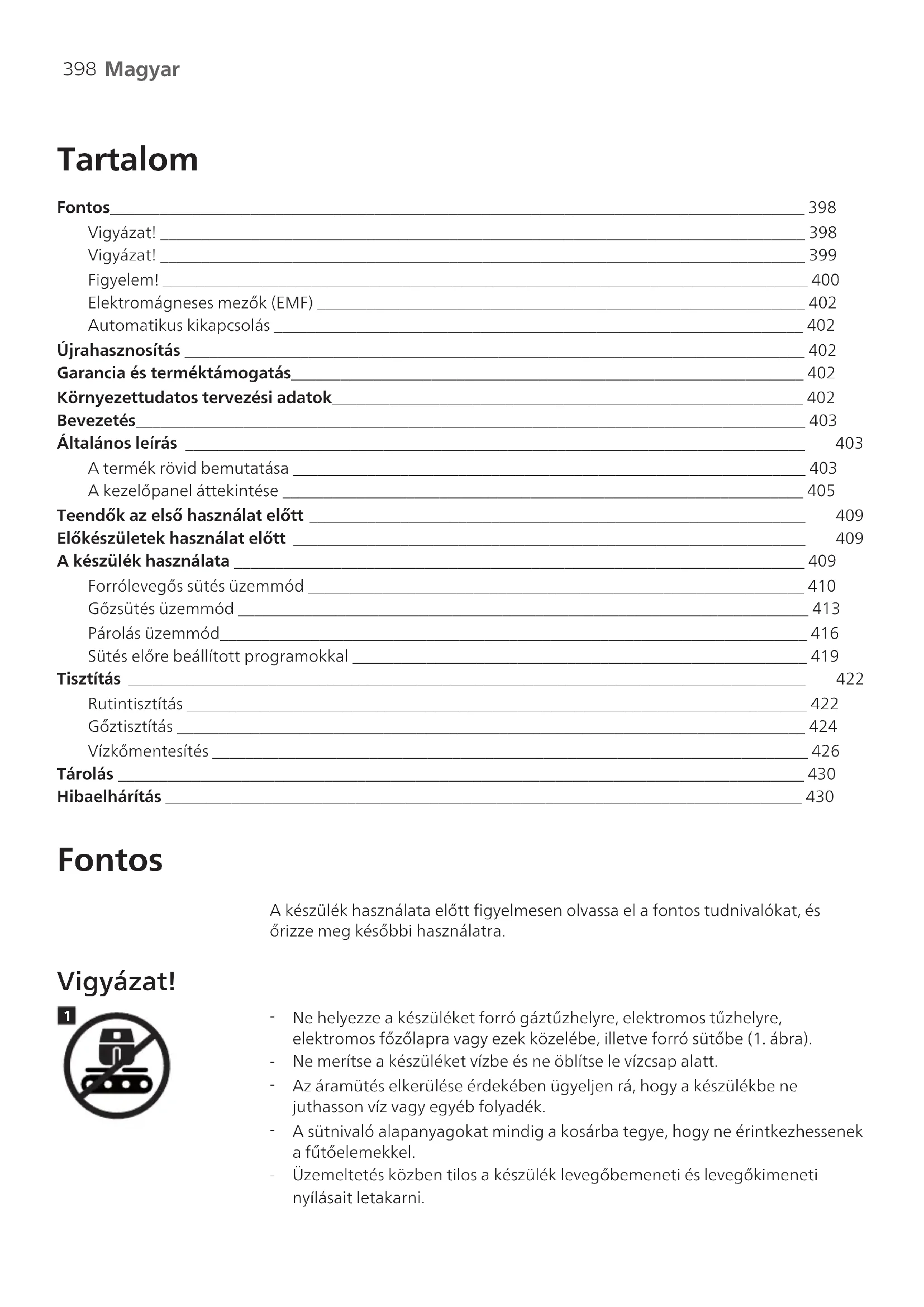 Magyar Magyar Tartalom Fontos____________________________________________________________________________________ 398 Vigyázat! ______________________________________________________________________________ 398 Vigyázat! ______________________________________________________________________________ 399 Figyelem! ______________________________________________________________________________ 400 Elektromágneses mezők (EMF) ___________________________________________________________ 402 Automatikus kikapcsolás ________________________________________________________________ 402 Újrahasznosítás ___________________________________________________________________________ 402 Garancia és terméktámogatás______________________________________________________________ 402 Környezettudatos tervezési adatok_________________________________________________________ 402 Bevezetés_________________________________________________________________________________ 403 Általános leírás ___________________________________________________________________________ 403 A termék rövid bemutatása ______________________________________________________________ 403 A kezelőpanel áttekintése _______________________________________________________________ 405 Teendők az első használat előtt ____________________________________________________________ 409 Előkészületek használat előtt ______________________________________________________________ 409 A készülék használata _____________________________________________________________________ 409 Forrólevegős sütés üzemmód ____________________________________________________________ 410 Gőzsütés üzemmód _____________________________________________________________________ 413 Párolás üzemmód_______________________________________________________________________ 416 Sütés előre beállított programokkal _______________________________________________________ 419 Tisztítás __________________________________________________________________________________ 422 Rutintisztítás ___________________________________________________________________________ 422 Gőztisztítás ____________________________________________________________________________ 424 Vízkőmentesítés ________________________________________________________________________ 426 Tárolás ___________________________________________________________________________________ 430 Hibaelhárítás _____________________________________________________________________________ 430 Fontos A készülék használata előtt figyelmesen olvassa el a fontos tudnivalókat, és őrizze meg későbbi használatra. Vigyázat!