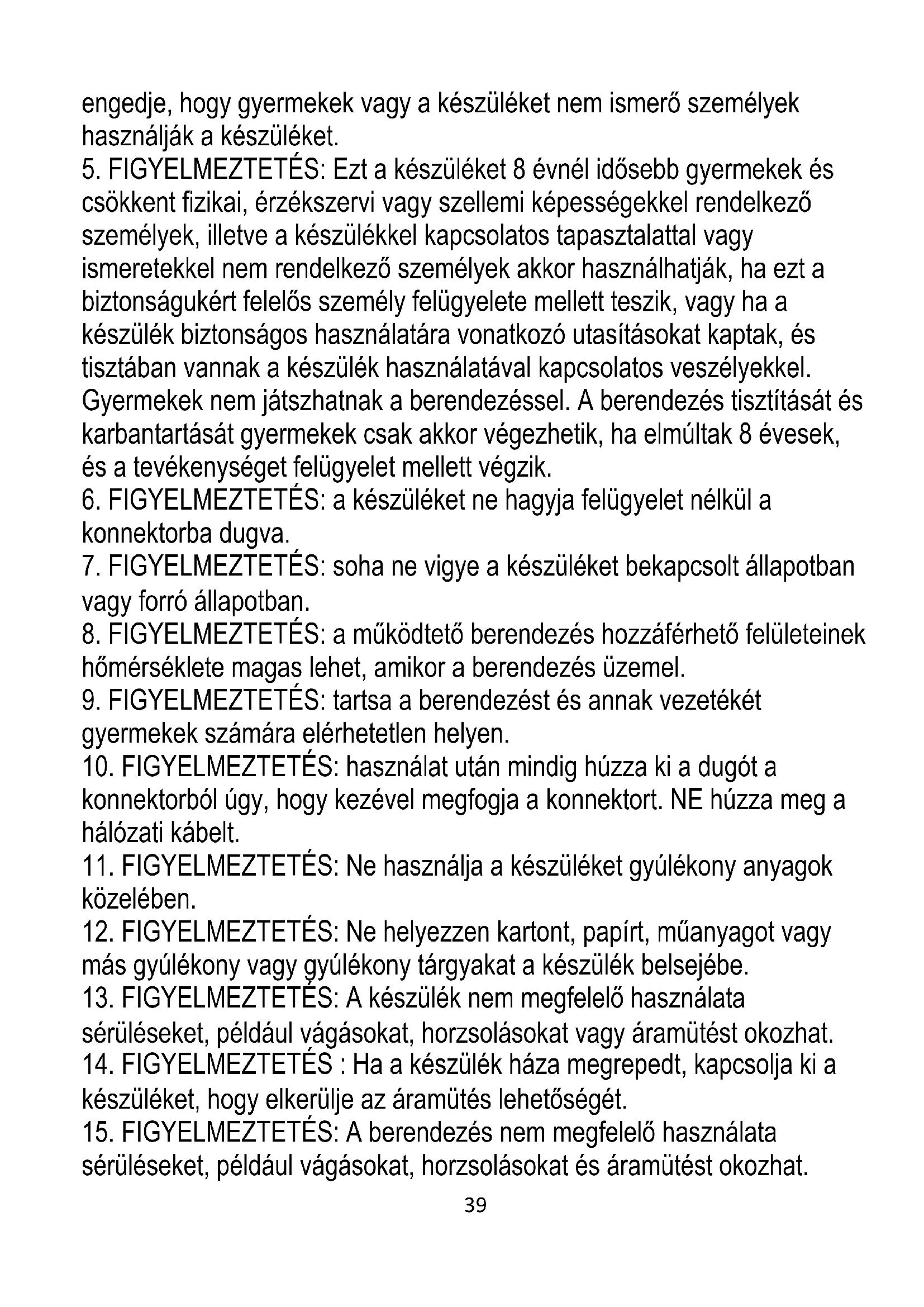 csökkent fizikai, érzékszervi vagy szellemi képességekkel rendelkező személyek, illetve a készülékkel kapcsolatos tapasztalattal vagy ismeretekkel nem rendelkező személyek akkor használhatják, ha ezt a biztonságukért felelős személy felügyelete mellett teszik, vagy ha a készülék biztonságos használatára vonatkozó utasításokat kaptak, és tisztában vannak a készülék használatával kapcsolatos veszélyekkel. Gyermekek nem játszhatnak a berendezéssel. A berendezés tisztítását és karbantartását gyermekek csak akkor végezhetik, ha elmúltak 8 évesek, és a tevékenységet felügyelet mellett végzik.