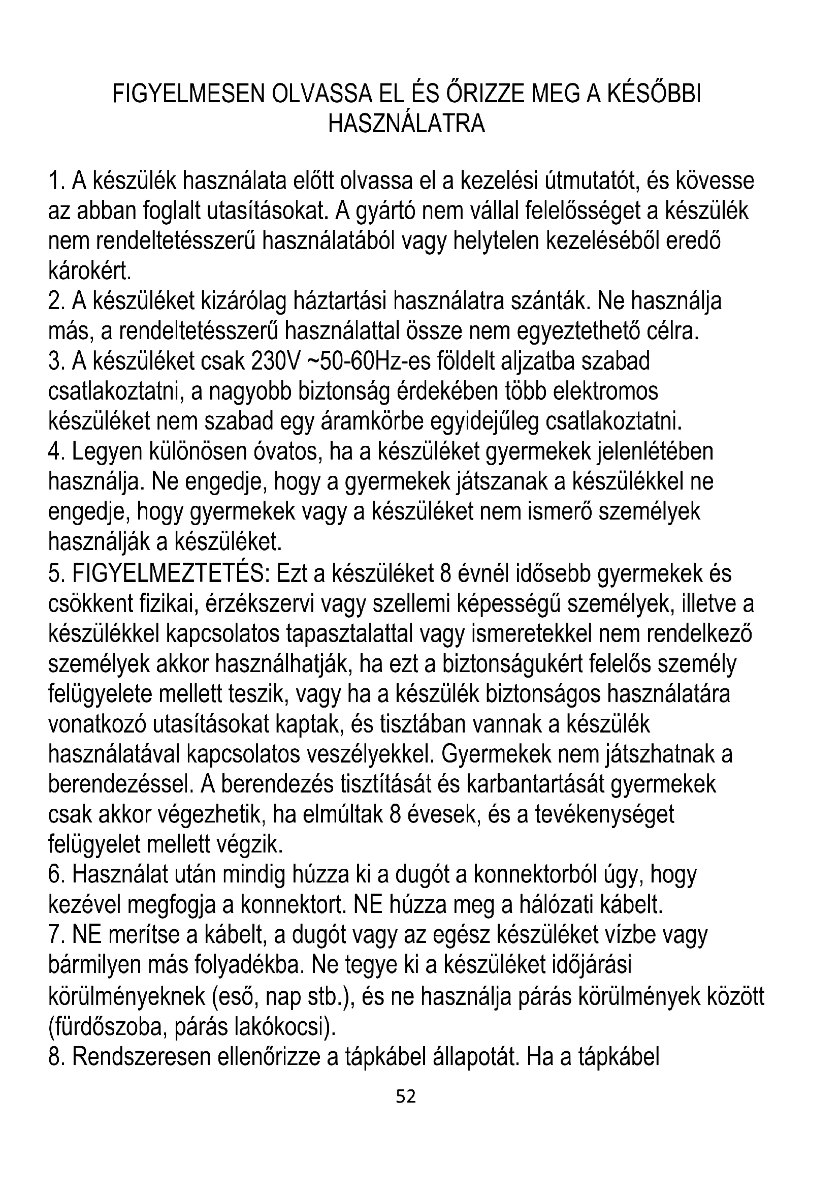 csökkent fizikai, érzékszervi vagy szellemi képességű személyek, illetve a készülékkel kapcsolatos tapasztalattal vagy ismeretekkel nem rendelkező személyek akkor használhatják, ha ezt a biztonságukért felelős személy felügyelete mellett teszik, vagy ha a készülék biztonságos használatára vonatkozó utasításokat kaptak, és tisztában vannak a készülék használatával kapcsolatos veszélyekkel. Gyermekek nem játszhatnak a berendezéssel. A berendezés tisztítását és karbantartását gyermekek csak akkor végezhetik, ha elmúltak 8 évesek, és a tevékenységet felügyelet mellett végzik.