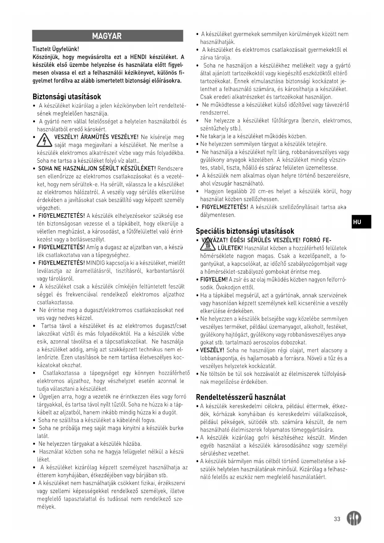 MAGYAR Tisztelt Ügyfelünk! Köszönjük, hogy megvásárolta ezt a HENDI készüléket. A készülék első üzembe helyezése és használata előtt figyel
