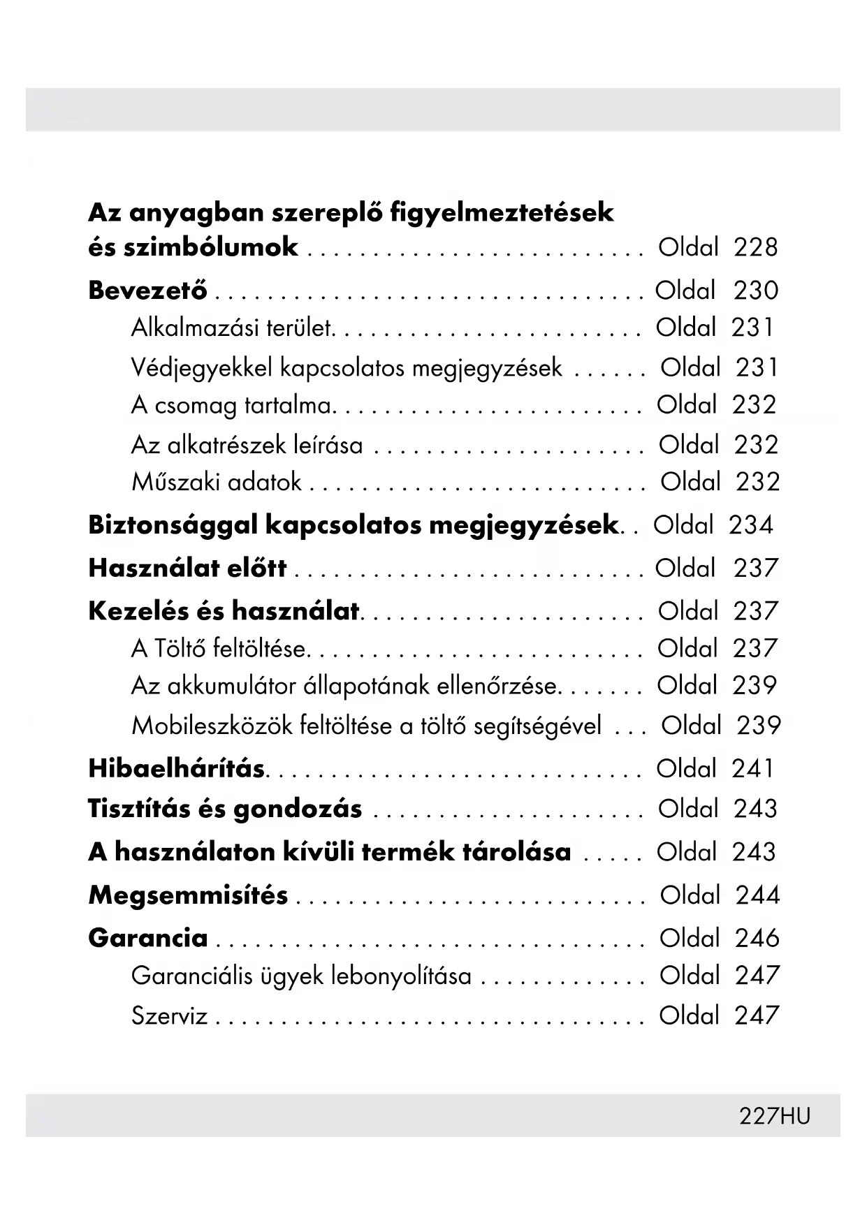 - Ha a terméket nem használják hosszú ideig, a beépített akkumulátort teljesen fel kell tölteni élettartama meghosszabbítása érdekében. Rendszeresen töltse fel a beépített akkumulátort, ha a terméket nem tervezi használni hosszú ideig. Erre az akkumulátor tartóssága érdekében van szükség. Hibaelhárítás = Probléma = Ok = Megoldás A töltő [3] nem töltődik. Elképzelhető, hogy a töltő nem csatlakozik megfelelően. Ellenőrizze, hogy csatlakoztatva van-e.242 HU A töltő feltöltéséhez kizárólag e felhasználói kézikönyv „Műszaki adatok” fejezetében szereplő bemeneti feszültséggel és áramerősséggel megegyező kimeneti feszültséggel, illetve áramerősséggel rendelkező tápegységet használjon. A egyik csatlakoztatott eszköz nem töltődik. Az akkumulátor gyenge. Töltse fel az akkumulátort. Az eszköz nincs csatlakoztatva. Az eszköz nincs csatlakoztatva. Ellenőrizze, hogy csatlakoztatva van-e. Röviden nyomja meg a BE / KI gombot [6] a töltési folyamat indításához. Elképzelhető, hogy a csatlakoztatott eszköz áramfogyasztása túl alacsony. Tekintse meg a csatlakoztatott eszköz kézikönyvét, hogy megállapíthassa, megfelel-e a csatlakoztatott eszköz áramfogyasztása a terméknek. A töltő minimális kimeneti áramerőssége kb. 60 mA. A töltő[3] nem reagál, amikor megnyomják a gombot, illetve egy eszközt csatlakoztatnak, pedig az akkumulátor fel van töltve. A csatlakoztatott eszközök áramfogyasztása túl magas. Ezért a túláramvédő eszköz aktiválódott. Csökkentse a csatlakoztatott eszközök számát, majd nyomja meg a BE / KI gombot [6].243HU Tisztítás és gondozás A terméknek nincs belső alkatrésze, amely karbantartást igényelne. A termékbe jutó nedvesség meghibásodást okozhat.