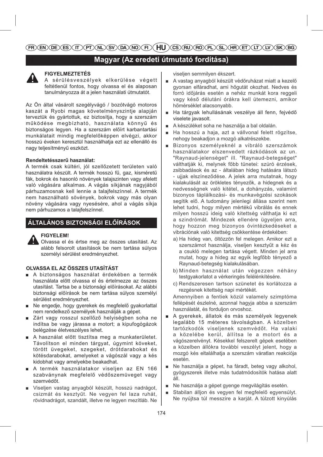 Rendeltetésszer? használat: A termék csak kültéri, jól szellzetett területen való használatra készült. A termék hosszú f, gaz, kisméret fák, bokrok és hasonló növények talajszinten vagy afelett való vágására alkalmas. A vágás síkjának nagyjából párhuzamosnak kell lennie a talajfelszínnel. A termék nem használható sövények, bokrok vagy más olyan növény vágására vagy nyesésére, ahol a vágás síkja nem párhuzamos a talajfelszínnel. ÁLTALÁNOS BIZTONSÁGI EL@ÍRÁSOK FIGYELEM! Olvassa el és értse meg az összes utasítást. Az alább felsorolt utasítások be nem tartása súlyos személyi sérülést eredményezhet. OLVASSA EL AZ ÖSSZES UTASÍTÁST A biztonságos használat érdekében a termék használata eltt olvassa el és értelmezze az összes utasítást. Tartsa be a biztonsági elírásokat. Az alábbi biztonsági elírások be nem tartása súlyos személyi sérülést eredményezhet. Q Ne engedje, hogy gyerekek és megfelel gyakorlattal nem rendelkez személyek használják a gépet. Q Zárt vagy rosszul szellz helyiségben soha ne indítsa be vagy járassa a motort; a kipufogógázok belégzése életveszélyes lehet. Q A használat eltt tisztítsa meg a munkaterületet. Távolítson el minden tárgyat, úgymint köveket, törött üvegeket, szegeket, drótdarabokat és kötésdarabokat, amelyeket a vágószál vagy a kés kidobhat vagy amelyekbe beakadhat. Q A termék használatakor viseljen az EN 166 szabványnak megfelel védszemüveget vagy szemvédt. Q Viseljen vastag anyagból készült, hosszú nadrágot, csizmát és kesztyt. Ne vegyen fel laza ruhát, rövidnadrágot, szandált, illetve ne legyen mezítláb. Ne