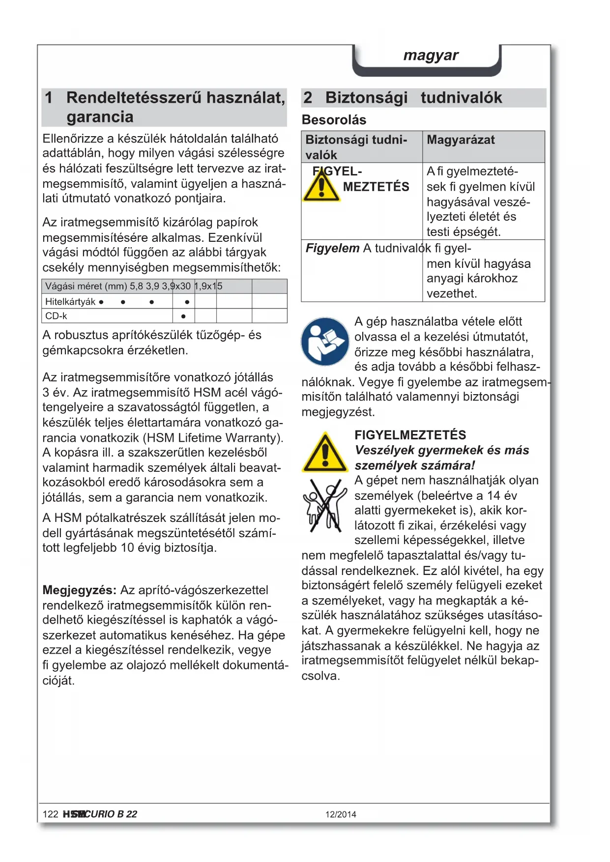 - Direk va 2011/65/EU (RoHS) EU izjavo o skladnos lahko zahtevate pri proizvajalcu.122 SECURIO B 22 12/2014 magyar 2 Biztonsági tudnivalók Besorolás Biztonsági tudni- valók Magyarázat FIGYEL- MEZTETÉS A fi gyelmezteté- sek fi gyelmen kívül hagyásával veszé- lyezteti életét és testi épségét. Figyelem A tudnivalók fi gyel- men kívül hagyása anyagi károkhoz vezethet. A gép használatba vétele előtt olvassa el a kezelési útmutatót, őrizze meg későbbi használatra, és adja tovább a későbbi felhasz- nálóknak. Vegye fi gyelembe az iratmegsem- misítőn található valamennyi biztonsági megjegyzést. FIGYELMEZTETÉS Veszélyek gyermekek és más személyek számára! A gépet nem használhatják olyan személyek (beleértve a 14 év alatti gyermekeket is), akik kor- látozott fi zikai, érzékelési vagy szellemi képességekkel, illetve nem megfelelő tapasztalattal és/vagy tu- dással rendelkeznek. Ez alól kivétel, ha egy biztonságért felelő személy felügyeli ezeket a személyeket, vagy ha megkapták a ké- szülék használatához szükséges utasításo- kat. A gyermekekre felügyelni kell, hogy ne játszhassanak a készülékkel. Ne hagyja az iratmegsemmisítőt felügyelet nélkül bekap- csolva. 1 Rendeltetésszerű használat, garancia Ellenőrizze a készülék hátoldalán található adattáblán, hogy milyen vágási szélességre és hálózati feszültségre lett tervezve az irat- megsemmisítő, valamint ügyeljen a haszná- lati útmutató vonatkozó pontjaira. Az iratmegsemmisítő kizárólag papírok megsemmisítésére alkalmas. Ezenkívül vágási módtól függően az alábbi tárgyak csekély mennyiségben megsemmisíthetők: Vágási méret (mm) 5,8 3,9 3,9x30 1,9x15 Hitelkártyák ●● ● ● CD-k ● A robusztus aprítókészülék tűzőgép- és gémkapcsokra érzéketlen. Megjegyzés: Az aprító-vágószerkezettel rendelkező iratmegsemmisítők külön ren- delhető kiegészítéssel is kaphatók a vágó- szerkezet automatikus kenéséhez. Ha gépe ezzel a kiegészítéssel rendelkezik, vegye fi gyelembe az olajozó mellékelt dokumentá- cióját. Az iratmegsemmisítőre vonatkozó jótállás 3 év. Az iratmegsemmisítő HSM acél vágó- tengelyeire a szavatosságtól független, a készülék teljes élettartamára vonatkozó ga- rancia vonatkozik (HSM Lifetime Warranty). A kopásra ill. a szakszerűtlen kezelésből valamint harmadik személyek általi beavat- kozásokból eredő károsodásokra sem a jótállás, sem a garancia nem vonatkozik. A HSM pótalkatrészek szállítását jelen mo- dell gyártásának megszüntetésétől számí- tott legfeljebb 10 évig biztosítja.12/2014 SECURIO B 22 123 magyar FIGYELMEZTETÉS Veszélyes hálózati feszültség! A készülék helytelen használata áramütéshez vezethet. – A hálózati csatlakozódugó csatlakoztatá- sa előtt ellenőrizze, hogy az elektromos hálózat feszültsége és frekvenciája meg- egyezik-e az adattábla adataival. – Ügyeljen arra, hogy a hálózati csatlakozó könnyen elérhető legyen. – Kerülje víz iratmegsemmisítőbe történő bejutását. Ne merítse vízbe se a hálózati kábelt, se a hálózati csatlakozót. – Ne érintse meg a hálózati csatlakozót nedves kézzel. – A hálózati csatlakozót ne a kábelnél fog- va húzza ki a csatlakozóaljzatból, mindig a hálózati csatlakozót fogja meg. – Csak száraz, beltéri helyiségekben hasz- nálja a készüléket. Soha ne használja nedves helyiségekben vagy esőben. Rendszeresen ellenőrizze a ké- szülék és a kábel sérülésmentes- ségét. Kapcsolja ki az iratmeg- semmisítőt károsodás vagy nem üzemszerű működés, valamint áthelye- zés vagy tisztítás esetén, és húzza ki a hálózati csatlakozót. – Tartsa távol a készüléket, a hálóza- ti csatlakozót és a hálózati kábelt nyílt lángoktól és forró felületektől. A szellőző- nyílásoknak szabadon kell maradniuk, és az iratmegsemmisítőnek legalább 5 cm távolságra kell lennie a faltól vagy a búto- roktól. A burkolatelemek eltávolításával járó szervizmunkákat csak a HSM-vevőszolgálat, illetve szer- ződéses partnereink szerviztech- nikusai végezhetik. Vevőszolgálat címe; lásd 160. oldal Figyelem Helytelen használat okozta veszély A készüléket kizárólag a „Rendeltetésszerű használat“ című fejezetben leírtak szerint használja. FIGYELMEZTETÉS Sérülésveszély! Soha ne nyúljon a papíradagoló nyílásának résébe. Sérülésveszély behúzódás által! Ügyeljen arra, hogy hosszú haj, laza öltözék, nyakkendő, sál, nyak- és karlánc stb. ne kerüljön a papíradagoló nyílásának közelé- be. Ne semmisítsen meg a ké- szülékben hurkolódásra hajlamos anyagot, pl. szalagot, zsineget, műanyag fóliát stb. Sérülésveszély szilánkok által! Kemény hitelkártyák, CD-k vagy lemezek megsemmisítésénél viseljen védőszemüve- get.124 SECURIO B 22 12/2014 magyar 3 Áttekintés 4 A szállítmány tartalma Tartozékok