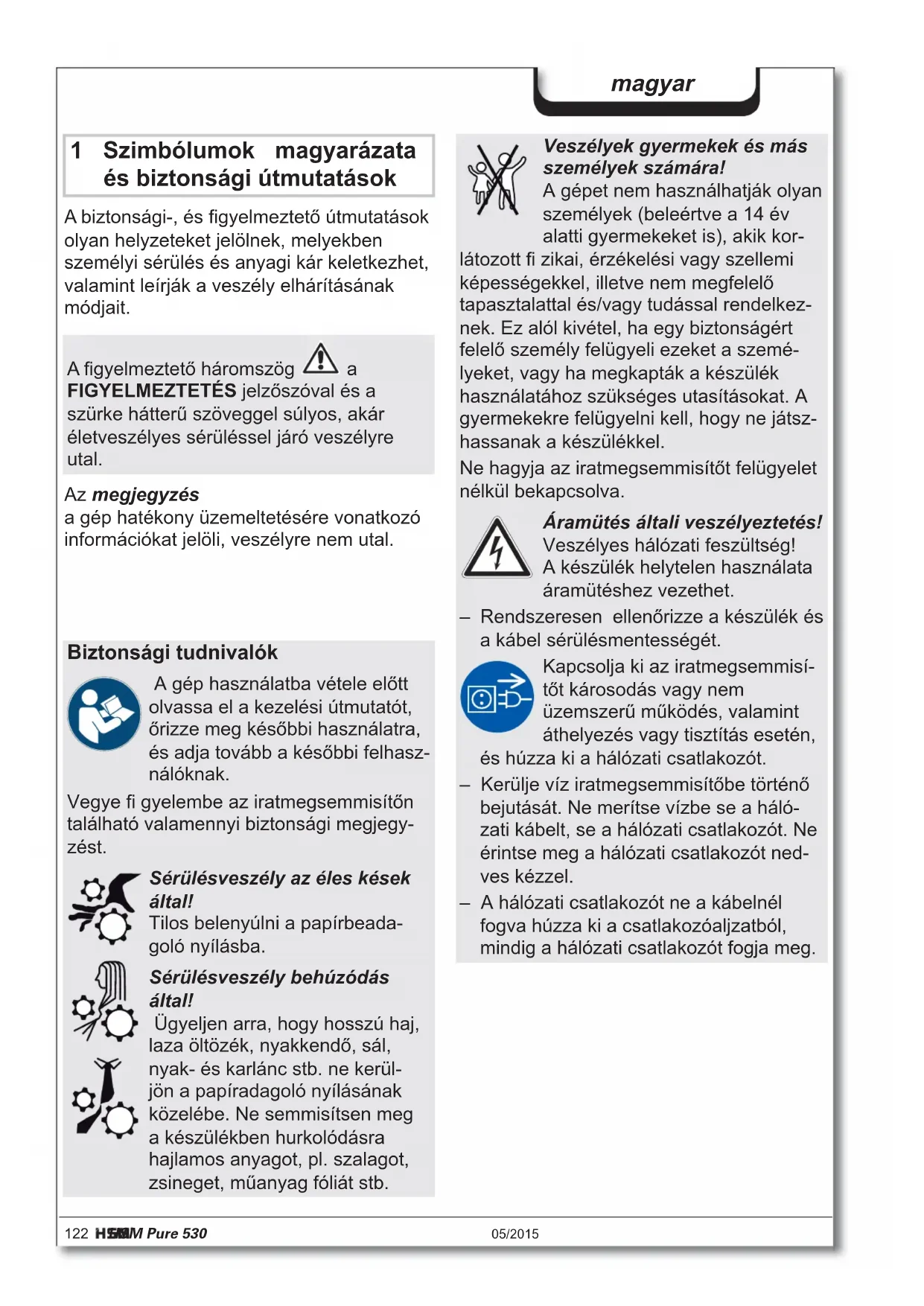 Teža (kg) 27,2 29,5 29,7 Hitrost rezanja 65 mm/s Delovna širina 300 mm Priključek 230 V, 50 Hz 120 V, 60 Hz 220 V, 60 Hz Moč maks. 500 W Način obratovanja Neprekinjeno obratovanje Pogoji okolice med obratovanjem: Temperatura relativna vlažnost zraka nadmorska višina -10 °C do +25 °C maks. 90 %, se ne kondenzira maks. 2.000 m Dimenzije DxŠxV (mm) 497 x 362 x 716 Prostornina sprejemne posode 80 l Emisija hrupa (Prosti tek / pod obremenitvijo) < 55 dB (A) / < 60 dB (A)122 HSM Pure 530 05/2015 magyar 1 Szimbólumok magyarázata és biztonsági útmutatások A biztonsági-, és fi gyelmeztető útmutatások olyan helyzeteket jelölnek, melyekben személyi sérülés és anyagi kár keletkezhet, valamint leírják a veszély elhárításának módjait. Az megjegyzés a gép hatékony üzemeltetésére vonatkozó információkat jelöli, veszélyre nem utal. A fi gyelmeztető háromszög a FIGYELMEZTETÉS jelzőszóval és a szürke hátterű szöveggel súlyos, akár életveszélyes sérüléssel járó veszélyre utal. Biztonsági tudnivalók A gép használatba vétele előtt olvassa el a kezelési útmutatót, őrizze meg későbbi használatra, és adja tovább a későbbi felhasz- nálóknak. Vegye fi gyelembe az iratmegsemmisítőn található valamennyi biztonsági megjegy- zést. Sérülésveszély az éles kések által! Tilos belenyúlni a papírbeada- goló nyílásba. Sérülésveszély behúzódás által! Ügyeljen arra, hogy hosszú haj, laza öltözék, nyakkendő, sál, nyak- és karlánc stb. ne kerül- jön a papíradagoló nyílásának közelébe. Ne semmisítsen meg a készülékben hurkolódásra hajlamos anyagot, pl. szalagot, zsineget, műanyag fóliát stb. Veszélyek gyermekek és más személyek számára! A gépet nem használhatják olyan személyek (beleértve a 14 év alatti gyermekeket is), akik kor- látozott fi zikai, érzékelési vagy szellemi képességekkel, illetve nem megfelelő tapasztalattal és/vagy tudással rendelkez- nek. Ez alól kivétel, ha egy biztonságért felelő személy felügyeli ezeket a szemé- lyeket, vagy ha megkapták a készülék használatához szükséges utasításokat. A gyermekekre felügyelni kell, hogy ne játsz- hassanak a készülékkel. Ne hagyja az iratmegsemmisítőt felügyelet nélkül bekapcsolva. Áramütés általi veszélyeztetés! Veszélyes hálózati feszültség! A készülék helytelen használata áramütéshez vezethet. – Rendszeresen ellenőrizze a készülék és a kábel sérülésmentességét. Kapcsolja ki az iratmegsemmisí- tőt károsodás vagy nem üzemszerű működés, valamint áthelyezés vagy tisztítás esetén, és húzza ki a hálózati csatlakozót. – Kerülje víz iratmegsemmisítőbe történő bejutását. Ne merítse vízbe se a háló- zati kábelt, se a hálózati csatlakozót. Ne érintse meg a hálózati csatlakozót ned- ves kézzel. – A hálózati csatlakozót ne a kábelnél fogva húzza ki a csatlakozóaljzatból, mindig a hálózati csatlakozót fogja meg.05/2015 HSM Pure 530 123 magyar 2 Rendeltetésszerű használat, garancia 3 Áttekintés 1 Ajtó 2 Biztonsági tudnivalók 3 Fénysorompó 4 Kezelő- és kijelzőegység 5 Biztonsági elem 6 Adattábla 7 Hálózati kapcsoló
