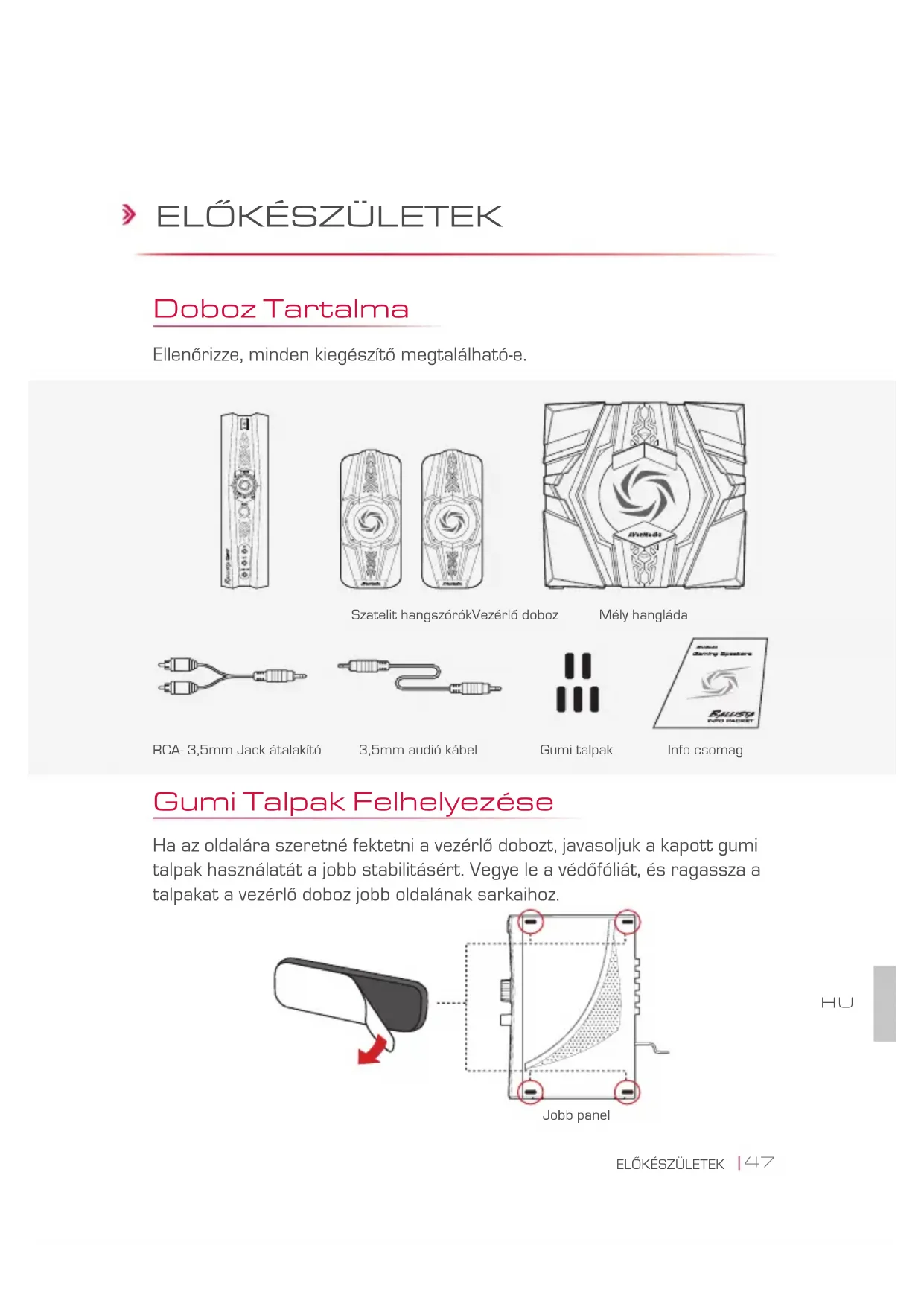 Doboz Tartalma Ellenőrizze, minden kiegészítő megtalálható-e. Mély hangláda RCA- 3,5mm Jack átalakító Gumi Talpak Felhelyezése Ha az oldalára szeretné fektetni a vezérlő dobozt, javasoljuk a kapott gumi talpak használatát a jobb stabilitásért. Vegye le a védőfóliát, és ragassza a talpakat a vezérlő doboz jobb oldalának sarkaihoz. Info csomag Szatelit hangszórókVezérlő doboz 3,5mm audió kábel Jobb panel Gumi talpak HU48