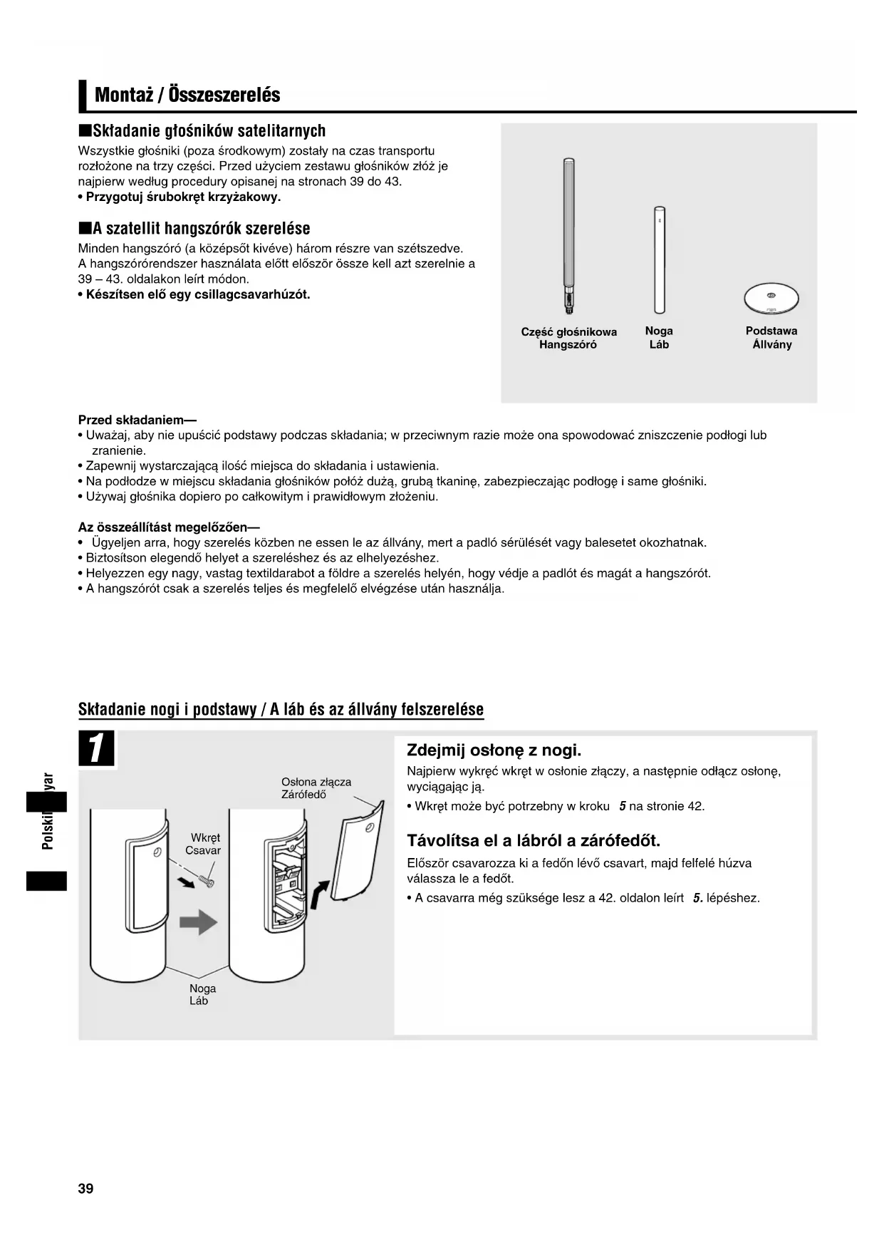 - Biztosítson elegendŒ helyet a szereléshez és az elhelyezéshez.• Helyezzen egy nagy, vastag textildarabot a földre a szerelés helyén, hogy védje a padlót és magát a hangszórót.• A hangszórót csak a szerelés teljes és megfelelŒ elvégzése után használja. Zdejmij os∏on´ z nogi. Najpierw wykr´ç wkr´t w os∏onie z∏àczy, a nast´pnie od∏àcz os∏on´,wyciàgajàc jà.• Wkr´t mo˝e byç potrzebny w kroku na stronie 42. Távolítsa el a lábról a zárófedŒt. ElŒször csavarozza ki a fedŒn lévŒ csavart, majd felfelé húzvaválassza le a fedŒt.• A csavarra még szüksége lesz a 42. oldalon leírt . lépéshez. 7 Sk∏adanie g∏oÊników satelitarnych Wszystkie g∏oÊniki (poza Êrodkowym) zosta∏y na czas transporturoz∏o˝one na trzy cz´Êci. Przed u˝yciem zestawu g∏oÊników z∏ó˝ jenajpierw wed∏ug procedury opisanej na stronach 39 do 43.• Przygotuj Êrubokr´t krzy˝akowy. 7 A szatellit hangszórók szerelése Minden hangszóró (a középsŒt kivéve) három részre van szétszedve.A hangszórórendszer használata elŒtt elŒször össze kell azt szerelnie a39 – 43. oldalakon leírt módon.• Készítsen elŒ egy csillagcsavarhúzót.