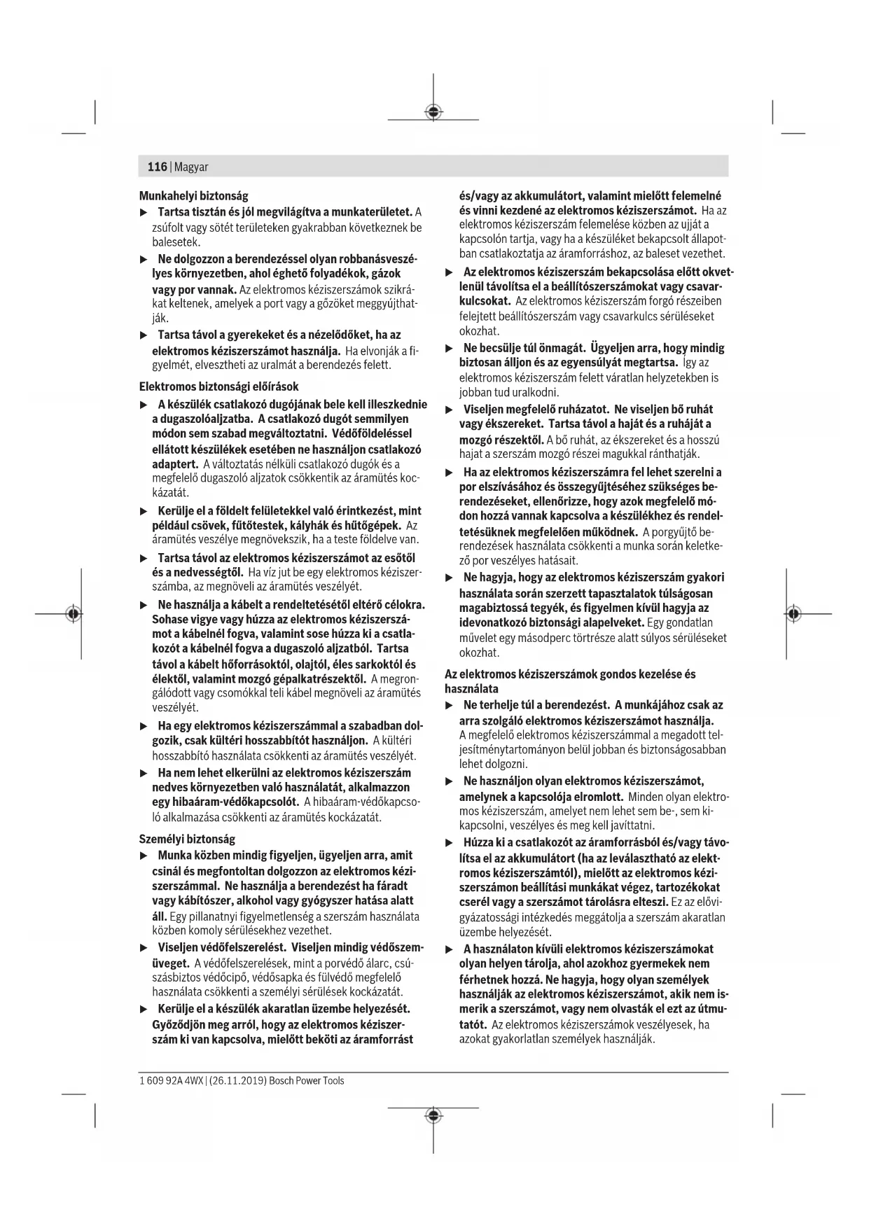 Vysoký rozsah otáčok; vhodný na práce smalým vŕtacím priemerom. Tepelná ochrana proti preťaženiu Pri používaní vsúlade surčením sa elektrické náradie nemô- že preťažiť. Pri nadmernom zaťažení alebo prekročení prípustného rozsahu teploty akumulátora sa znížia otáčky. Elektrické náradie bude znova bežať splnými otáčkami až po dosiahnutí prípustnej teploty akumulátora. Tepelná ochrana proti preťaženiu je signalizovaná červeným svietením LED kontrolky (11) na elektrickom náradí. Keď LED kontrolka (11) zhasne, dosiahol akumulátor náradia opäť prípustnú teplotu. Ochrana proti úplnému vybitiu akumulátora Lítiovo-iónový akumulátor je vďaka „Electronic Cell Protecti- on (ECP)“ chránený proti hlbokému vybitiu. Keď je akumulá- tor vybitý, elektrické náradie sa pomocou ochranného obvo- du vypne: Pracovný nástroj sa už nepohybuje. Rýchle vypnutie (Kickback Control) Rýchle vypnutie (KickBack Control) posky- tuje lepšiu kontrolu nad elektrickým nára- dím, čím zvyšuje ochranu používateľa vporovnaní siným elektrickým náradím bez funkcie KickBack Control. Pri náhlej anepredvídateľnej rotácii elektrického náradia okolo osi vŕtania sa elektric- ké náradie vypne. Rýchle vypnutie je indikované blikaním LED kontrolky na elektrickom náradí. 1 609 92A 4WX | (26.11.2019) Bosch Power ToolsMagyar | 115 Na opätovné uvedenie do prevádzky uvoľnite vypínač aznova ho stlačte. u Ak je funkcia Kickback Control chybná, elektrické náradie sa nedá zapnúť. Opravu elektrického náradia zverte len kvalifikovanému odbornému personálu, ktorý používa len originálne náhradné diely. Upozornenia týkajúce sa práce u Na skrutku prikladajte elektrické náradie iba vo vy- pnutom stave. Otáčajúce sa pracovné nástroje by sa mohli zošmyknúť. Na odstránenie skrutkovacieho hrotu alebo univerzálneho držiaka hrotov sa smie použiť pomocný nástroj. Spona na opasok Pomocou spony na opasok si môžete zavesiť elektrické nára- die napr. na opasok. Vtakom prípade budete mať obe ruky voľné aelektrické náradie budete mať stále vpohotovosti. Farebná spona (pozri obrázok D) Pomocou farebnej spony (6) môžete elektrické náradie indi- viduálne označiť. Údržba aservis Údržba ačistenie u Pred všetkými prácami na elektrickom náradí (naprí- klad údržba, výmena nástroja apodobne), ako aj pri jeho preprave auskladnení vyberte akumulátor zelektrického náradia. Vprípade neúmyselného aktivo- vania vypínača hrozí nebezpečenstvo poranenia. u Elektrické náradie ajeho vetracie štrbiny udržiavajte vždy včistote, aby ste mohli pracovať dobre abezpeč- ne. Zákaznícka služba aporadenstvo ohľadom použitia Servisné stredisko Vám odpovie na otázky týkajúce sa opravy aúdržby Vášho produktu ako aj náhradných dielov. Rozkladové výkresy ainformácie onáhradných dieloch náj- dete tiež na: www.bosch-pt.com Vprípade otázok týkajúcich sa našich výrobkov apríslušen- stva Vám ochotne pomôže poradenský tím Bosch. Vprípade akýchkoľvek otázok aobjednávok náhradných dielov uvádzajte bezpodmienečne 10‑miestne vecné číslo uvedené na typovom štítku výrobku. Slovakia Na www.bosch-pt.sk si môžete objednať opravu vášho stroja alebo náhradné diely online. Tel.: +421 2 48 703 800 Fax: +421 2 48 703 801 E-Mail: servis.naradia@sk.bosch.com www.bosch-pt.sk Transport Priložené lítiovo-iónové akumulátory podliehajú požiadav- kám na transport nebezpečného nákladu. Tieto akumulátory smie používateľ náradia prepravovať po cestách bez ďalších opatrení. Pri zasielaní tretími osobami (napr.: leteckou dopravou alebo prostredníctvom špedície) treba rešpektovať osobitné požiadavky na obaly aoznačenie. Vtakomto prípade treba pri príprave zásielky bezpodmienečne konzultovať sodborní- kom na prepravu nebezpečného tovaru. Akumulátory zasielajte iba vtedy, ak nemajú poškodený obal. Otvorené kontakty prelepte aakumulátor zabaľte tak, aby sa vobale nemohol posúvať. Rešpektujte aj prípadné doplňujú- ce národné predpisy. Likvidácia Ručné elektrické náradie, príslušenstvo a obal treba dať na recykláciu zodpovedajúcu ochrane životného prostredia. Neodhadzujte ručné elektrické náradie ani aku- mulátory/batérie do komunálneho odpadu! Len pre krajinyEÚ: Podľa Európskej smernice 2012/19/EÚ sa musí nepoužiteľ- né elektrické náradie apodľa európskej smernice 2006/66/ ES sa musia poškodené alebo opotrebované akumulátory/ batérie zbierať separovane atreba ich dávať na recykláciu vsúlade sochranou životného prostredia. Akumulátory/batérie: Li-Ion: Dodržujte pokyny uvedené včasti Transport (pozri „Trans- port“, Stránka115). Magyar Biztonsági tájékoztató Általános biztonsági előírások az elektromos kéziszerszámok számára FIGYELMEZ- TETÉS Olvassa el valamennyi biztonsági tájékoztatót, előírást, illusztrációt és adatot, amelyet az elektromos kéziszerszámmal együtt megkapott. Az alábbiakban felso- rolt előírások betartásának elmulasztása áramütéshez, tűz- höz és/vagy súlyos testi sérülésekhez vezethet. Kérjük a későbbi használatra gondosan őrizze meg eze- ket az előírásokat. Az alább alkalmazott "elektromos kéziszerszám" fogalom a hálózati elektromos kéziszerszámokat (hálózati csatlakozó kábellel) és az akkumulátoros elektromos kéziszerszámokat (hálózati csatlakozó kábel nélkül) foglalja magában. Bosch Power Tools 1 609 92A 4WX | (26.11.2019)116 | Magyar Munkahelyi biztonság u Tartsa tisztán és jól megvilágítva a munkaterületet. A zsúfolt vagy sötét területeken gyakrabban következnek be balesetek. u Ne dolgozzon a berendezéssel olyan robbanásveszé- lyes környezetben, ahol éghető folyadékok, gázok vagy por vannak. Az elektromos kéziszerszámok szikrá- kat keltenek, 
