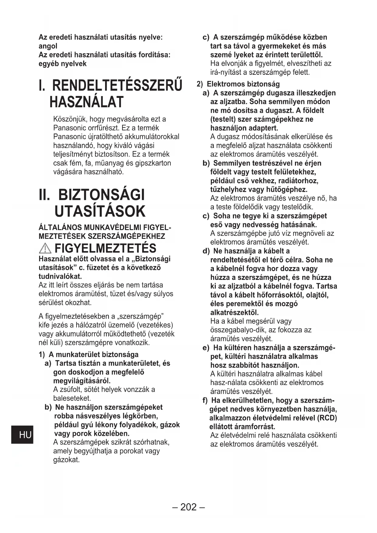 HASZNÁLAT Köszönjük, hogy megvásárolta ezt a Panasonic orrfűrészt. Ez a termék Panasonic újratölthető akkumulátorokkal használandó, hogy kiváló vágási teljesítményt biztosítson. Ez a termék csak fém, fa, műanyag és gipszkarton vágására használható.