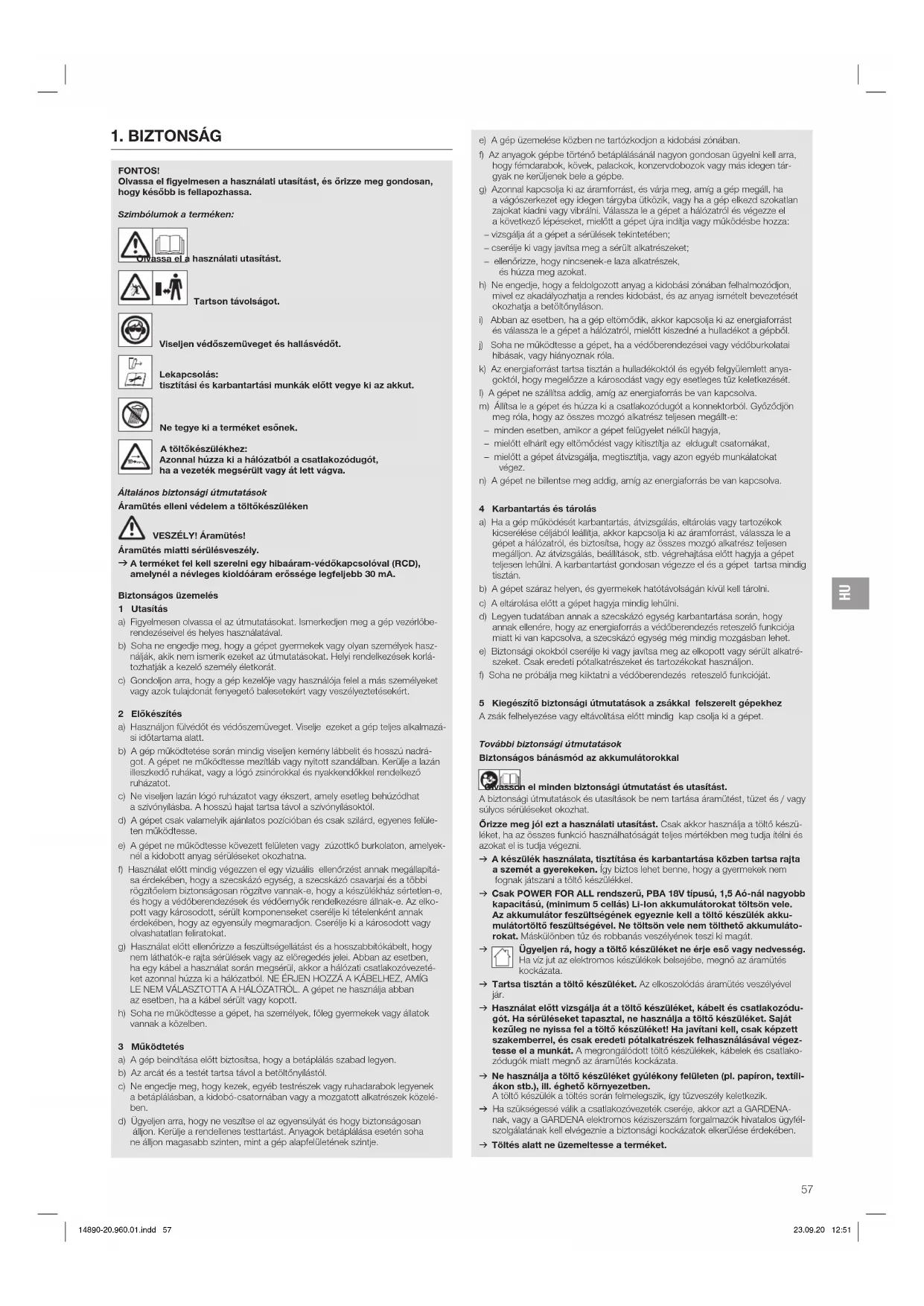 m) Állítsa le a gépet és húzza ki a csatlakozódugót a konnektorból. Győződjön meg róla, hogy az összes mozgó alkatrész teljesen megállt-e: – minden esetben, amikor a gépet felügyelet nélkül hagyja, – mielőtt elhárít egy eltömődést vagy kitisztítja az eldugult csatornákat, – mielőtt a gépet átvizsgálja, megtisztítja, vagy azon egyéb munkálatokat végez. n) A gépet ne billentse meg addig, amíg az energiaforrás be van kapcsolva. 4 Karbantartás és tárolás a) Ha a gép működését karbantartás, átvizsgálás, eltárolás vagy tartozékok kicserélése céljából leállítja, akkor kapcsolja ki az áramforrást, válassza le a gépet a hálózatról, és biztosítsa, hogy az összes mozgó alkatrész teljesen megálljon. Az átvizsgálás, beállítások, stb. végrehajtása előtt hagyja a gépet teljesen lehűlni. A karbantartást gondosan végezze el és a gépet tartsa mindig tisztán. b) A gépet száraz helyen, és gyermekek hatótávolságán kívül kell tárolni. c) A eltárolása előtt a gépet hagyja mindig lehűlni. d) Legyen tudatában annak a szecskázó egység karbantartása során, hogy annak ellenére, hogy az energiaforrás a védőberendezés reteszelő funkciója miatt ki van kapcsolva, a szecskázó egység még mindig mozgásban lehet. e) Biztonsági okokból cserélje ki vagy javítsa meg az elkopott vagy sérült alkatré- szeket. Csak eredeti pótalkatrészeket és tartozékokat használjon. f) Soha ne próbálja meg kiiktatni a védőberendezés reteszelő funkcióját. 5 Kiegészítő biztonsági útmutatások a zsákkal felszerelt gépekhez A zsák felhelyezése vagy eltávolítása előtt mindig kap csolja ki a gépet. További biztonsági útmutatások Biztonságos bánásmód az akkumulátorokkal Olvasson el minden biztonsági útmutatást és utasítást. A biztonsági útmutatások és utasítások be nem tartása áramütést, tüzet és / vagy súlyos sérüléseket okozhat. Őrizze meg jól ezt a használati utasítást. Csak akkor használja a töltő készü- léket, ha az összes funkció használhatóságát teljes mértékben meg tudja ítélni és azokat el is tudja végezni. v A készülék használata, tisztítása és karbantartása közben tartsa rajta a szemét a gyerekeken. Így biztos lehet benne, hogy a gyermekek nem fognak játszani a töltő készülékkel. v Csak POWER FOR ALL rendszerű, PBA 18V típusú, 1,5 Aó-nál nagyobb kapacitású, (minimum 5 cellás) Li-Ion akkumulátorokat töltsön vele. Az akkumulátor feszültségének egyeznie kell a töltő készülék akku- mulátortöltő feszültségével. Ne töltsön vele nem tölthető akkumuláto- rokat. Máskülönben tűz és robbanás veszélyének teszi ki magát.