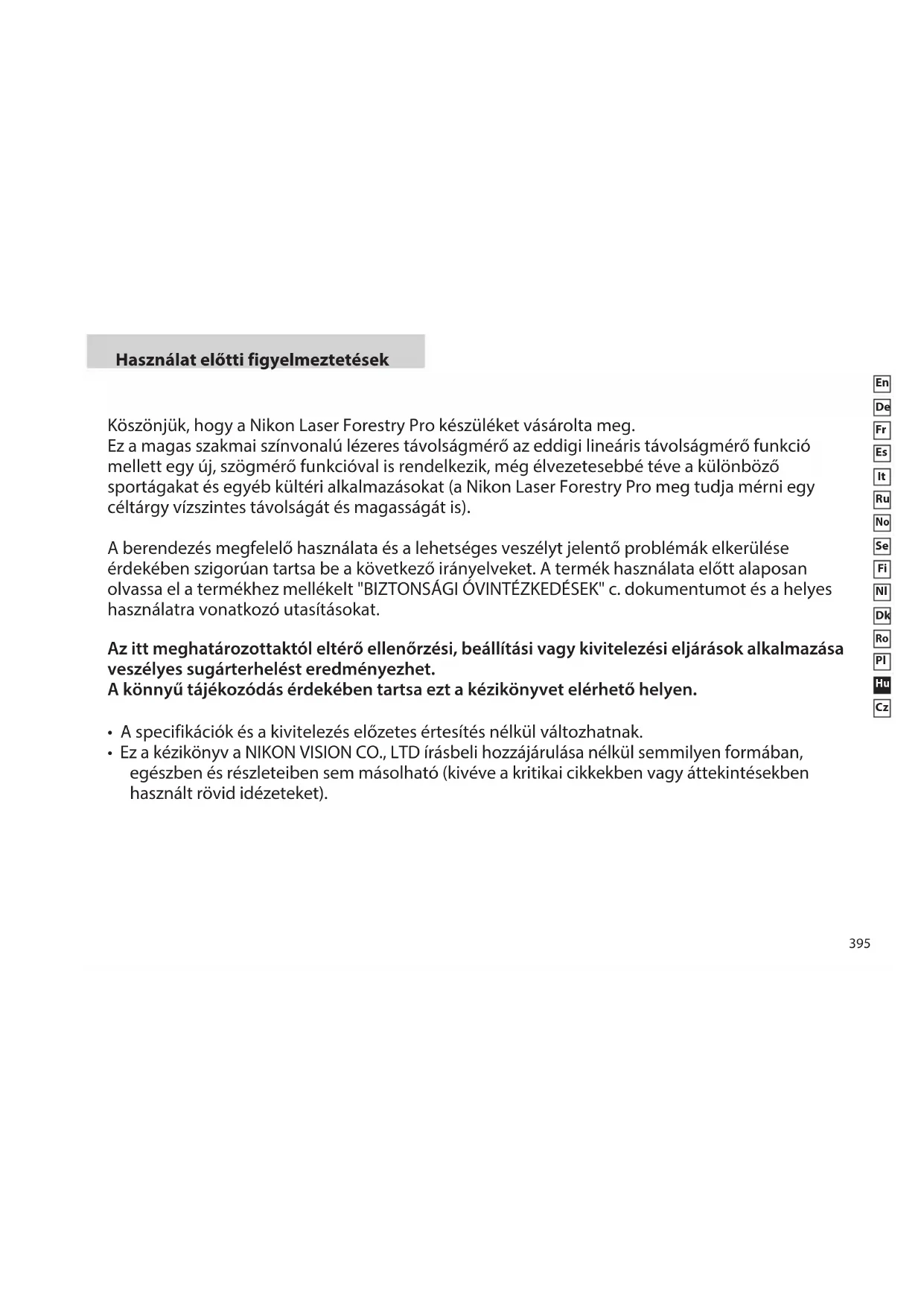 Használat előtti figyelmeztetések Köszönjük, hogy a Nikon Laser Forestry Pro készüléket vásárolta meg. Ez a magas szakmai színvonalú lézeres távolságmérő az eddigi lineáris távolságmérő funkció mellett egy új, szögmérő funkcióval is rendelkezik, még élvezetesebbé téve a különböző sportágakat és egyéb kültéri alkalmazásokat (a Nikon Laser Forestry Pro meg tudja mérni egy céltárgy vízszintes távolságát és magasságát is). A berendezés megfelelő használata és a lehetséges veszélyt jelentő problémák elkerülése érdekében szigorúan tartsa be a következő irányelveket. A termék használata előtt alaposan olvassa el a termékhez mellékelt "BIZTONSÁGI ÓVINTÉZKEDÉSEK" c. dokumentumot és ahelyes használatra vonatkozó utasításokat. Az itt meghatározottaktól eltérő ellenőrzési, beállítási vagy kivitelezési eljárások alkalmazása veszélyes sugárterhelést eredményezhet. A könnyű tájékozódás érdekében tartsa ezt a kézikönyvet elérhető helyen.