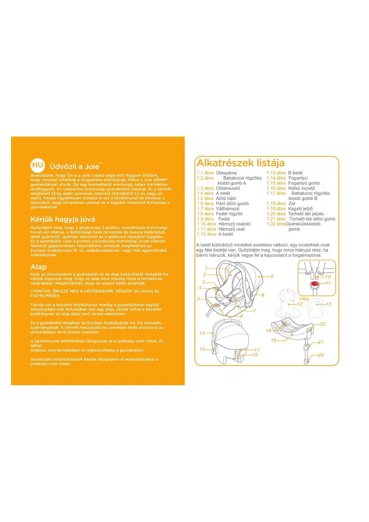 Gratulálunk, hogy Ön is a Joie család tagja lett! Nagyon örülünk, hogy részesei lehetünk a kisgyereke életútjának. Mikor a Joie GEMM™ gyereküléssel utazik, Ön egy kiemelkedő minőségű, teljes mértékben jóváhagyott, 0+ csoportos biztonsági gyerekülést használ. Ez a termék megfelelő 13 kg alatti gyerekek számára (körülbelül 1,5 év vagy az alatt). Kérjük figyelmesen olvassa el ezt a kézikönyvet és kövesse a lépéseket, hogy kényelmes utazást és a legjobb védelmet biztosítsa a gyermekének. Kérjük hagyja jóvá Győződjön meg, hogy a gépkocsija 3 pontos, visszahúzós biztonsági övvel van ellátva. A biztonsági övek tervezése és hossza különböző lehet gyártótól, gyártási dátumtól és a gépkocsi típusától függően. Ez a gyerekülés csak 3 pontos visszahúzós biztonsági övvel ellátott, felsorolt gépkocsikban használható, amelyek megfelelnek az Európai Szabályozás 16. sz. szabályozásának, vagy más egyenértékű szabványnak. Alap Ezek az útmutatások a gyerekülés és az alap használatát mutatják be. Kérjük jegyezze meg, hogy az alap nem mindig része a terméknek vásárláskor. Megtörténhet, hogy az alapot külön árusítják.! FONTOS: ŐRIZZE MEG A KÉSŐBBIEKRE. KÉRJÜK OLVASSA EL FIGYELMESEN.Tárolja ezt a kezelési kézikönyvet mindig a gyereküléssel együtt. Amennyiben már birtokában van egy alap, kérjük tartsa a kezelési kézikönyvet az alap alján levő tároló rekeszben.Ez a gyerekülés megfelel az Európai Szabályozás 44, 04 sorozatú szabványának. A termék használata és szerelése előtt olvassa el az útmutatóban lévő összes utasítást.A kézikönyvek letöltéséhez látogasson el a joiebaby.com címre, itt láthatérdekes Joie termékeket és regisztrálhatja a gyerekülést.Garanciális információkért kérjük látogasson el weboldalunkra a joiebaby.com címen.