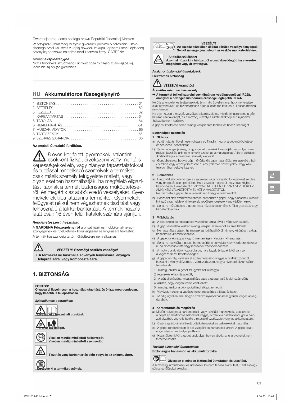 VESZÉLY! Az eszköz közelében állókat sérülés veszélye fenyegeti! Senkit ne engedjen belépni az eszköz munkaterületére. A töltőkészülékhez: Azonnal húzza ki a hálózatból a csatlakozódugót, ha a vezeték megsérült vagy át lett vágva. Általános biztonsági útmutatások Elektromos biztonság VESZÉLY! Áramütés! Áramütés miatti sérülésveszély. v A terméket fel kell szerelni egy hibaáram-védőkapcsolóval (RCD), amelynél a névleges kioldóáram erőssége legfeljebb 30 mA. Kerülje a rendellenes testtartásokat, és mindig ügyeljen arra, hogy ne veszítse el az egyensúlyát, és biztonságosan álljon a lejtős területeken is. Lassan menjen, ne rohanjon. Ne érjen hozzá a mozgó, veszélyes alkatrészekhez, mielőtt kihúzta volna a gép hálózati csatlakozóját, és a mozgó, veszélyes alkatrészek teljesen nyugalmi helyzetbe nem kerültek. A gép működtetése során mindig viseljen erős lábbelit és hosszú nadrágot. Biztonságos üzemelés 1 Oktatás a) Az útmutatást figyelmesen olvassa el. Tanulja meg jól a gép működtetését és szakszerű használatát. b) Soha ne engedje meg, hogy a gépet gyerekek használják, vagy olyan sze- mélyek kezeljék, akik nem ismerik ezeket az útmutatásokat. A helyi előírások korlátozhatják a használó személy életkorát. c) Gondoljon arra, hogy a gép működtetője vagy használója felel azokért a bal- esetekért vagy veszélyeztetésekért, amelyek más személyeknél vagy azok tulajdonában bekövetkeznek. 2 Előkészítés a) Használat előtt ellenőrizze a csatlakozó vagy hosszabbító vezetéket sérülés vagy öregedés szempontjából. Ha a vezeték megsérül használat közben, haladéktalanul válassza el a hálózattól. NE ÉRJEN HOZZÁ A VEZETÉKHEZ, AMÍG NEM VÁLASZTOTTA EL AZT A HÁLÓZATTÓL. Ne használja a gépet, ha a vezeték sérült vagy elhasználódott. b) Használat előtt szemrevételezéssel ellenőrizze a gépet, hogy nincsenek-e sérült, hiányzó vagy helytelenül felszerelt védőberendezések vagy védőlemezek. c) Soha ne működtesse a gépet, ha a közelben személyek, főleg gyerekek vagy háziállatok vannak. 3 Működtetés a) A csatlakozó és hosszabbító vezetéket tartsa távol a vágószerkezettől. b) A gép használata közben mindig viseljen szemvédőt és erős lábbelit. c) Ne használja a gépet, ha rosszak az időjárási körülmények, különösen akkor, ha fennáll a villámlás veszélye. d) A gépet csak nappal vagy jó mesterséges világításnál használja. e) Soha ne használja a gépet, ha megsérült a burkolata vagy védőberendezése, ill. ha nincs burkolata vagy nincsenek védőberendezései. f) A motort csak akkor kapcsolja be, ha a kezek és lábak kívül vannak a vágószerkezet hatótávolságán. g) A gépet mindig válassza el az áramellátástól (vagyis a csatlakozódugót húzza ki a villanyhálózatból, a zárószerkezetet vagy a kivehető akkumulátort távolítsa el)